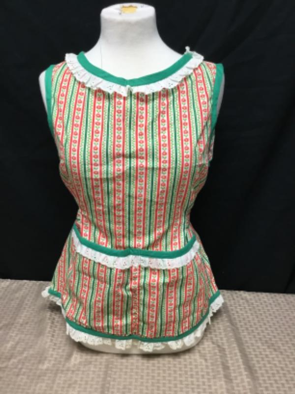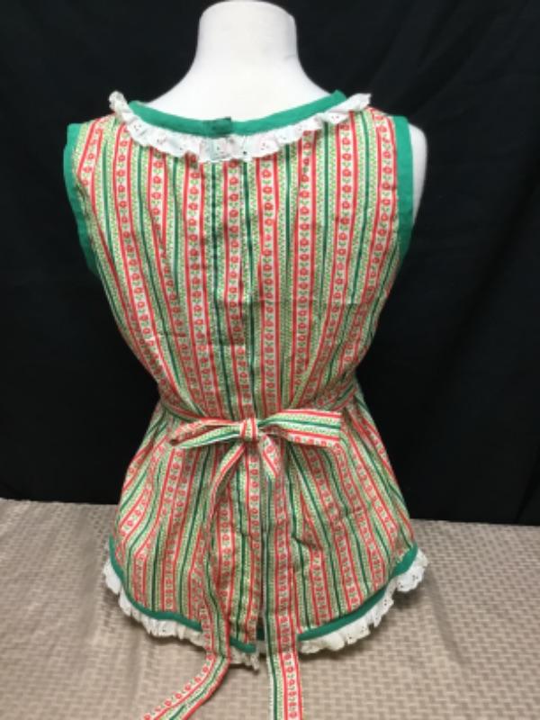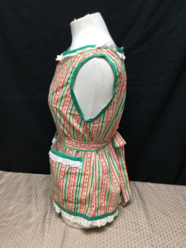 Full slip in arms apron Christmas, two pockets ruffles on neckline, pockets and hemline and ties at waist 24”l