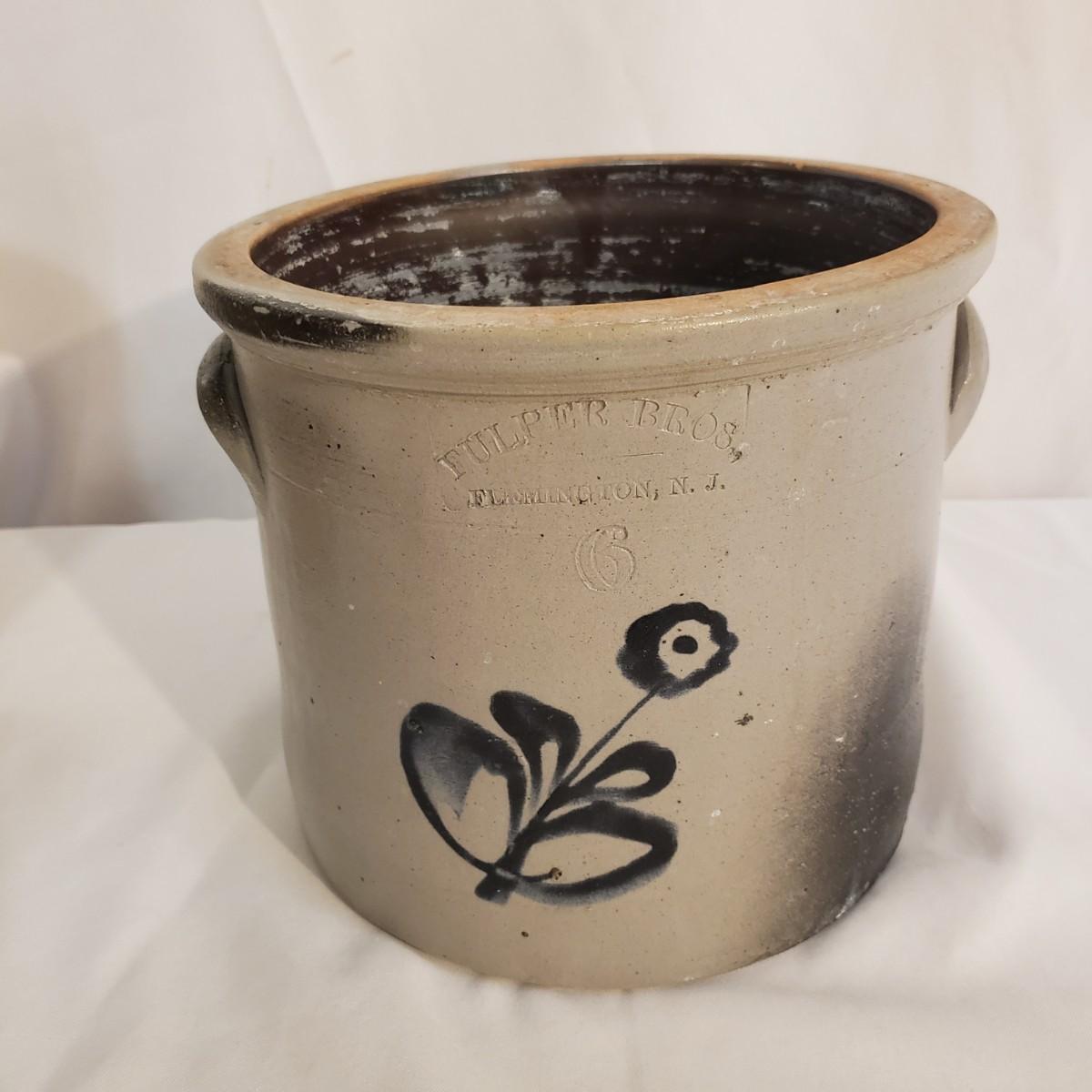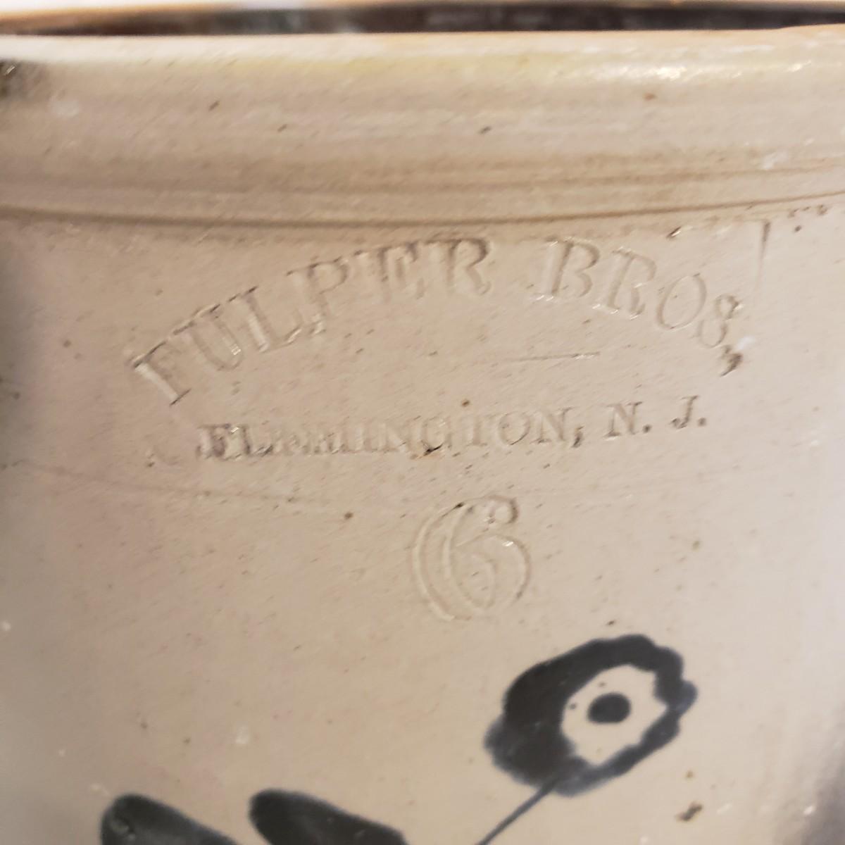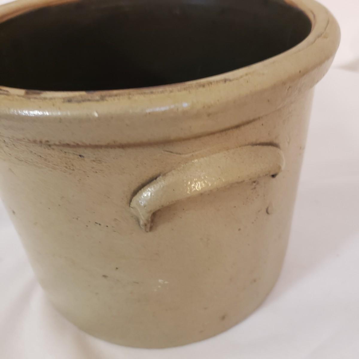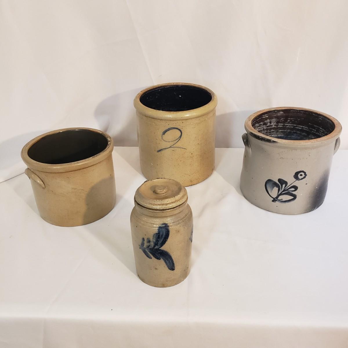 This lot has four crocks. The first one pictured has two handles and measures 8.5" x 7"H. There is a crack, shown in two pictures. The largest crock measures 9" x 9"H and has a blue decorative swirl. The Fulper Bros. Crock, stamped with a '6' and 'Flemington, NJ' measures 10" x 8"H. The last crock with a lid has three blue decorative marks and measures 5" x 8"H.