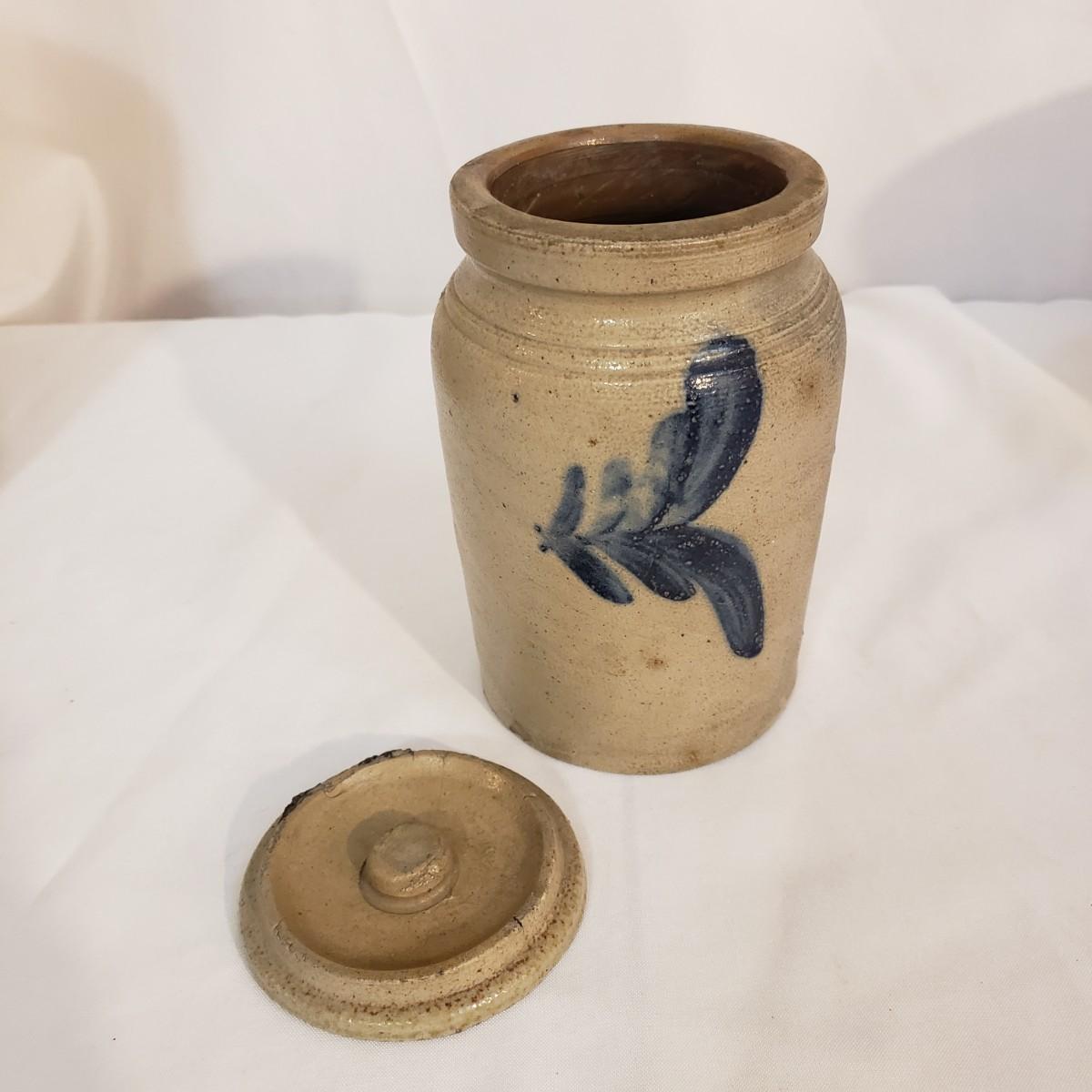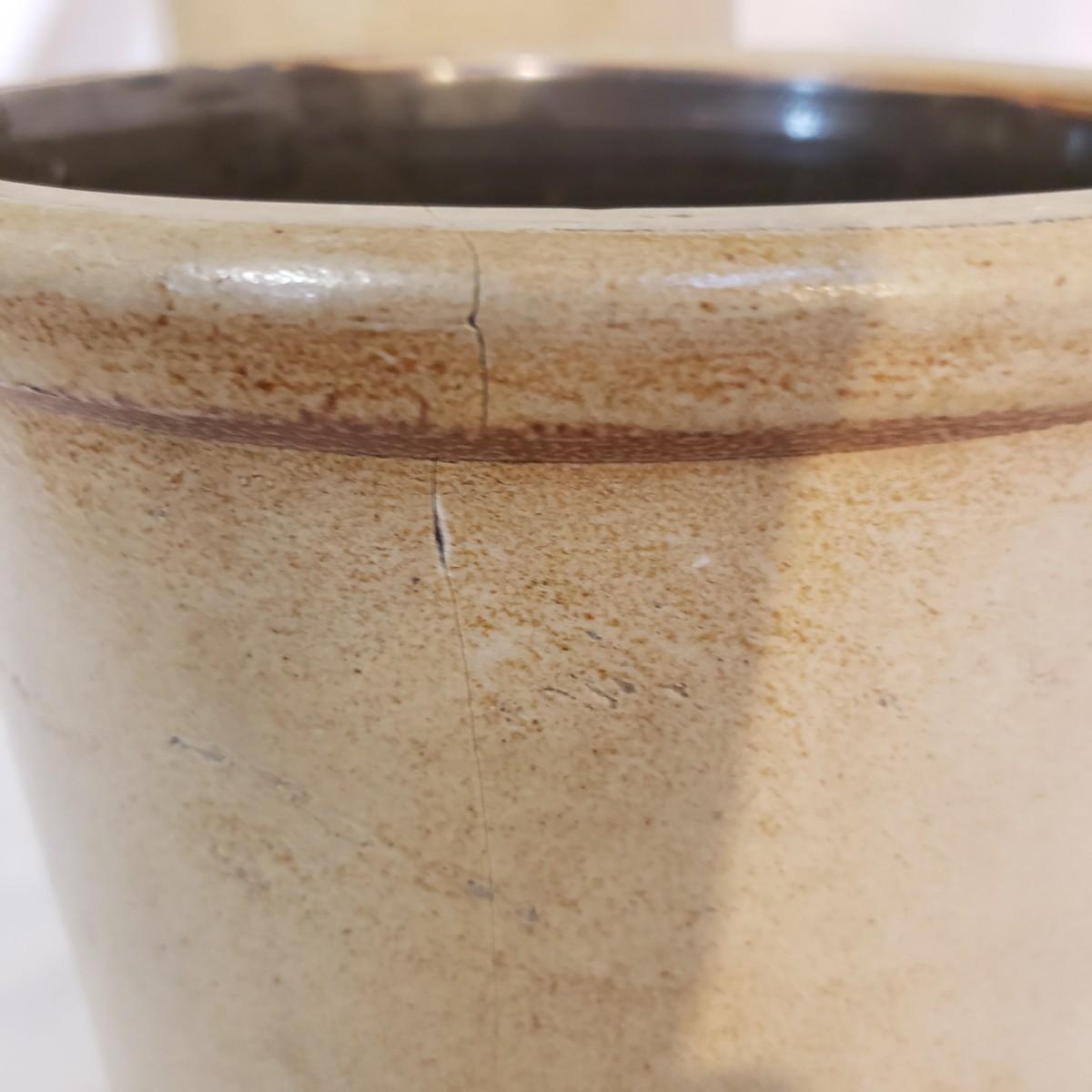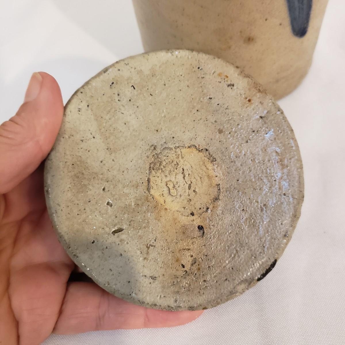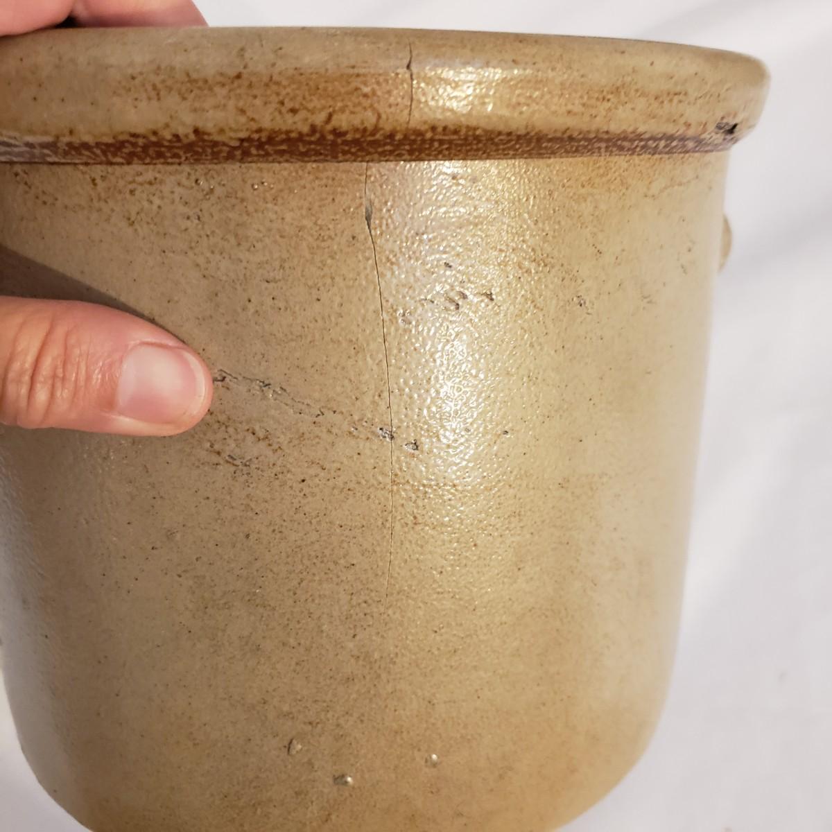 This lot has four crocks. The first one pictured has two handles and measures 8.5" x 7"H. There is a crack, shown in two pictures. The largest crock measures 9" x 9"H and has a blue decorative swirl. The Fulper Bros. Crock, stamped with a '6' and 'Flemington, NJ' measures 10" x 8"H. The last crock with a lid has three blue decorative marks and measures 5" x 8"H.