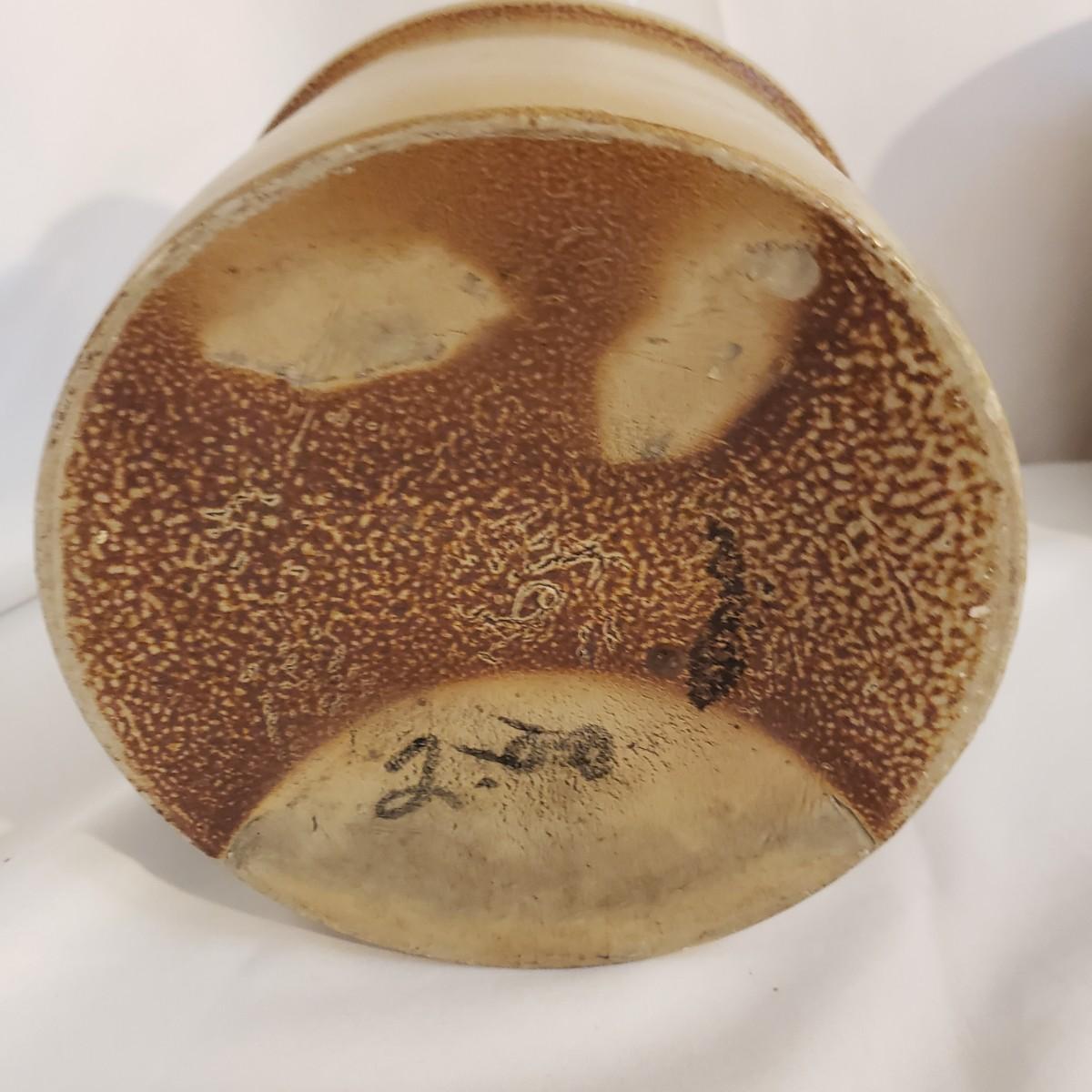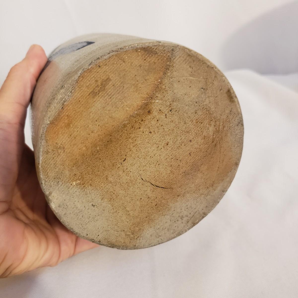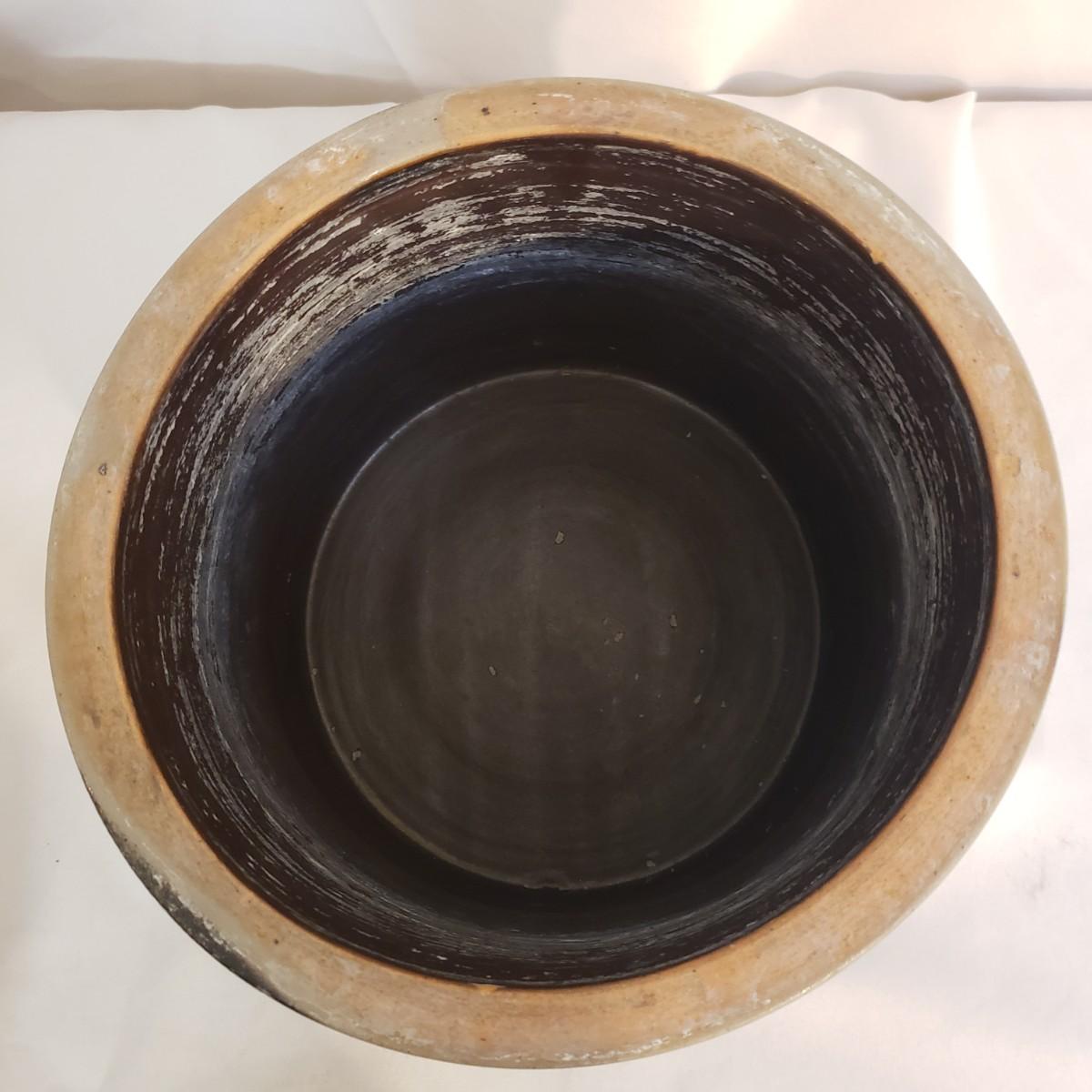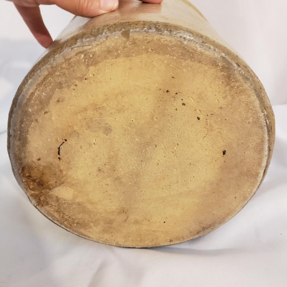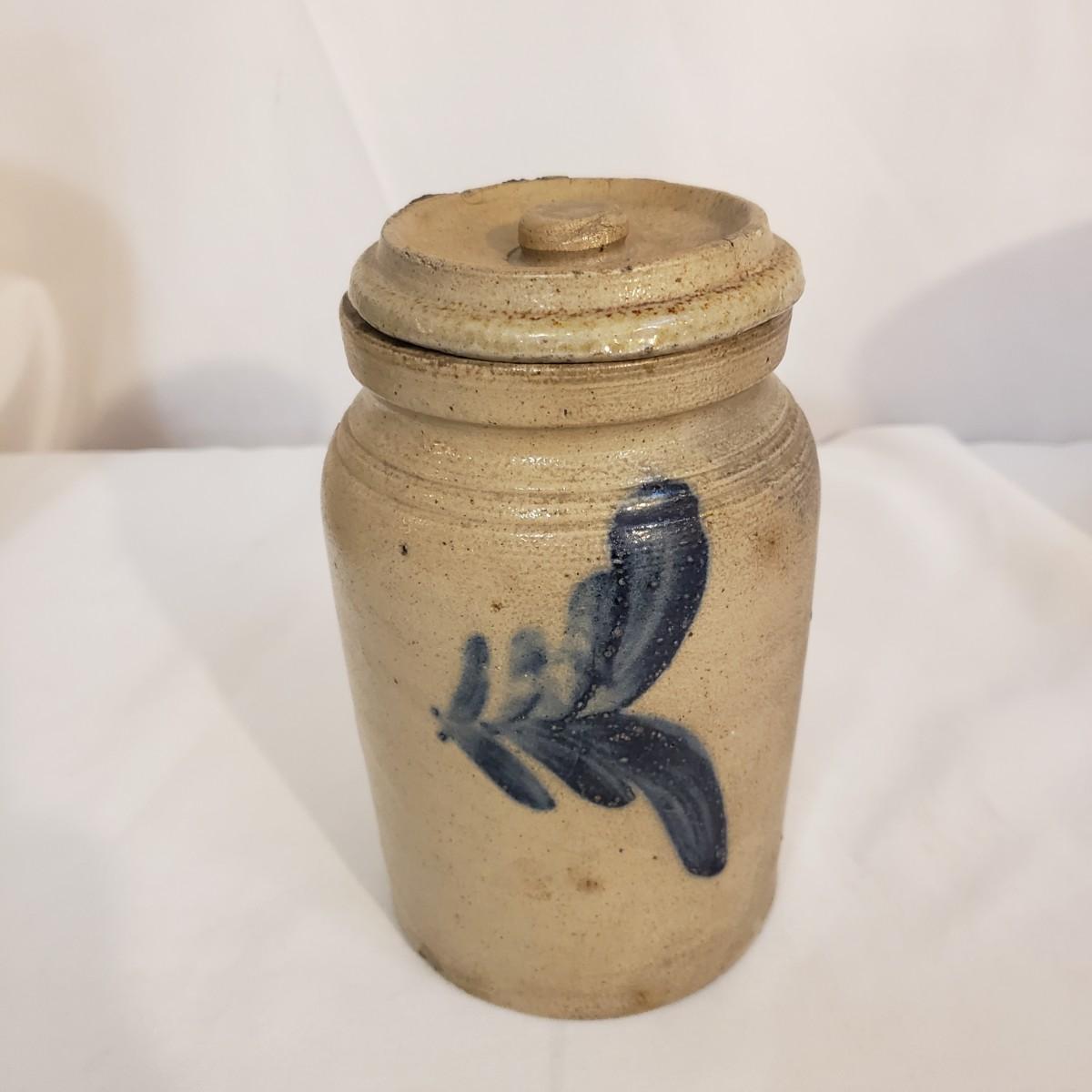 This lot has four crocks. The first one pictured has two handles and measures 8.5" x 7"H. There is a crack, shown in two pictures. The largest crock measures 9" x 9"H and has a blue decorative swirl. The Fulper Bros. Crock, stamped with a '6' and 'Flemington, NJ' measures 10" x 8"H. The last crock with a lid has three blue decorative marks and measures 5" x 8"H.