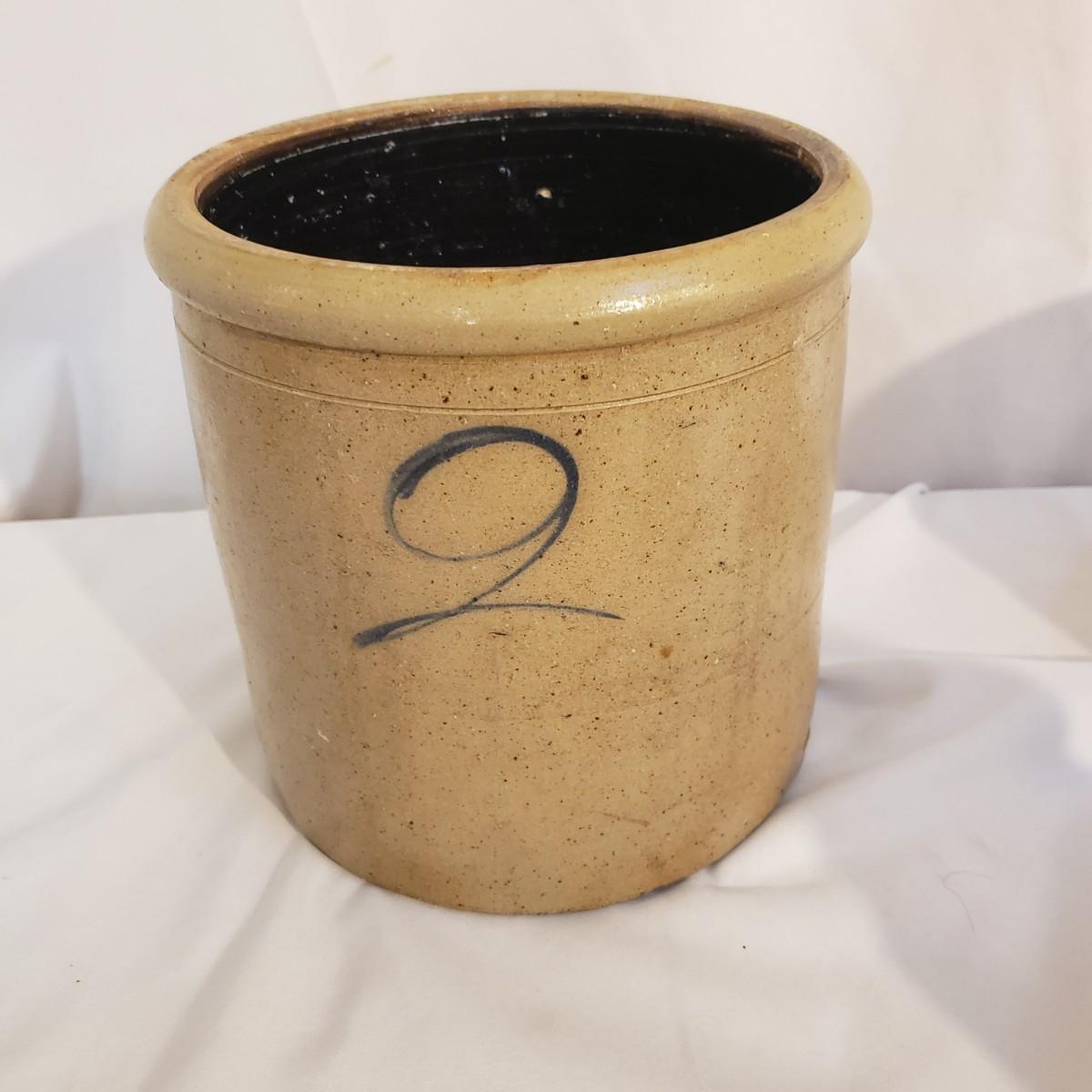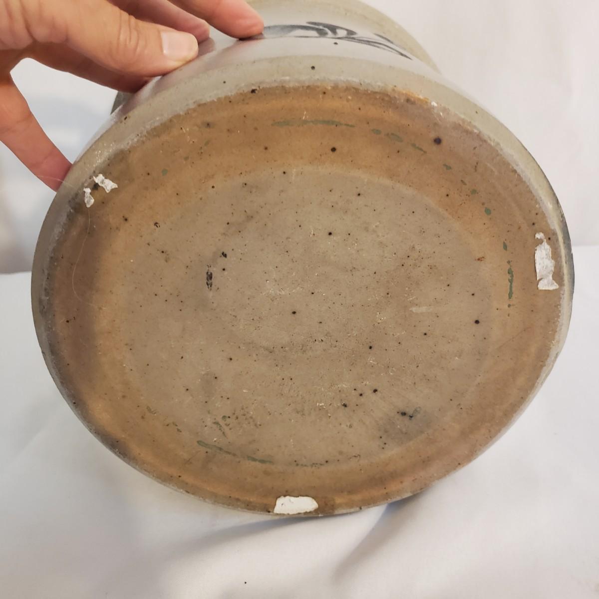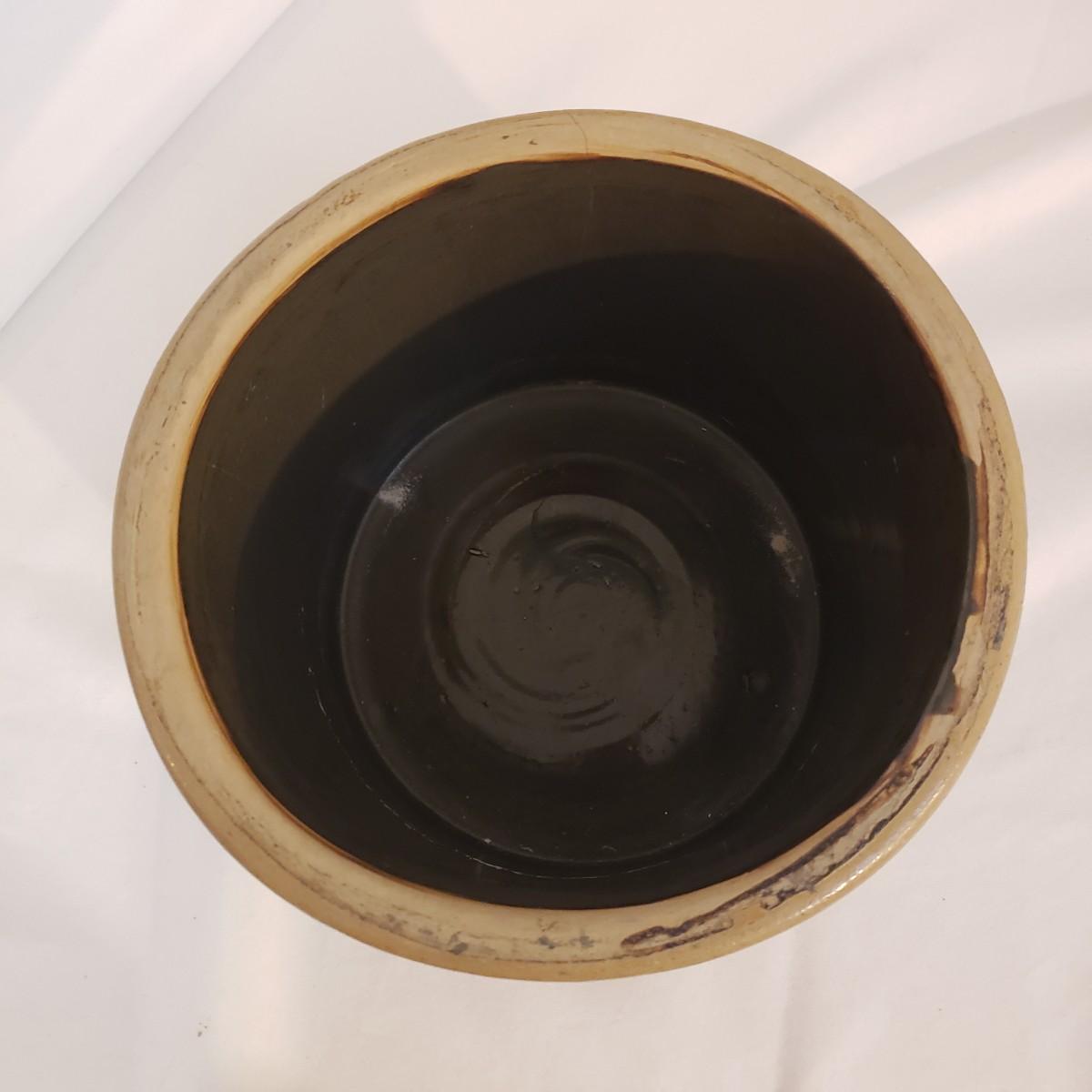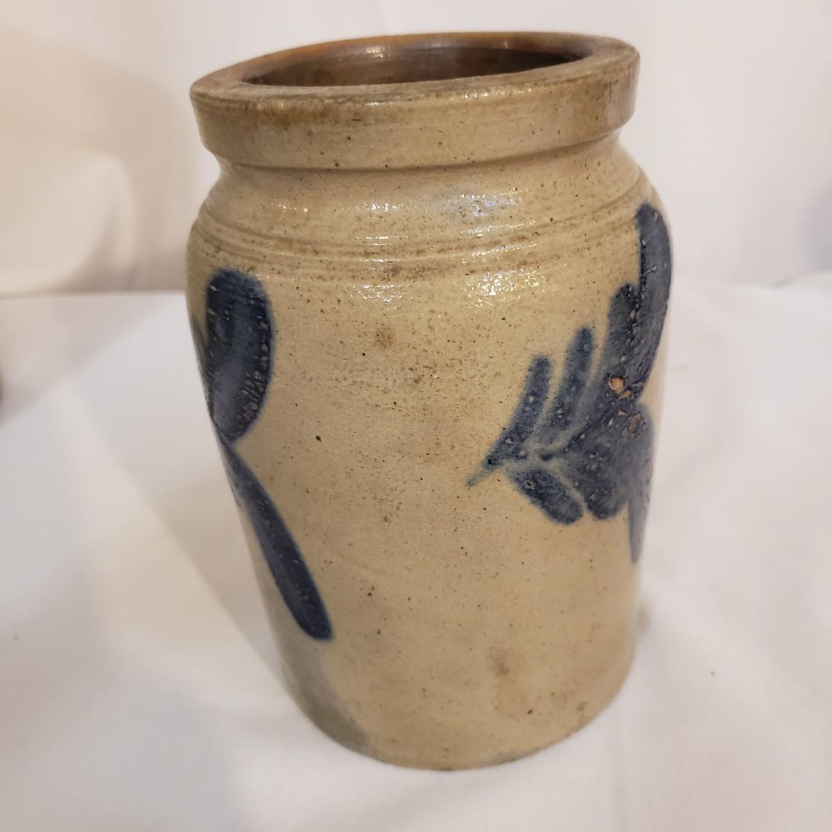 This lot has four crocks. The first one pictured has two handles and measures 8.5" x 7"H. There is a crack, shown in two pictures. The largest crock measures 9" x 9"H and has a blue decorative swirl. The Fulper Bros. Crock, stamped with a '6' and 'Flemington, NJ' measures 10" x 8"H. The last crock with a lid has three blue decorative marks and measures 5" x 8"H.