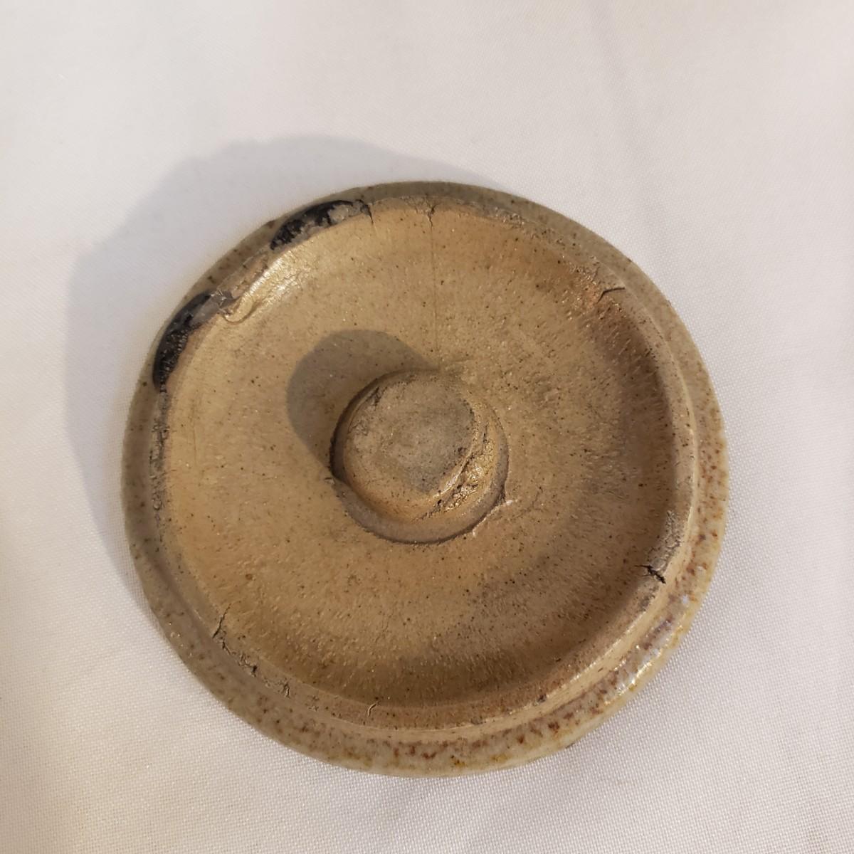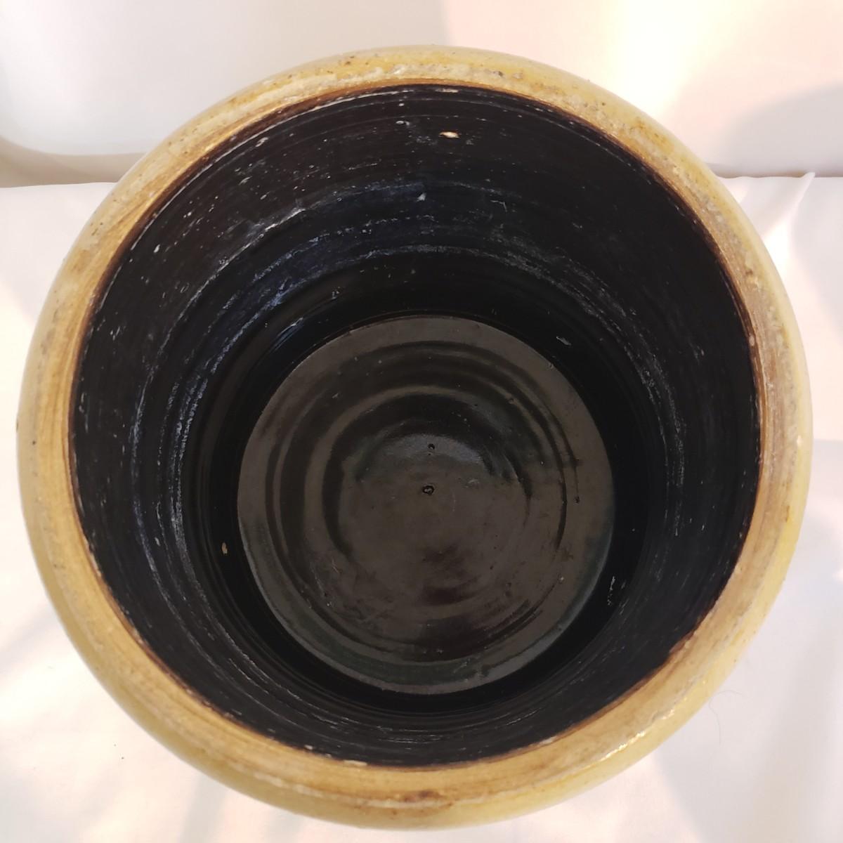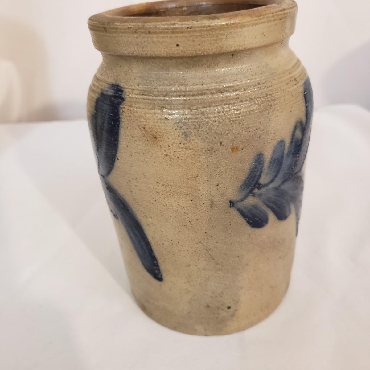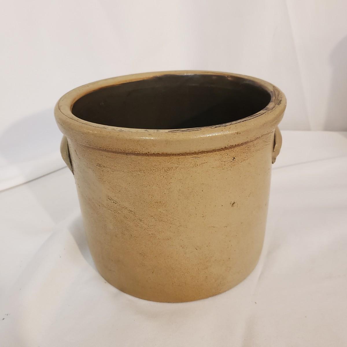 This lot has four crocks. The first one pictured has two handles and measures 8.5" x 7"H. There is a crack, shown in two pictures. The largest crock measures 9" x 9"H and has a blue decorative swirl. The Fulper Bros. Crock, stamped with a '6' and 'Flemington, NJ' measures 10" x 8"H. The last crock with a lid has three blue decorative marks and measures 5" x 8"H.