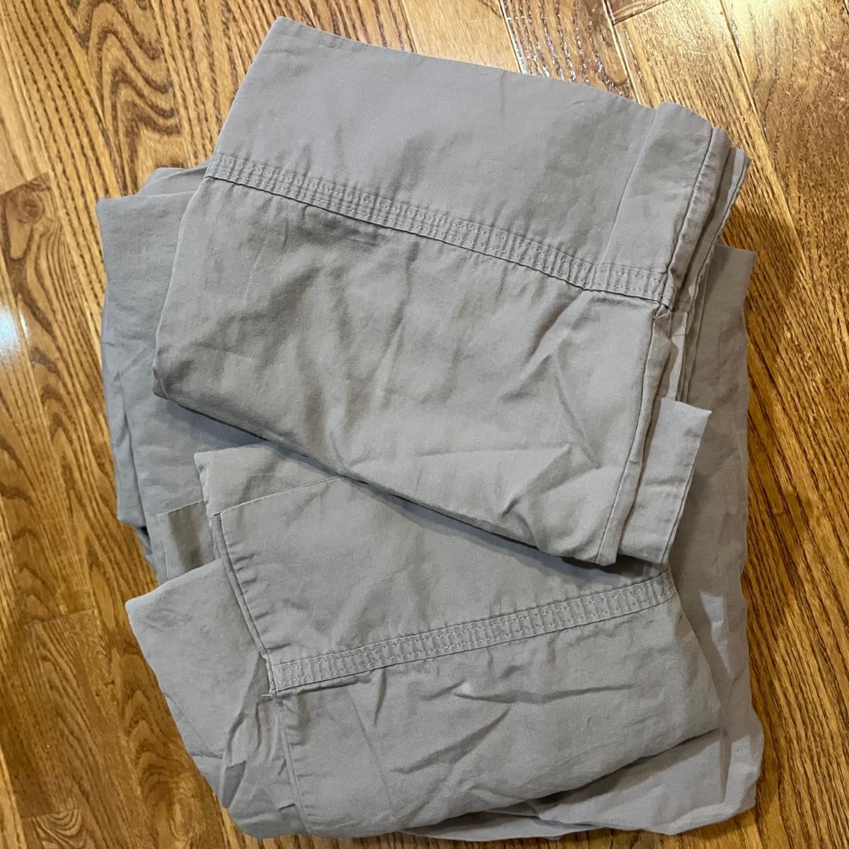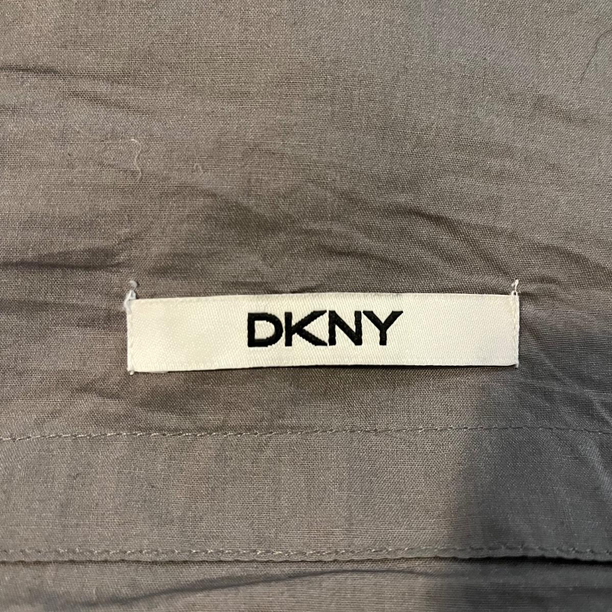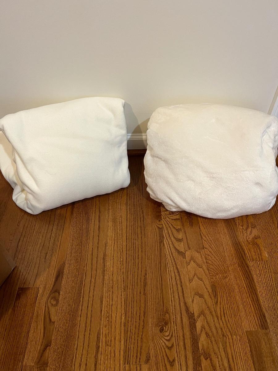 This grouping contains a DKNY F/Q duvet cover with one pillow sham, a gray sheet set with matching pillow cases, a full size Serta waterproof mattress protector and two plush cream colored blankets.