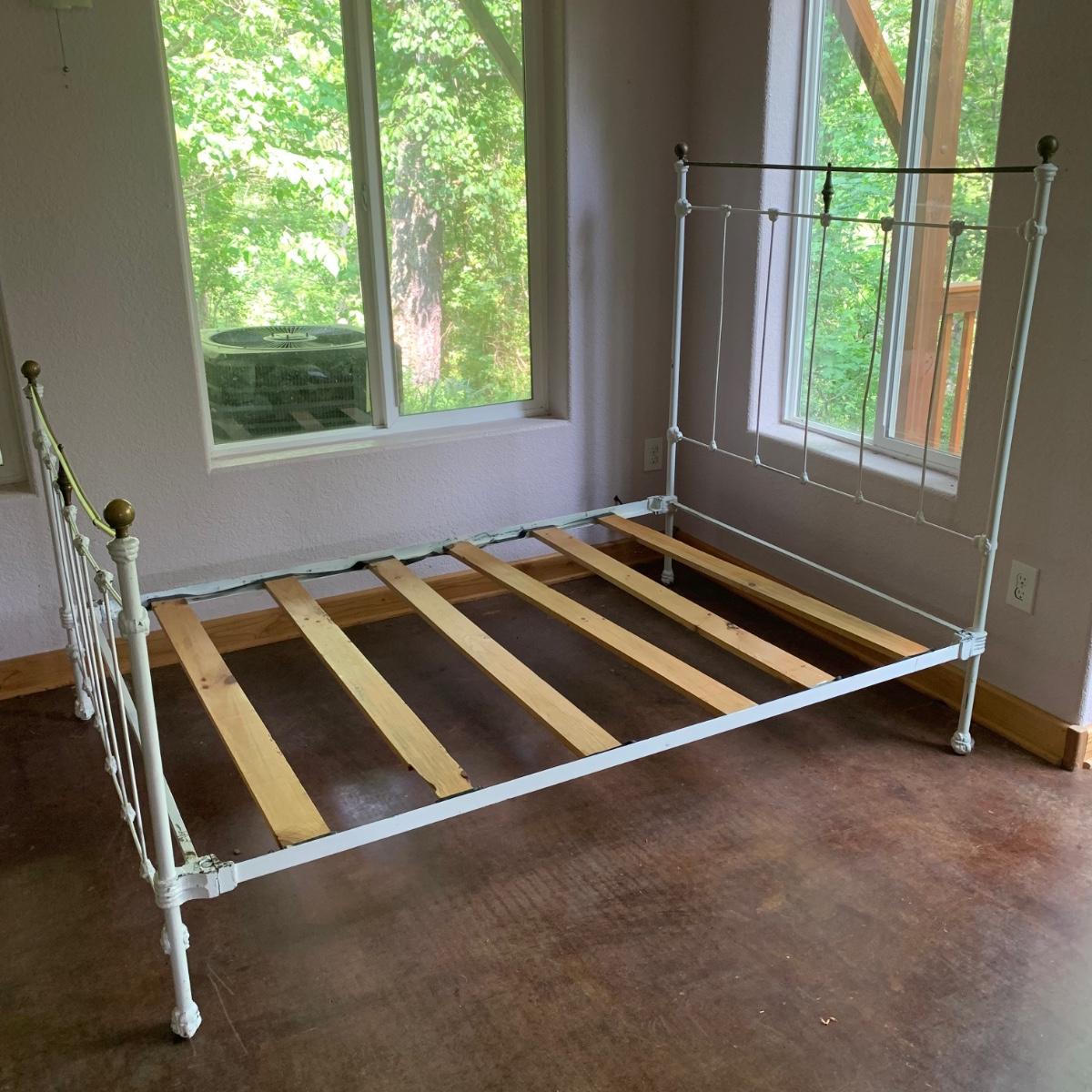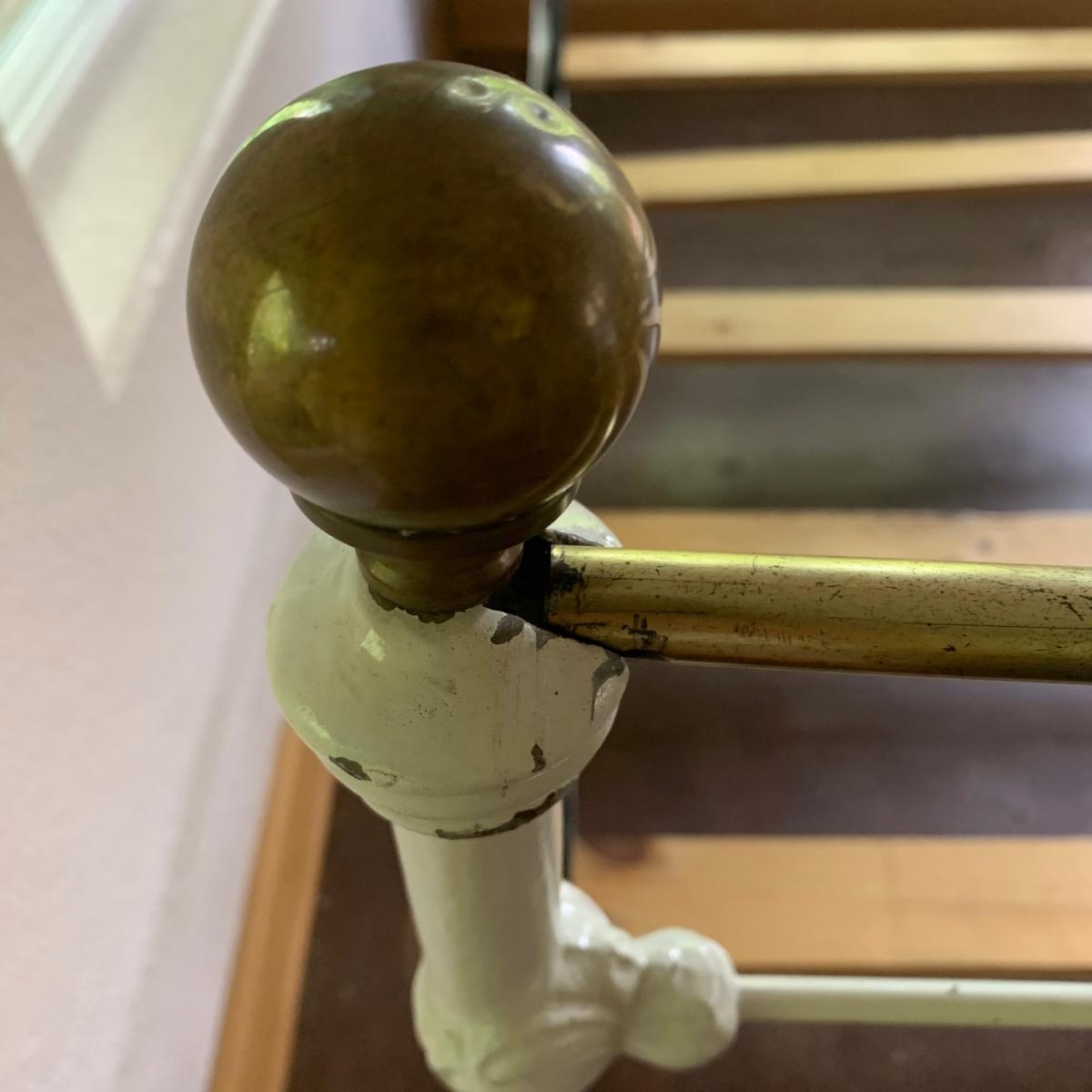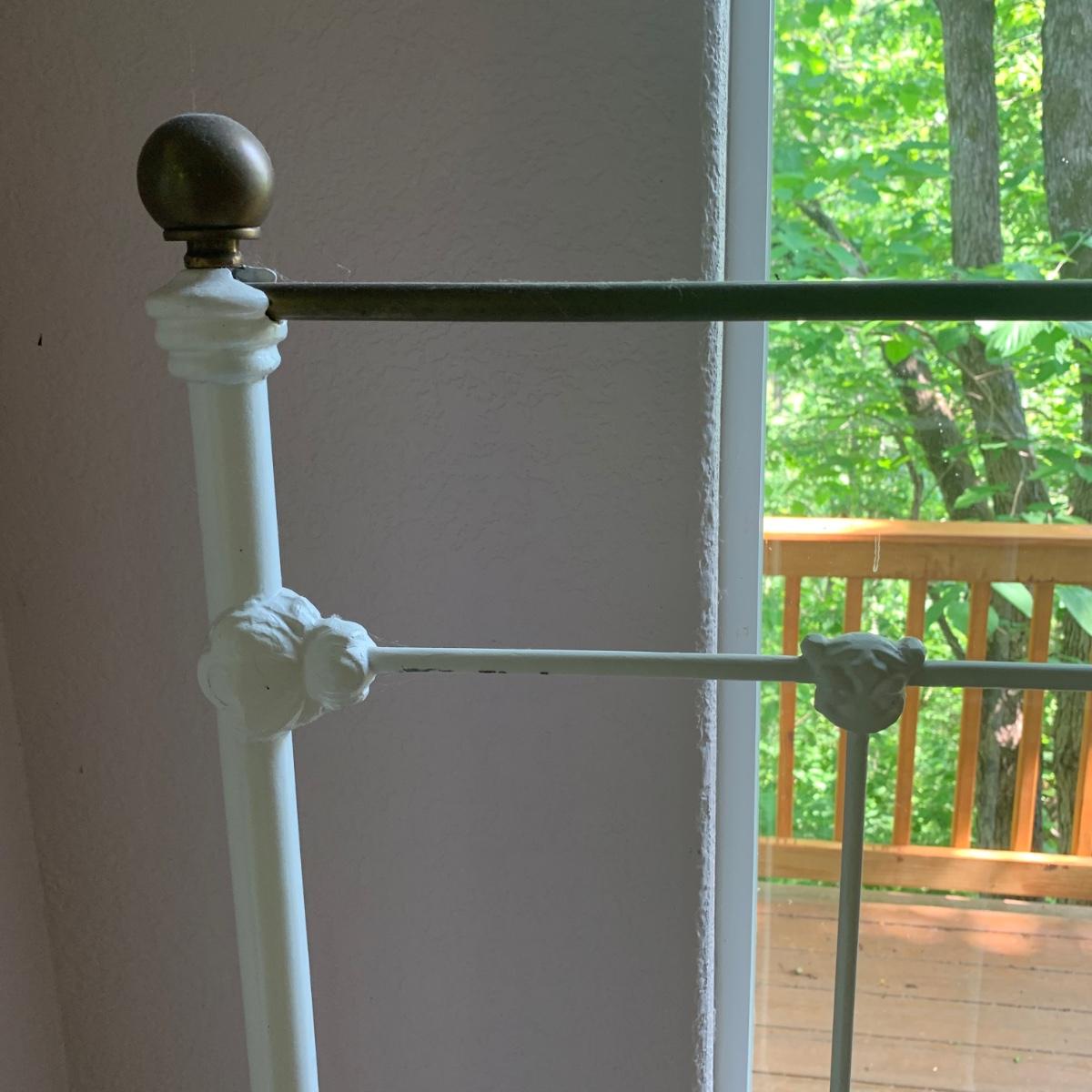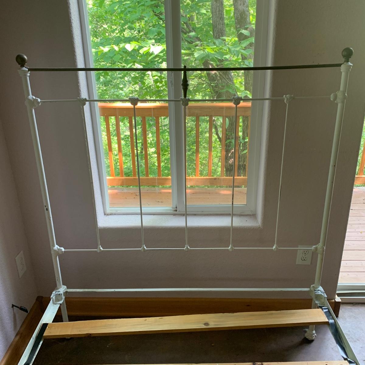 Full-sized iron bed frame painted white with brass-like accents. This bed measures, 54” x 75” x 58"H. It has a few bends in rails and multiple paint chips. Please see photos for more details. Note, this lot includes the bed frame only. Mattress is not included. Local pickup only. The winner bidder will be responsible for disassembling the bed frame, a rubber mallet would be helpful for the frame.