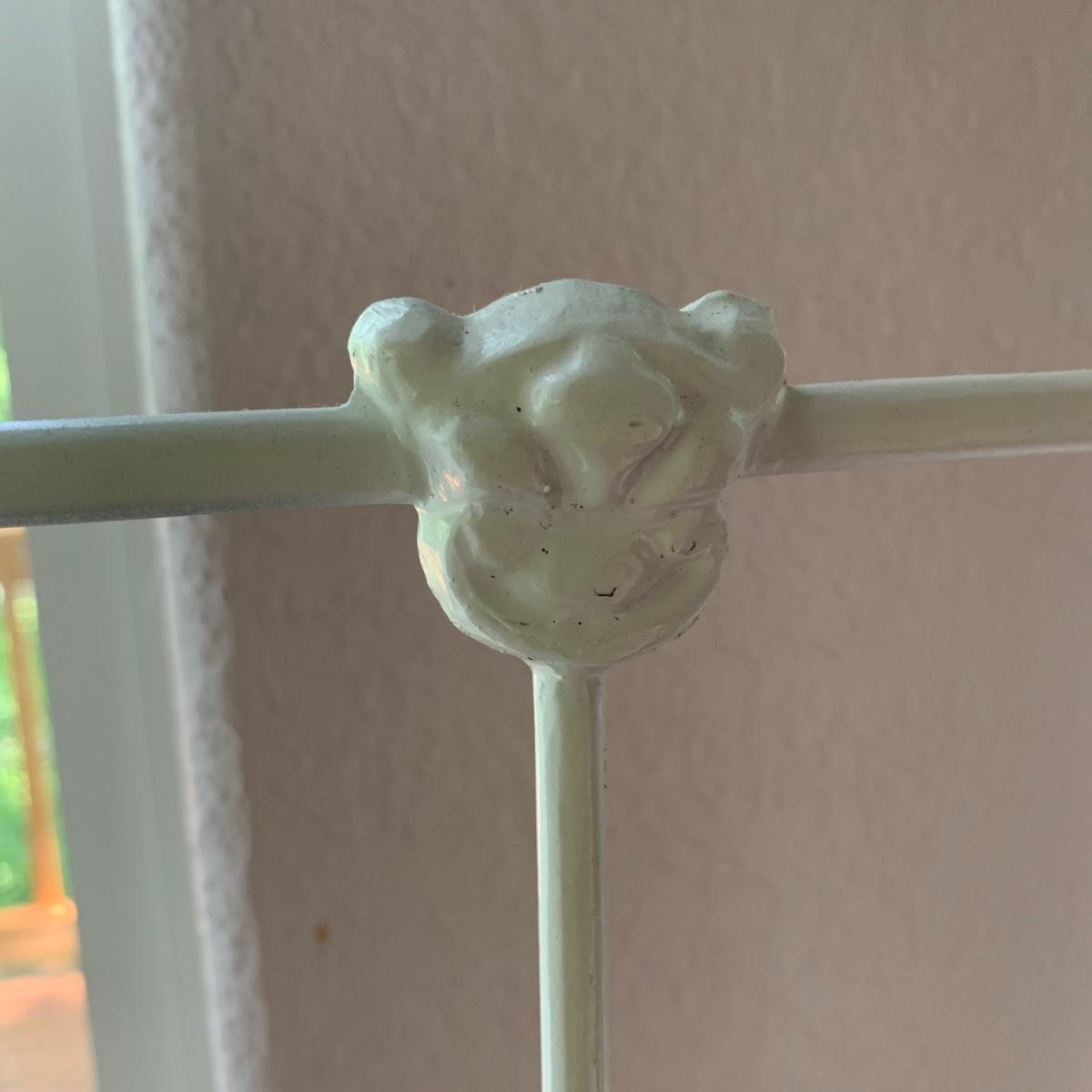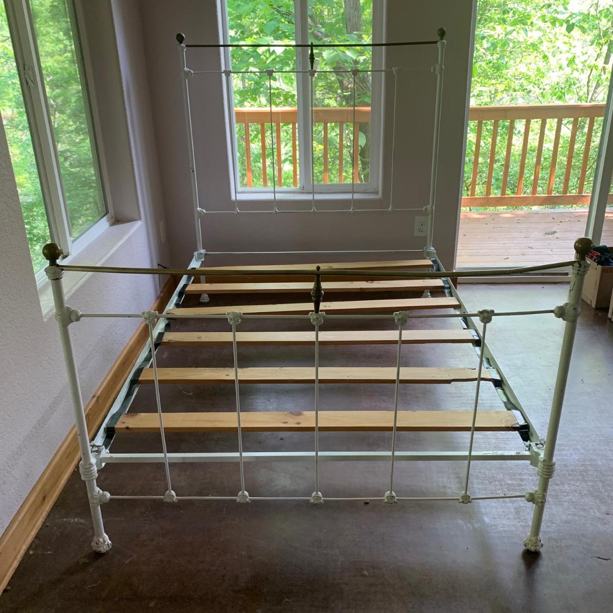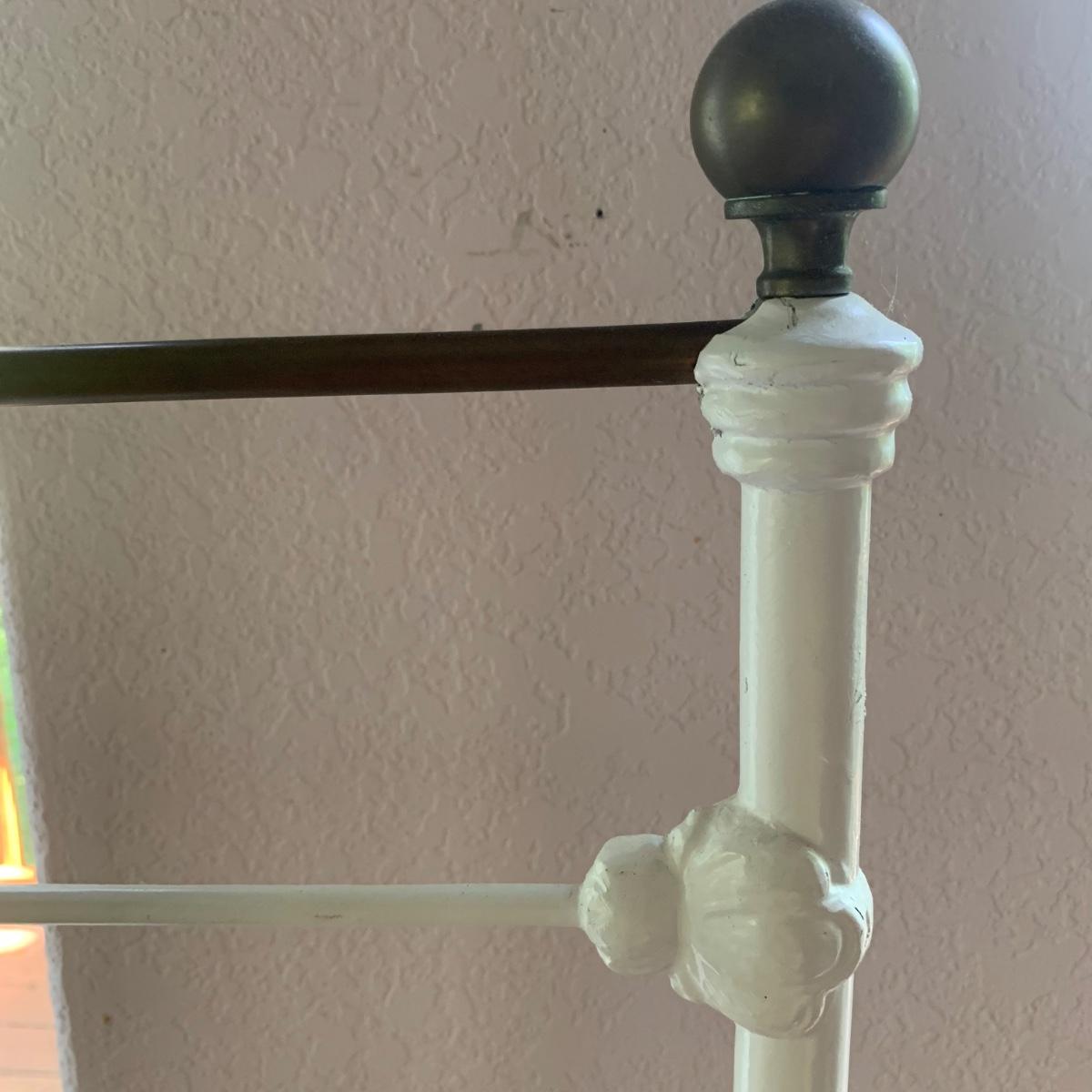 Full-sized iron bed frame painted white with brass-like accents. This bed measures, 54” x 75” x 58"H. It has a few bends in rails and multiple paint chips. Please see photos for more details. Note, this lot includes the bed frame only. Mattress is not included. Local pickup only. The winner bidder will be responsible for disassembling the bed frame, a rubber mallet would be helpful for the frame.