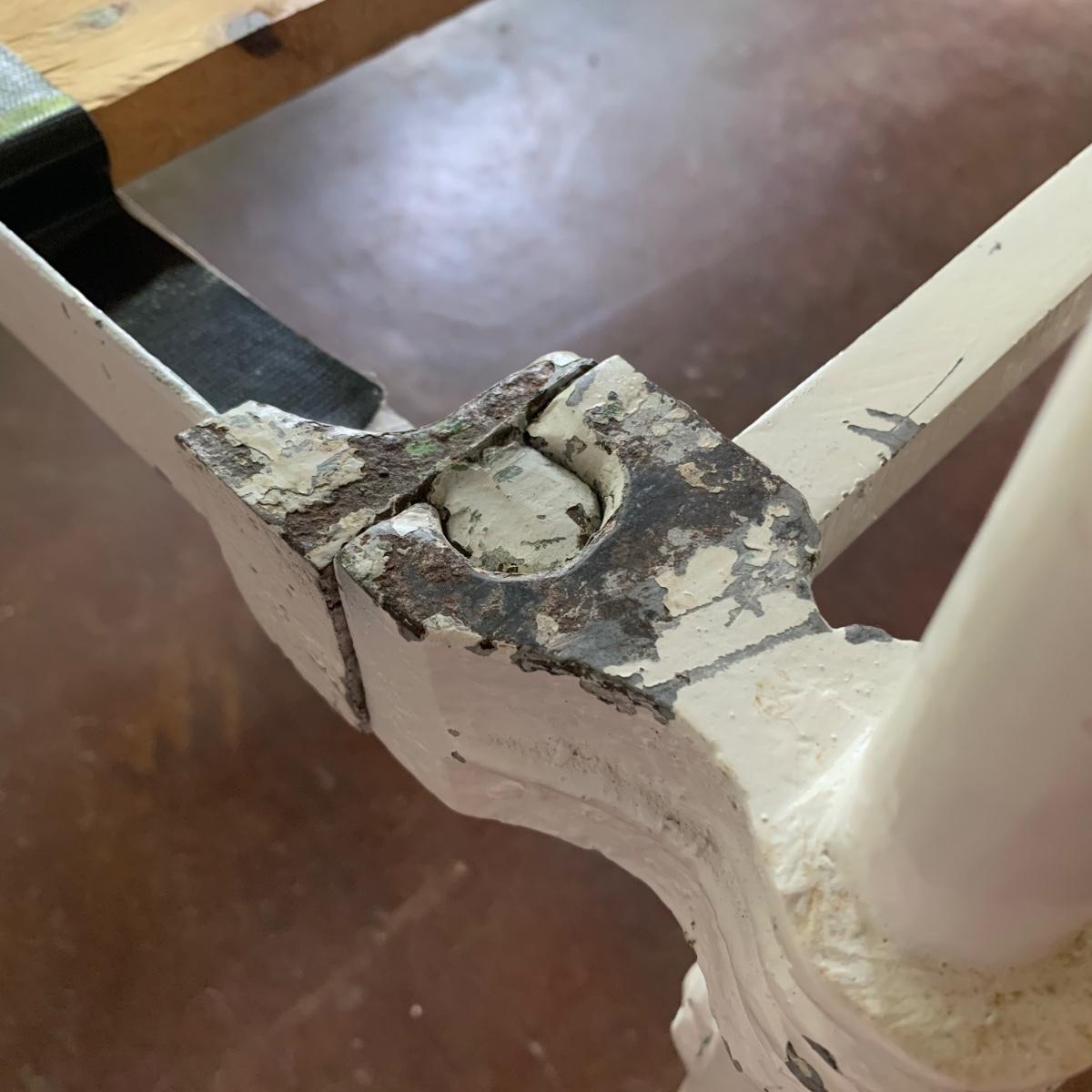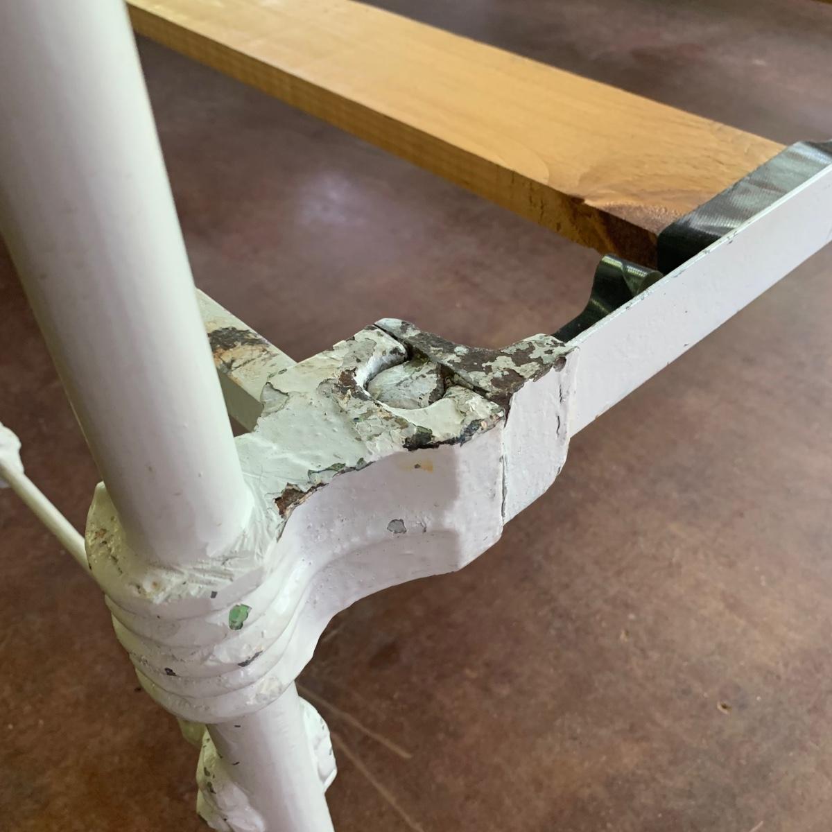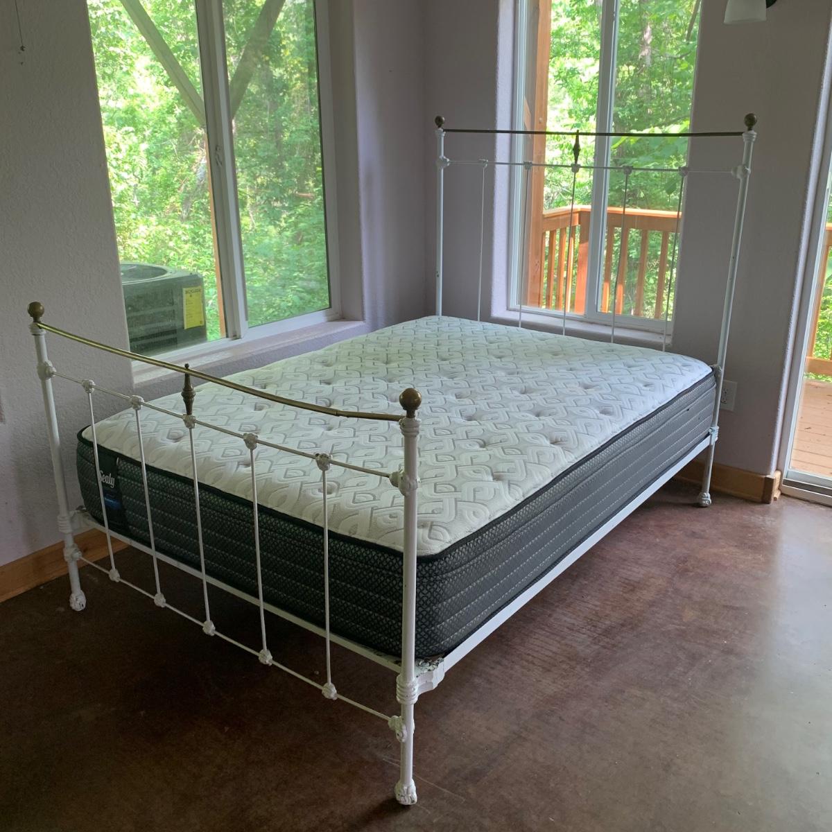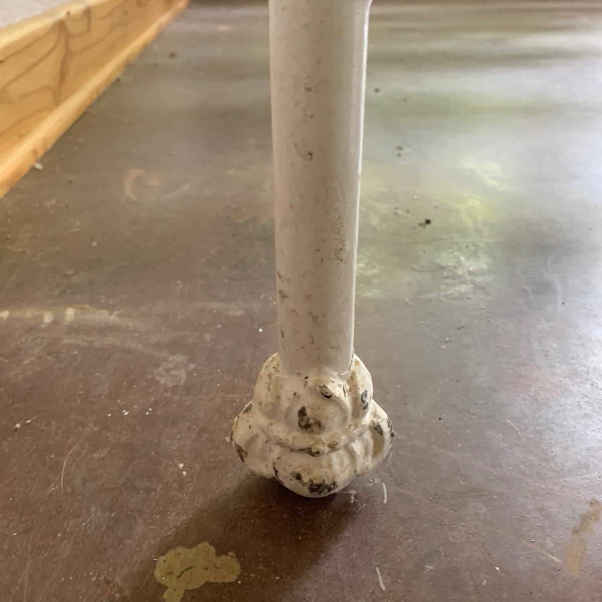 Full-sized iron bed frame painted white with brass-like accents. This bed measures, 54” x 75” x 58"H. It has a few bends in rails and multiple paint chips. Please see photos for more details. Note, this lot includes the bed frame only. Mattress is not included. Local pickup only. The winner bidder will be responsible for disassembling the bed frame, a rubber mallet would be helpful for the frame.