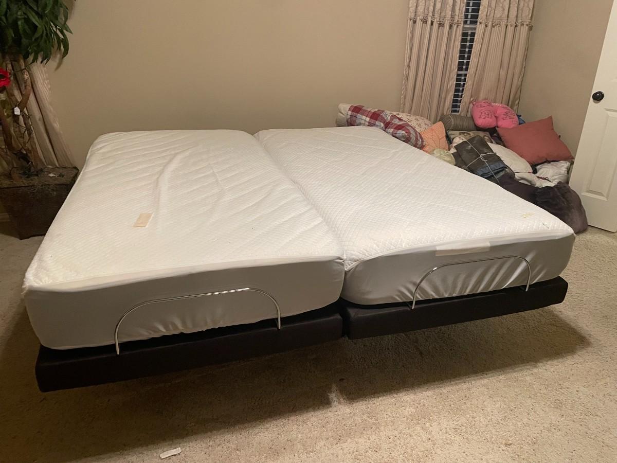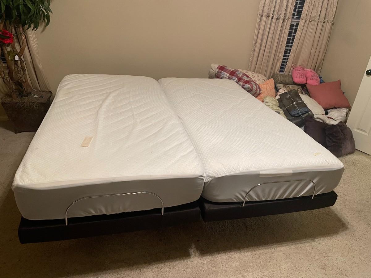 Fully adjustable bed (two twins, independent adjustment) and lot of pillows.