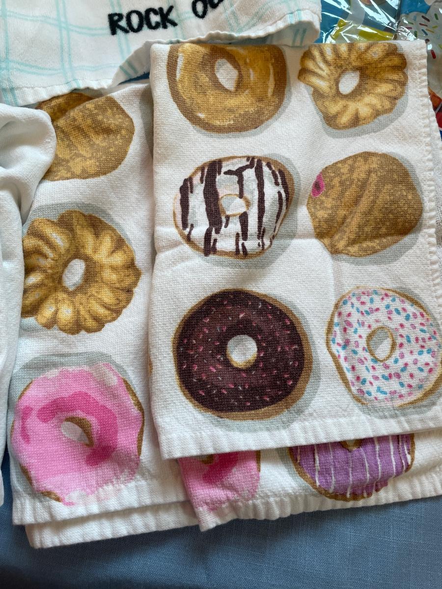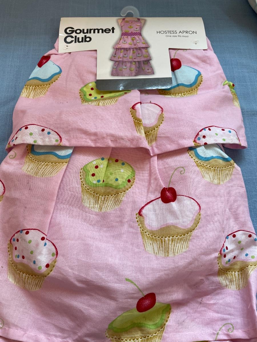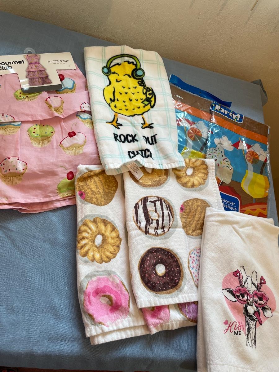 Includes new apron, five dish towels, and two plastic table covers