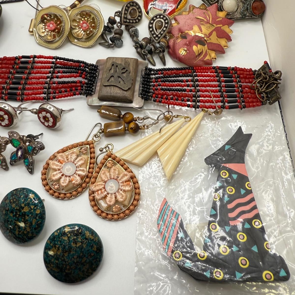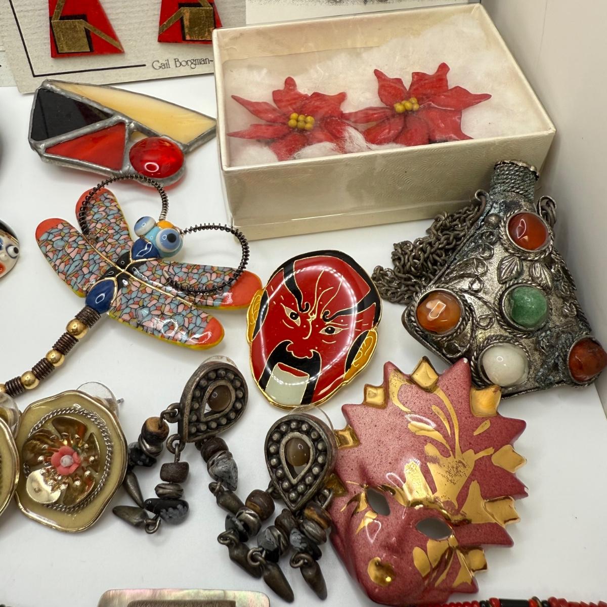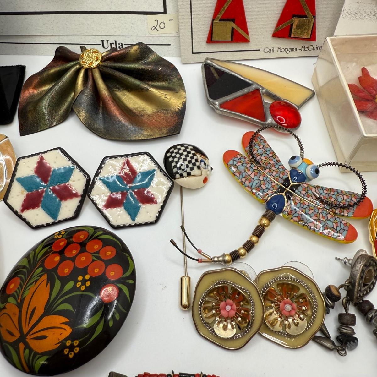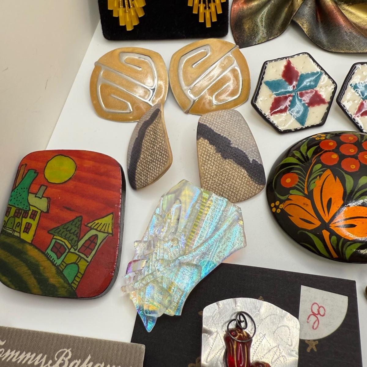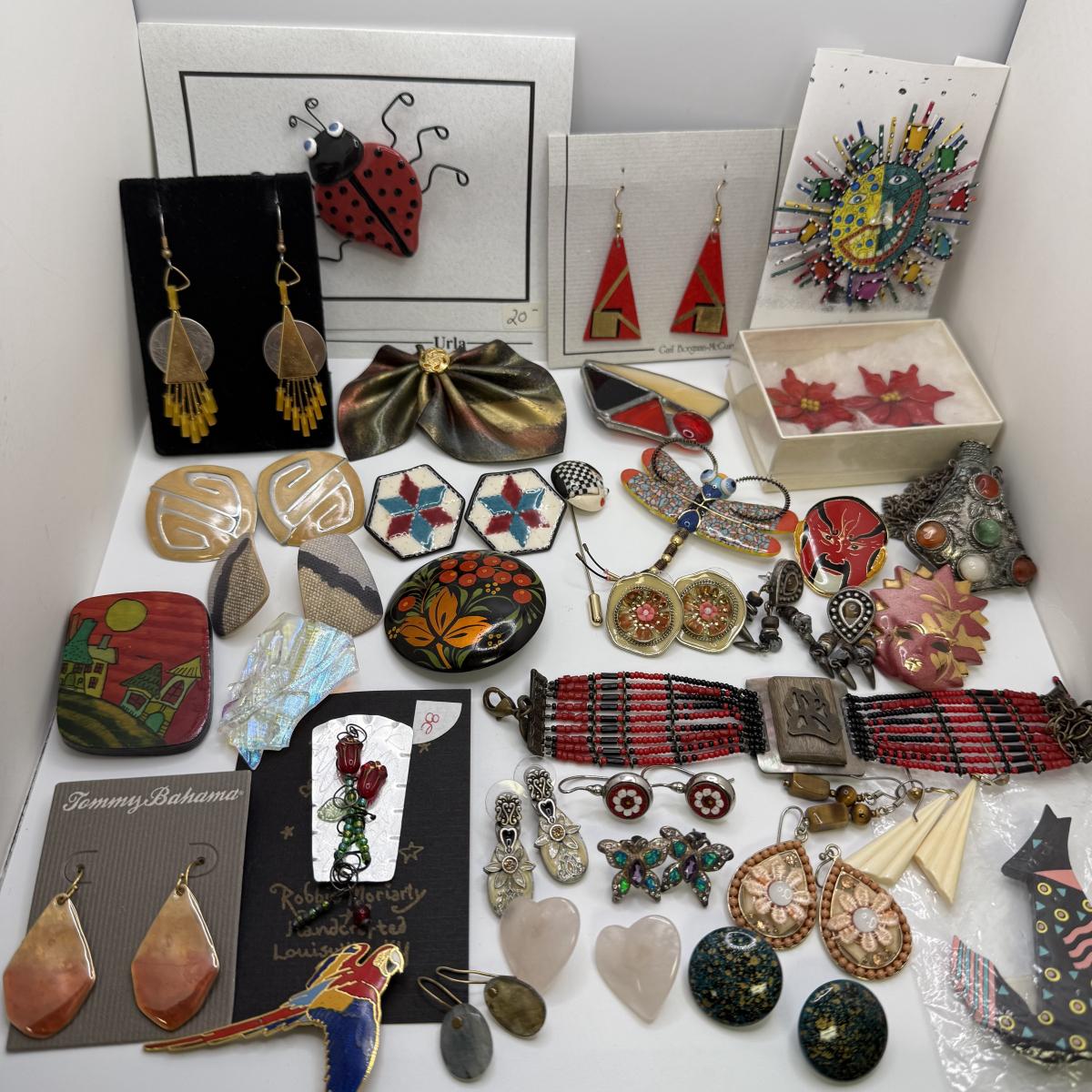 A fun and colorful variety of artsy jewelry! Included are over 15 pairs of earrings for pierced ears plus one pair of clip earrings, one bracelet, one gemstone filled pendant on a chain, and more than 10 pins/brooches. Materials range from stones, to glass, to wood, ceramic, and more. According to the seller, one pair of earrings lights up with batteries inserted (need replaced). For reference, the round black pin with red berries measures 2”D.