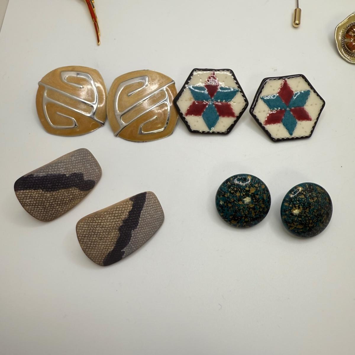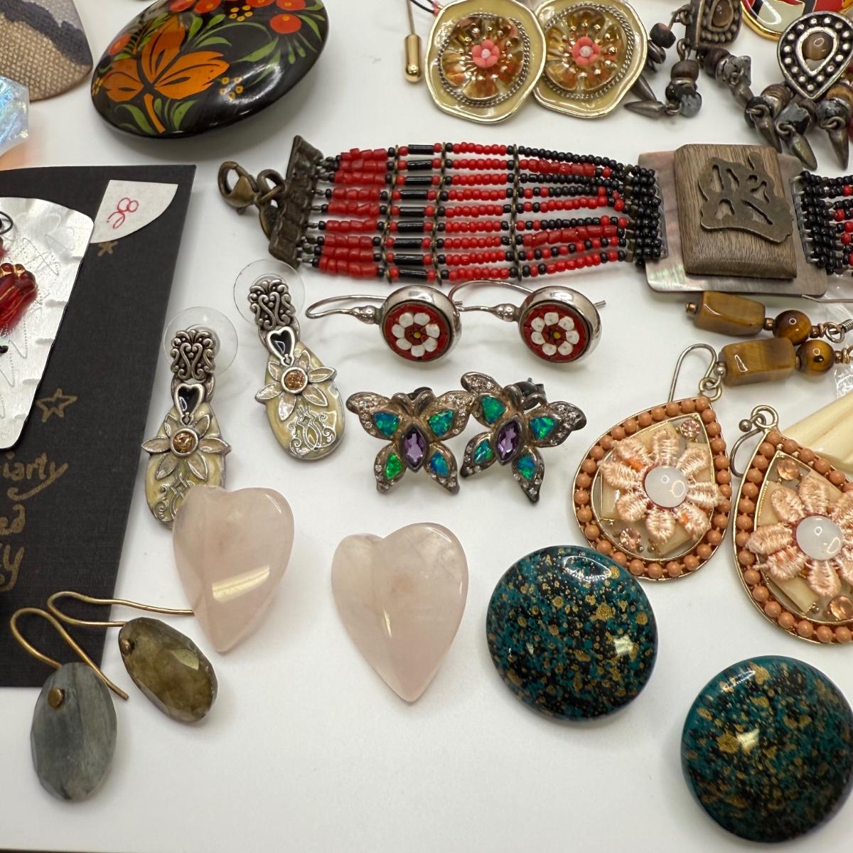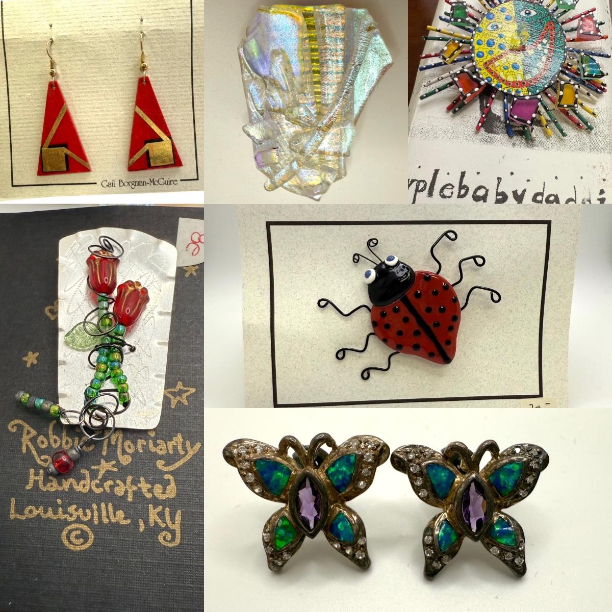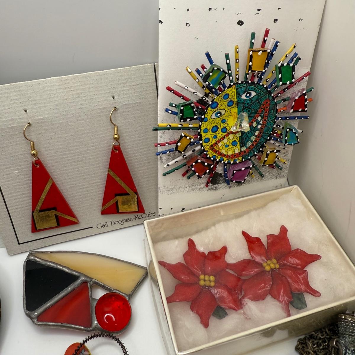 A fun and colorful variety of artsy jewelry! Included are over 15 pairs of earrings for pierced ears plus one pair of clip earrings, one bracelet, one gemstone filled pendant on a chain, and more than 10 pins/brooches. Materials range from stones, to glass, to wood, ceramic, and more. According to the seller, one pair of earrings lights up with batteries inserted (need replaced). For reference, the round black pin with red berries measures 2”D.