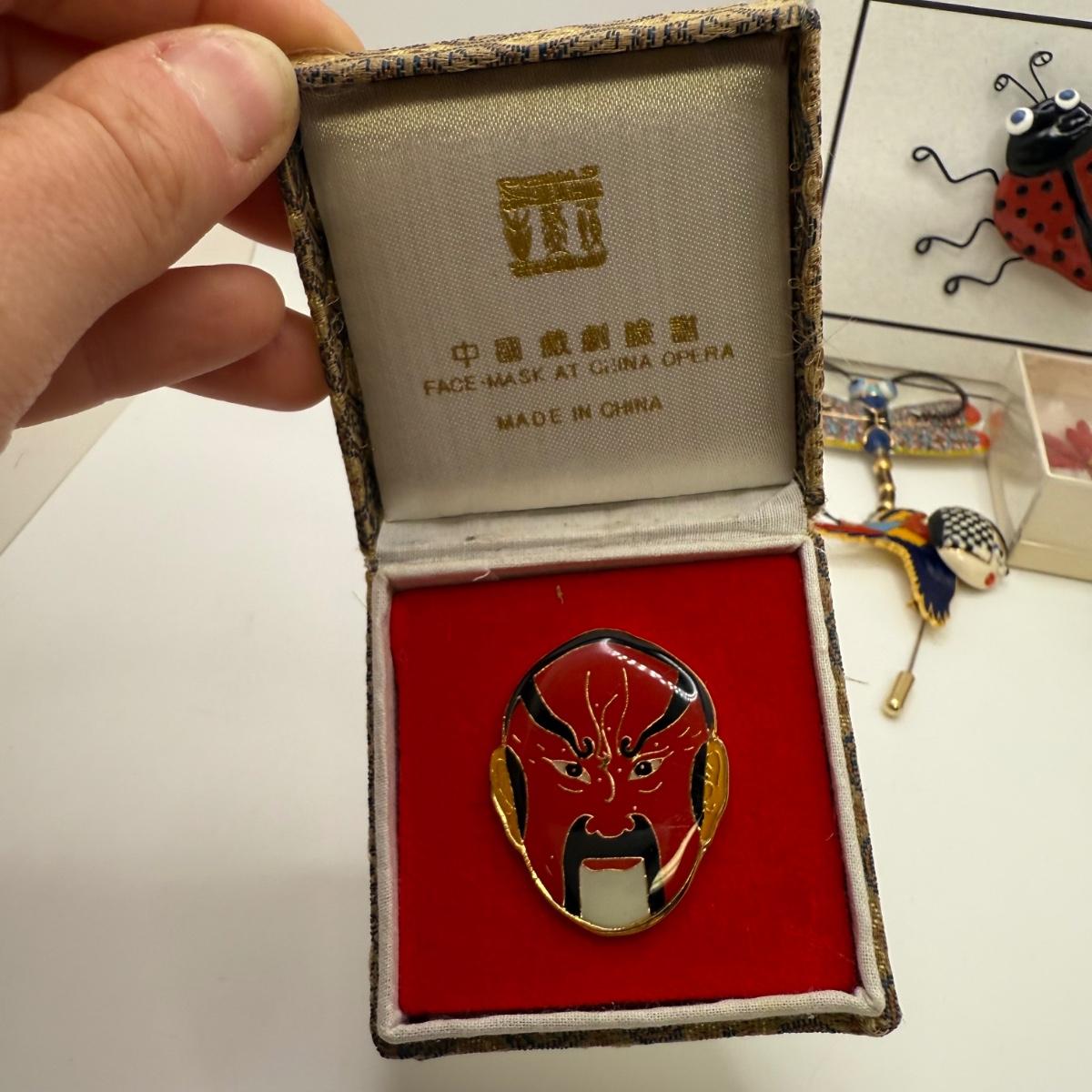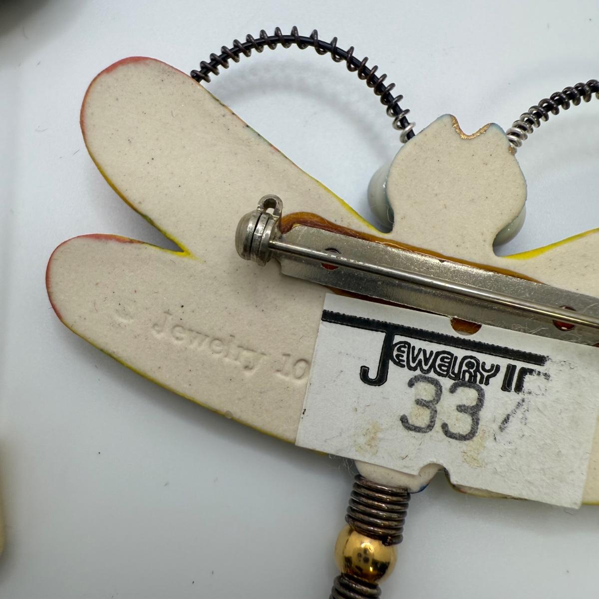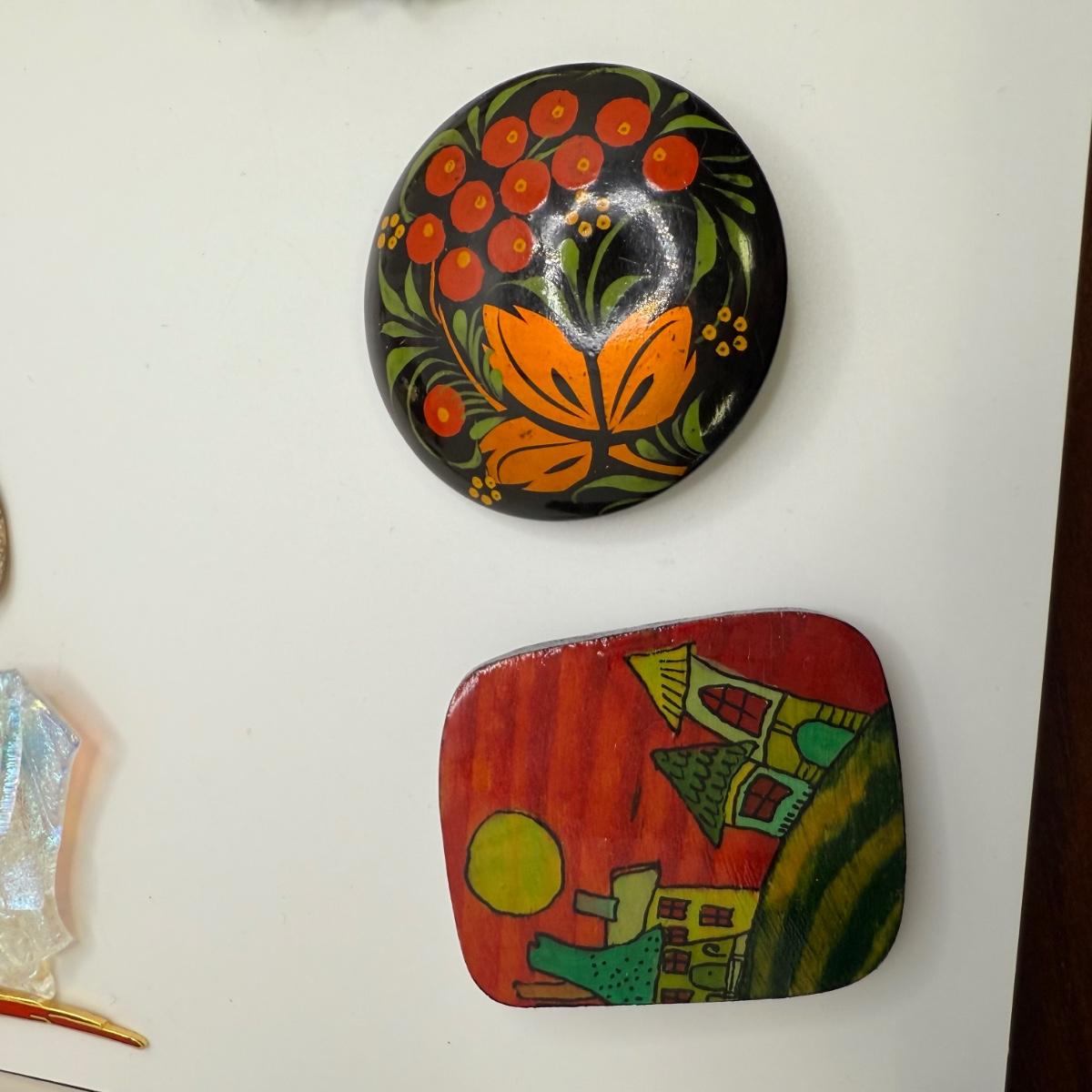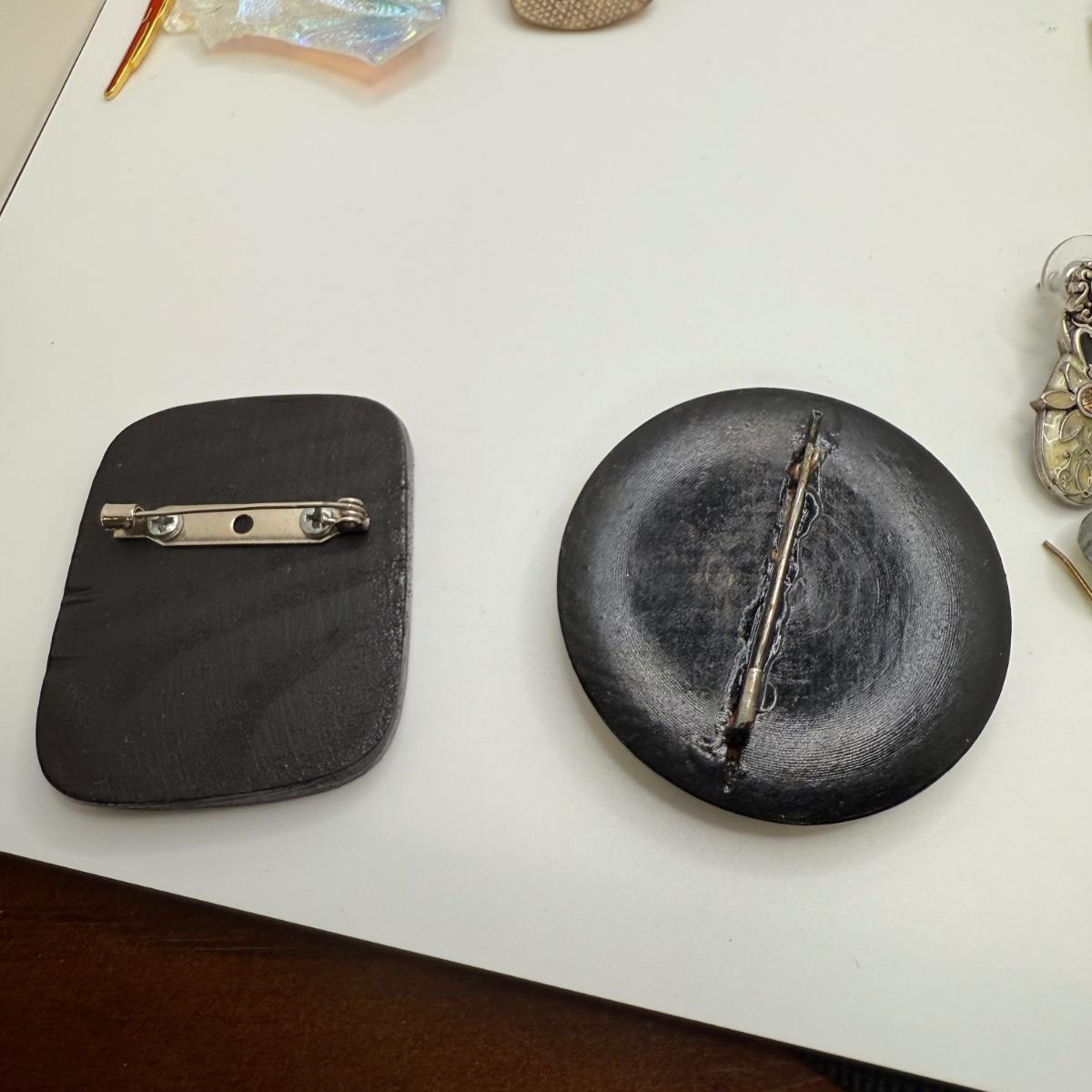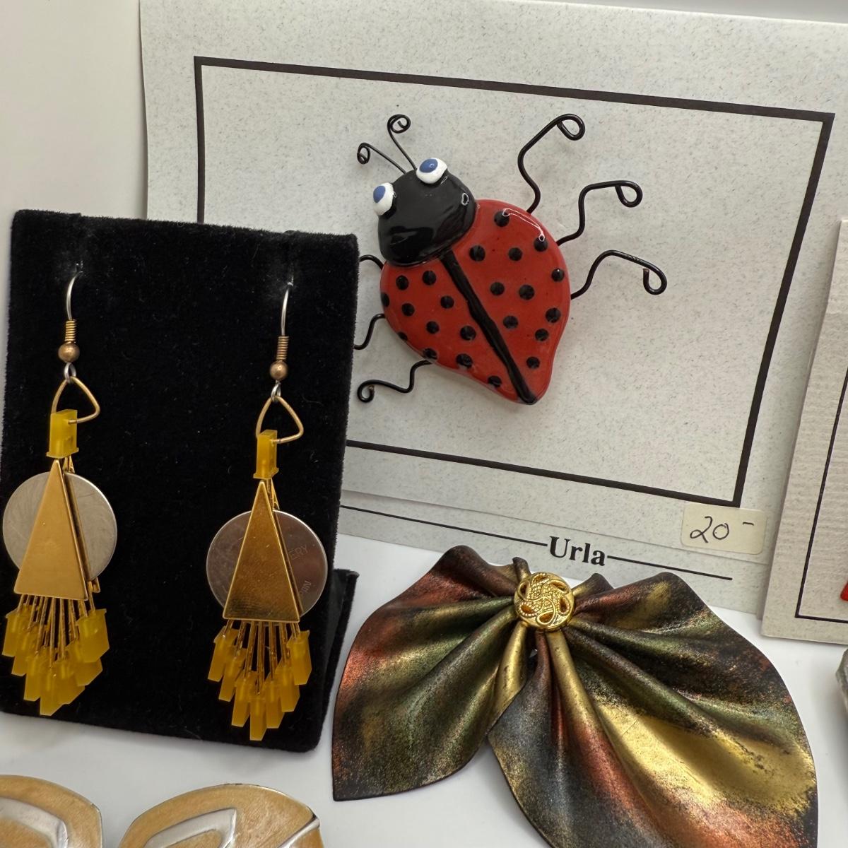A fun and colorful variety of artsy jewelry! Included are over 15 pairs of earrings for pierced ears plus one pair of clip earrings, one bracelet, one gemstone filled pendant on a chain, and more than 10 pins/brooches. Materials range from stones, to glass, to wood, ceramic, and more. According to the seller, one pair of earrings lights up with batteries inserted (need replaced). For reference, the round black pin with red berries measures 2”D.