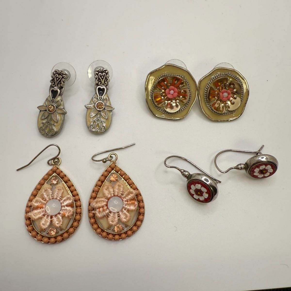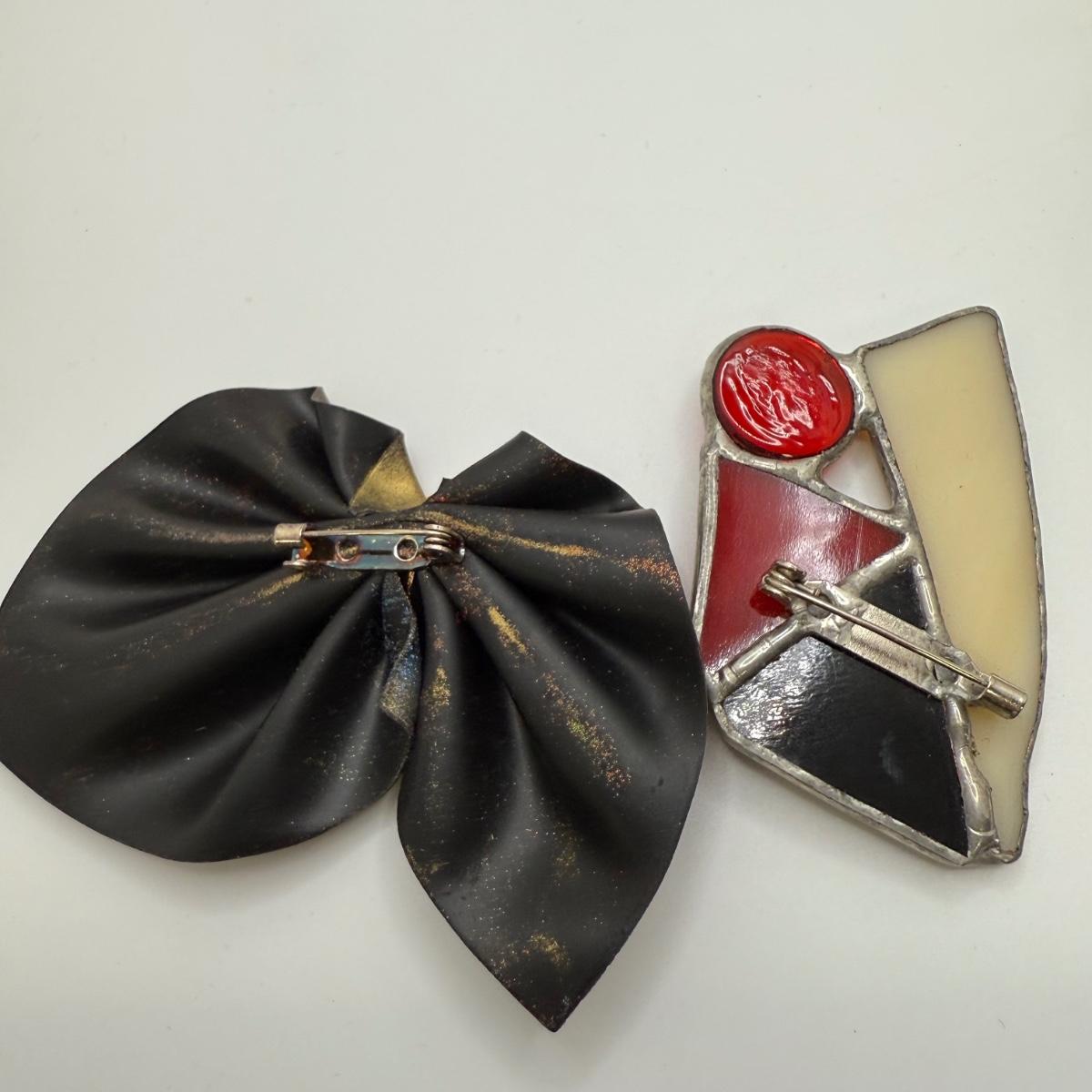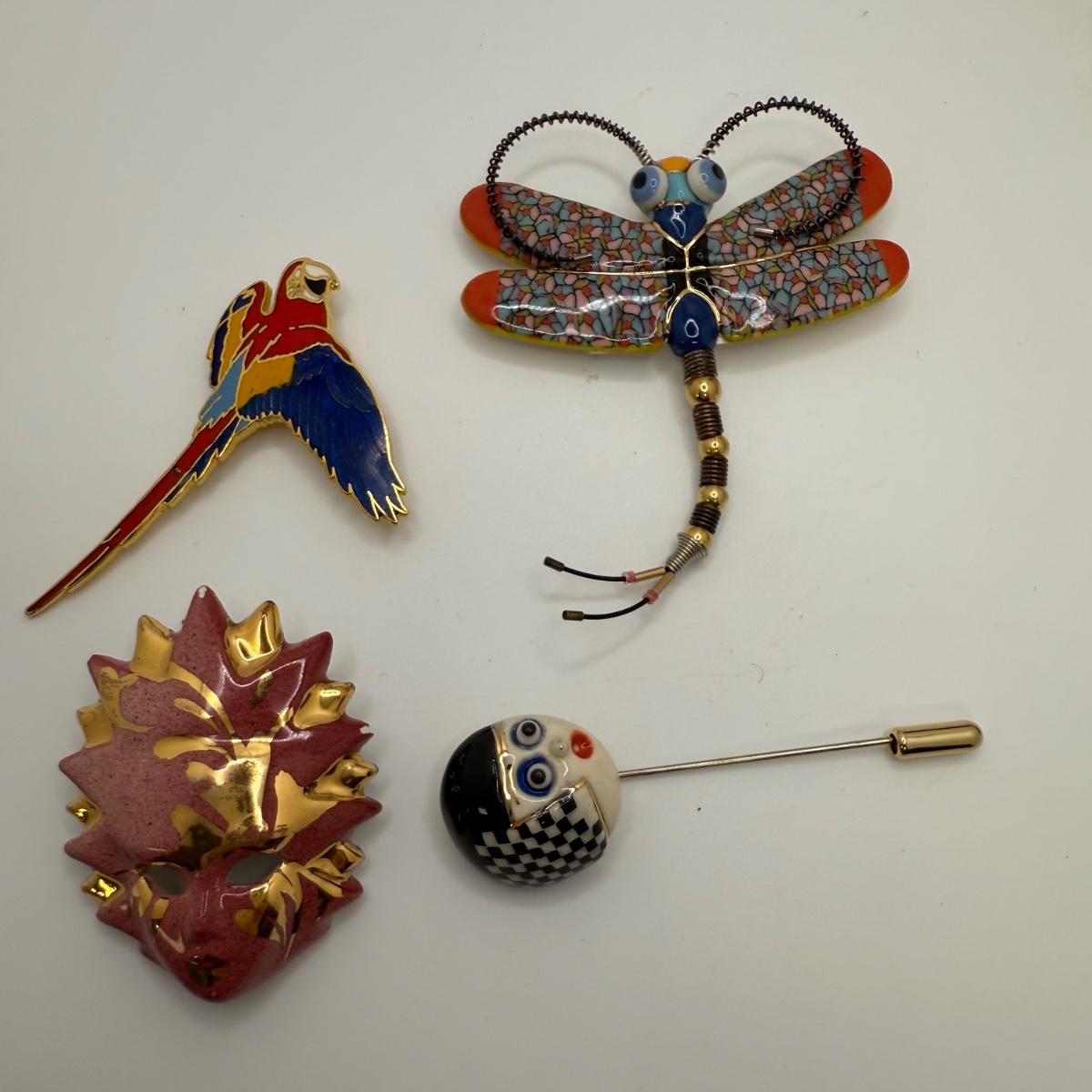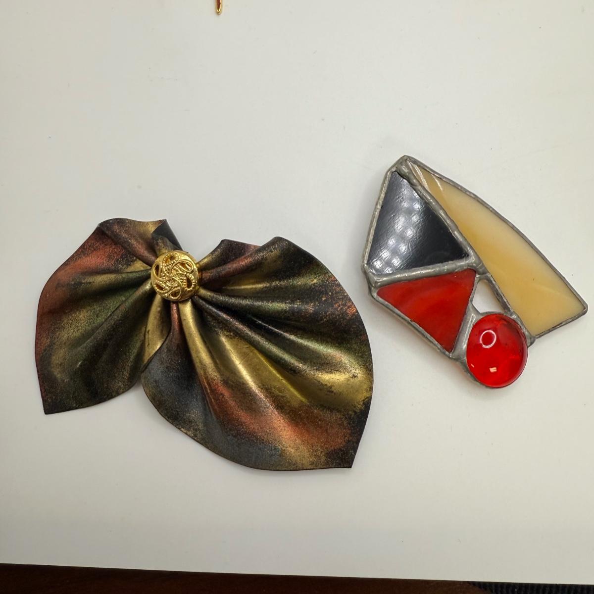 A fun and colorful variety of artsy jewelry! Included are over 15 pairs of earrings for pierced ears plus one pair of clip earrings, one bracelet, one gemstone filled pendant on a chain, and more than 10 pins/brooches. Materials range from stones, to glass, to wood, ceramic, and more. According to the seller, one pair of earrings lights up with batteries inserted (need replaced). For reference, the round black pin with red berries measures 2”D.