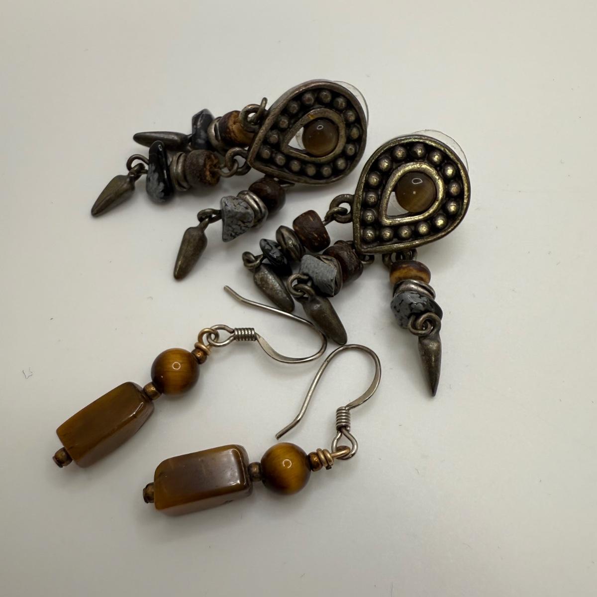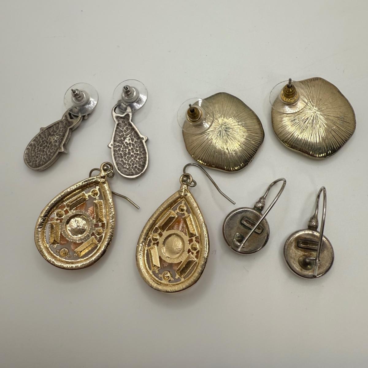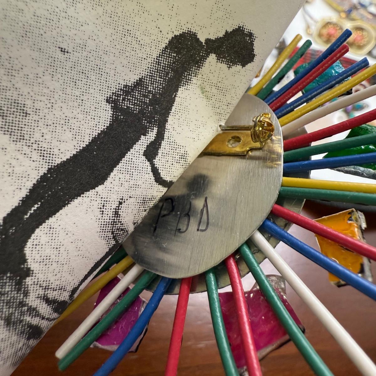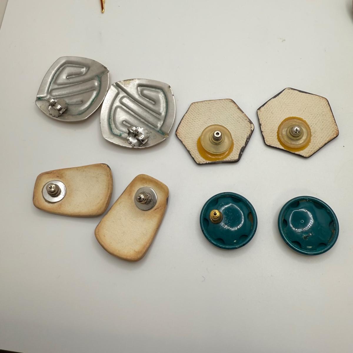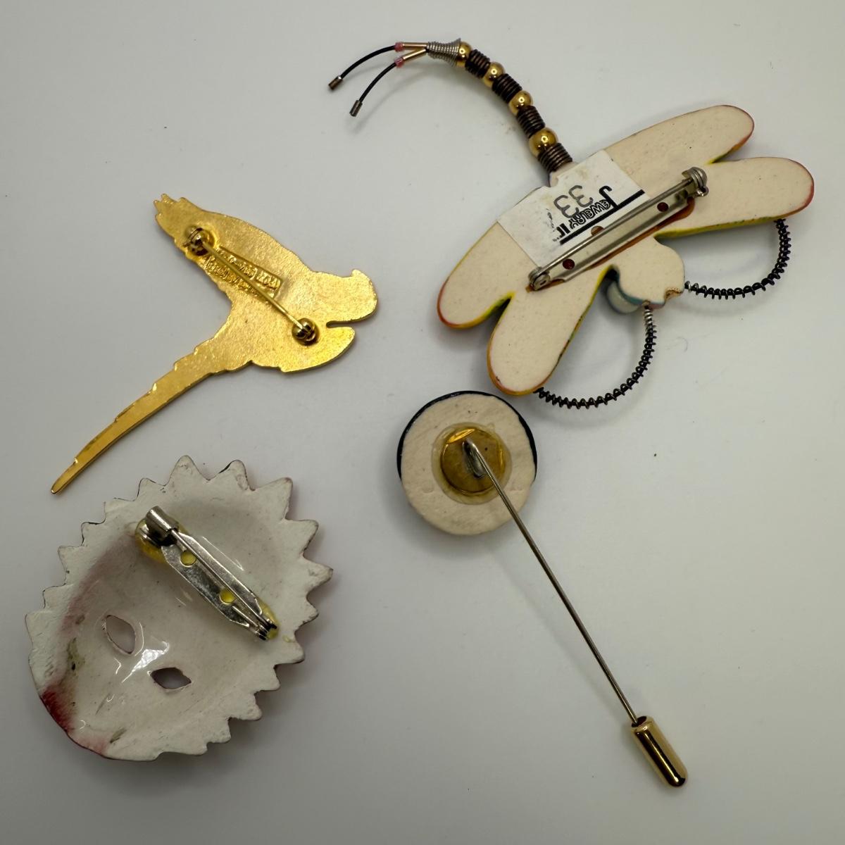 A fun and colorful variety of artsy jewelry! Included are over 15 pairs of earrings for pierced ears plus one pair of clip earrings, one bracelet, one gemstone filled pendant on a chain, and more than 10 pins/brooches. Materials range from stones, to glass, to wood, ceramic, and more. According to the seller, one pair of earrings lights up with batteries inserted (need replaced). For reference, the round black pin with red berries measures 2”D.