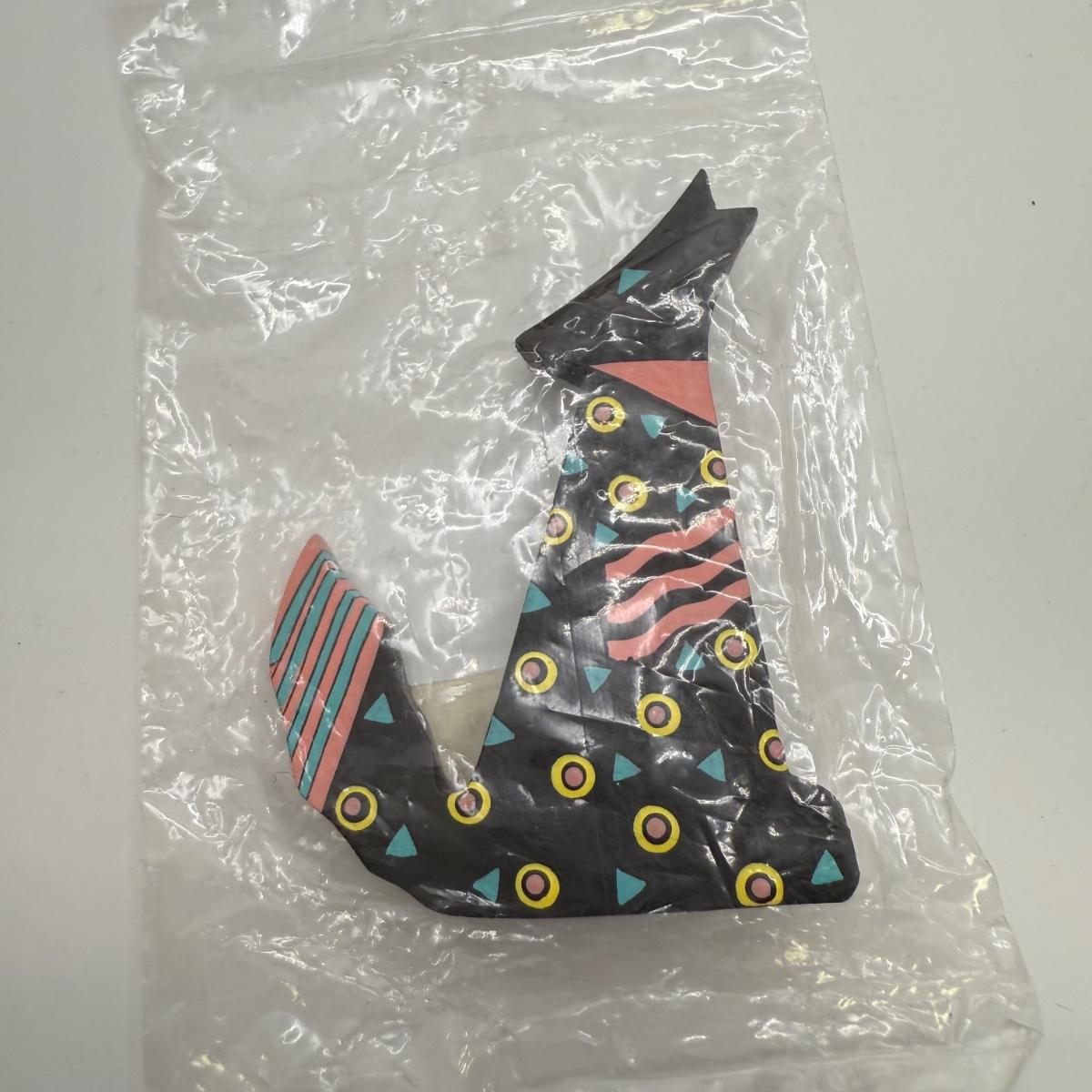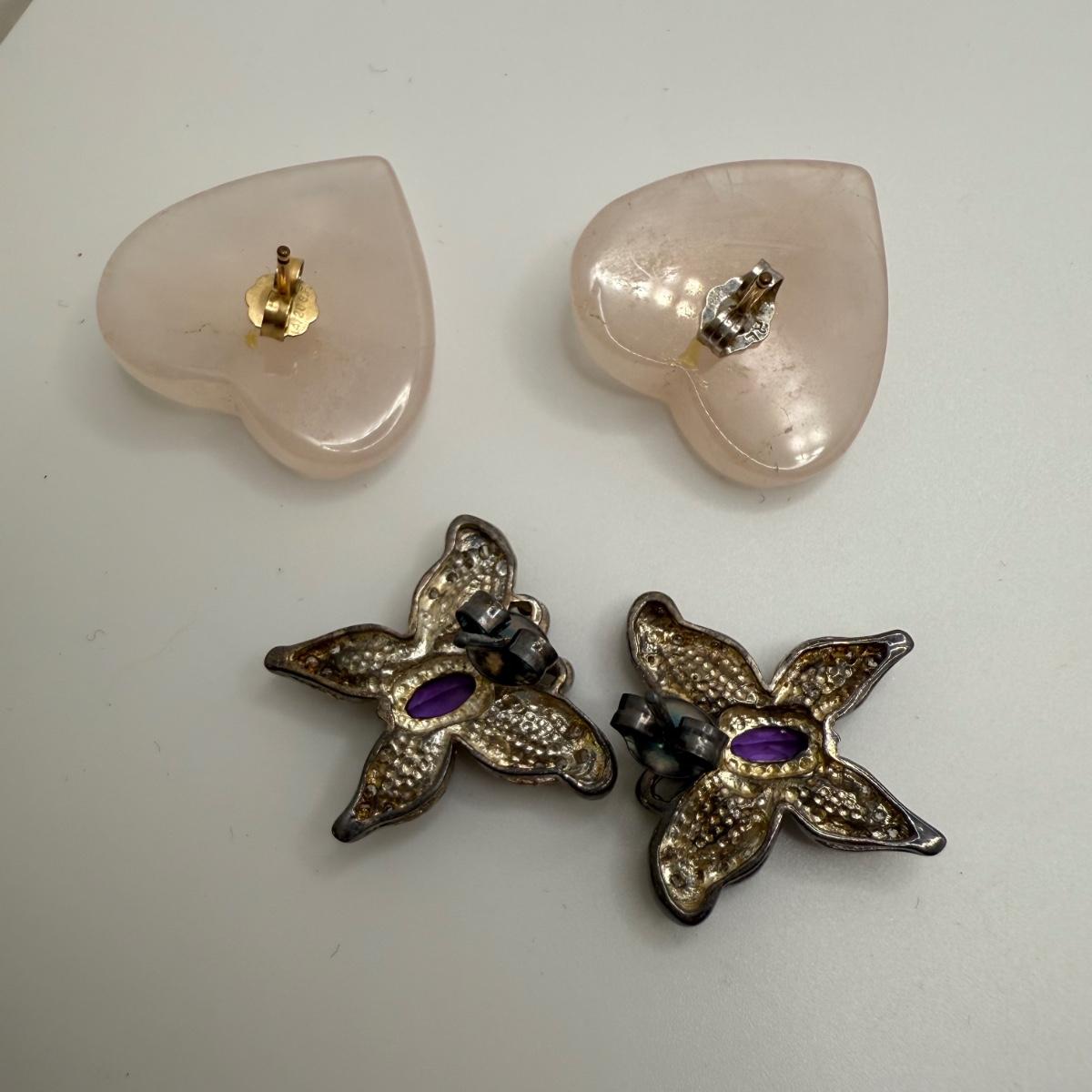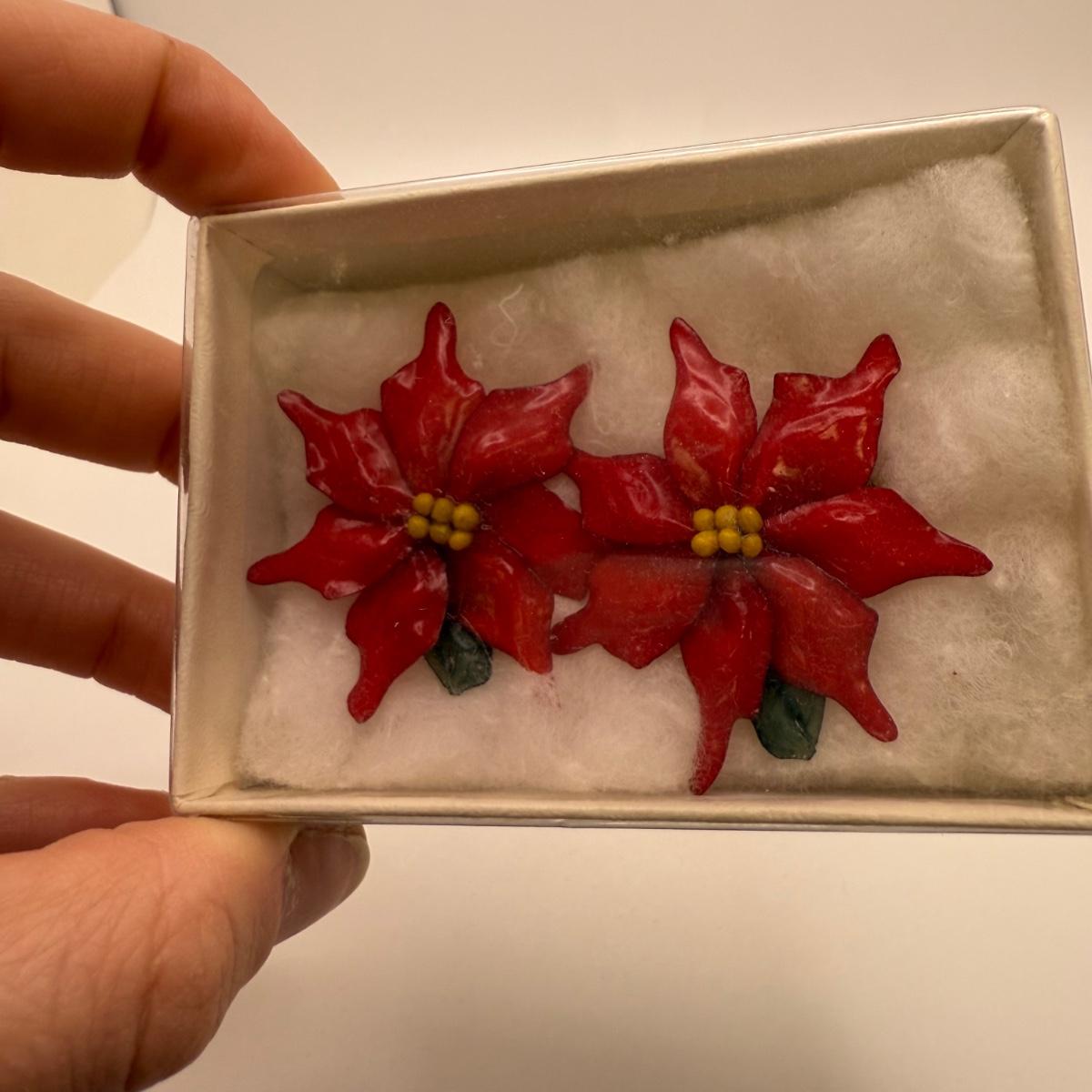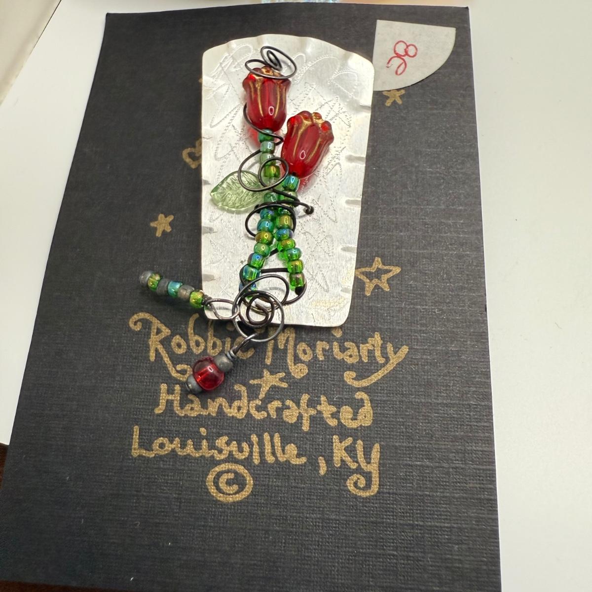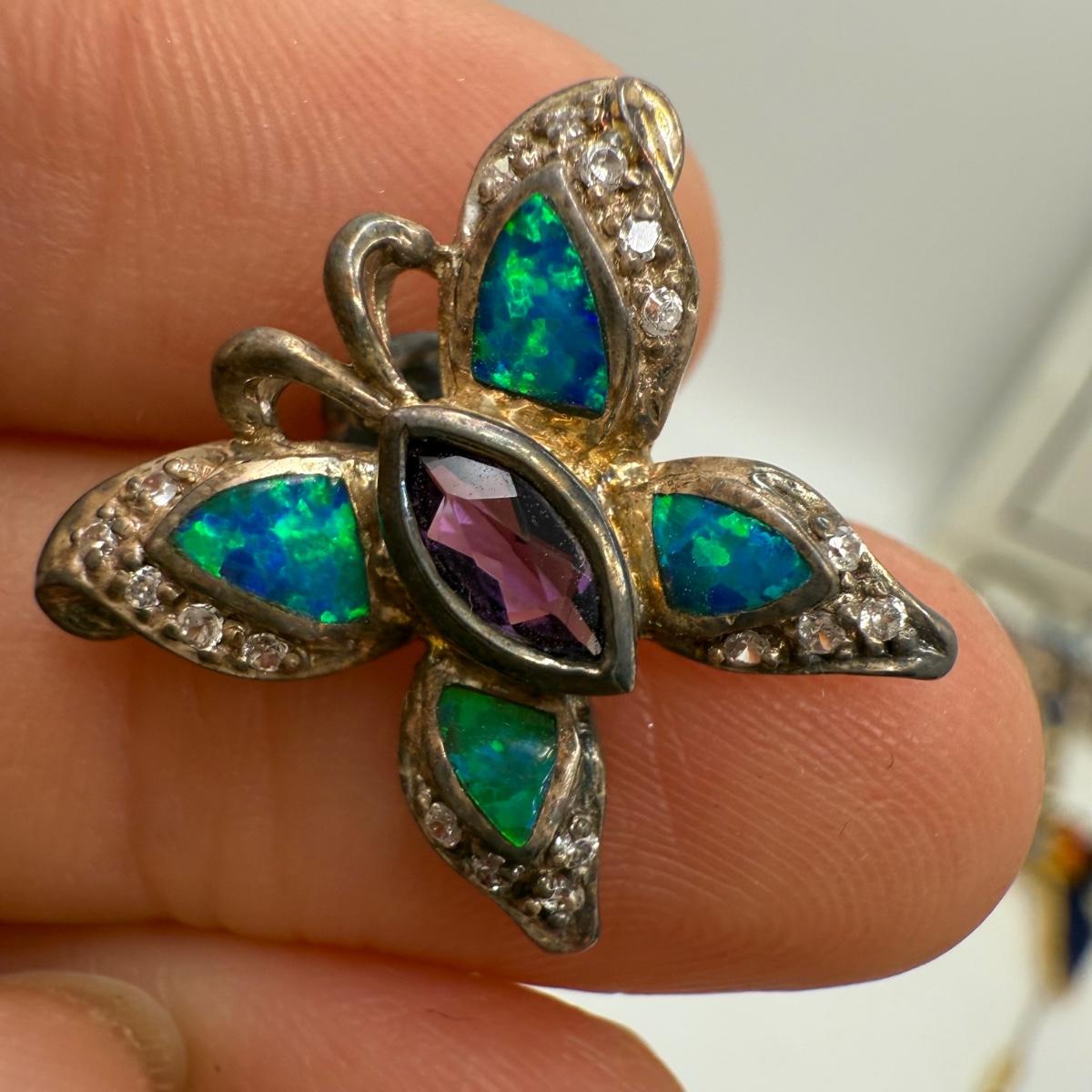 A fun and colorful variety of artsy jewelry! Included are over 15 pairs of earrings for pierced ears plus one pair of clip earrings, one bracelet, one gemstone filled pendant on a chain, and more than 10 pins/brooches. Materials range from stones, to glass, to wood, ceramic, and more. According to the seller, one pair of earrings lights up with batteries inserted (need replaced). For reference, the round black pin with red berries measures 2”D.
