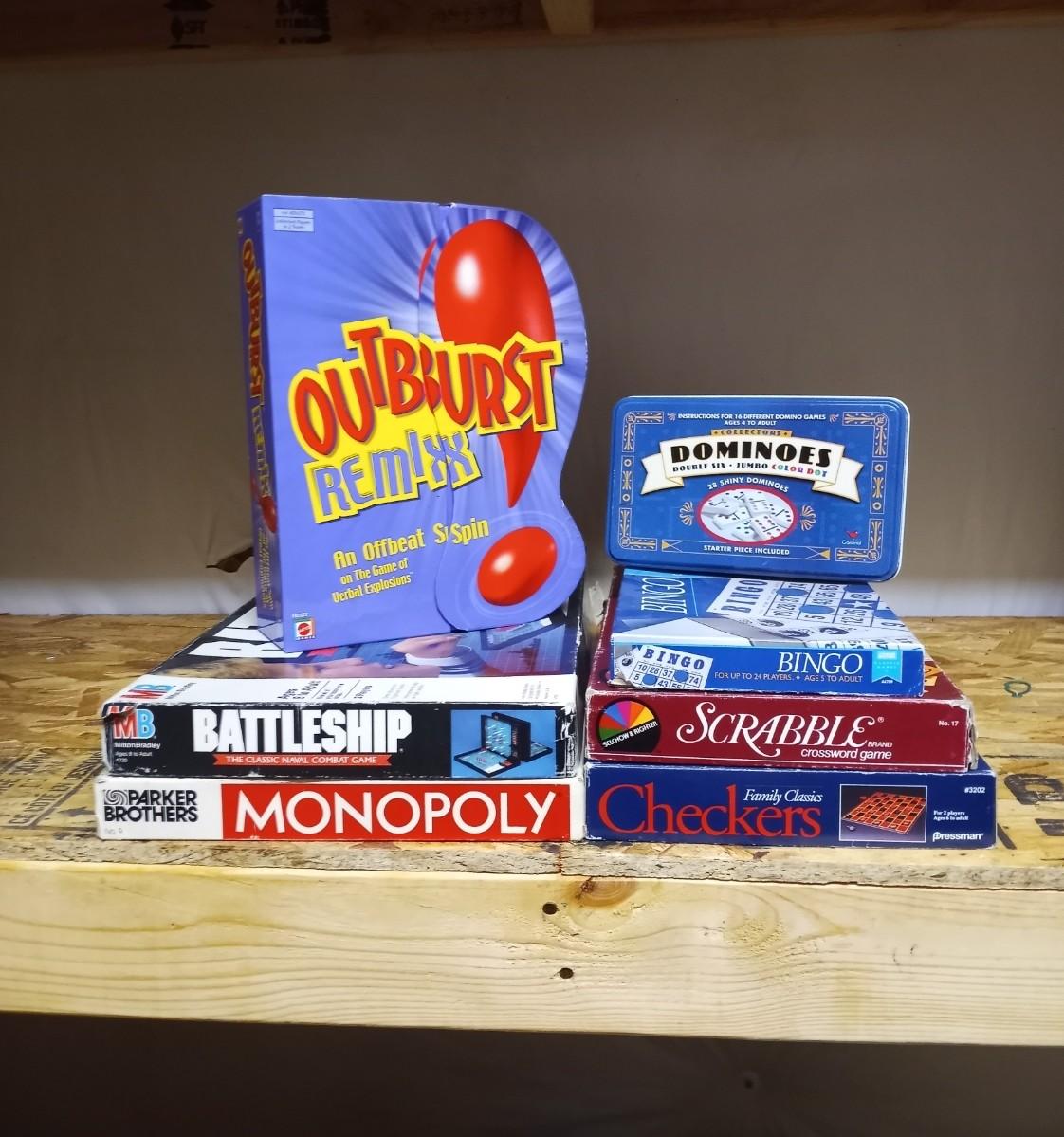 FUN BOARD GAMES OUTBURST-BATTLESHIP-SCRABBLE-DOMINOS AND MORE