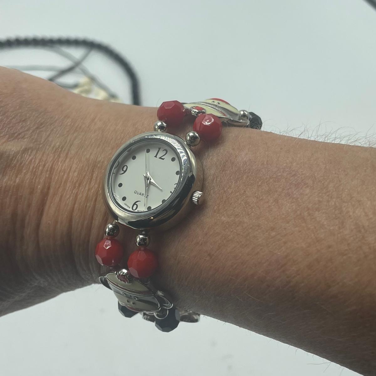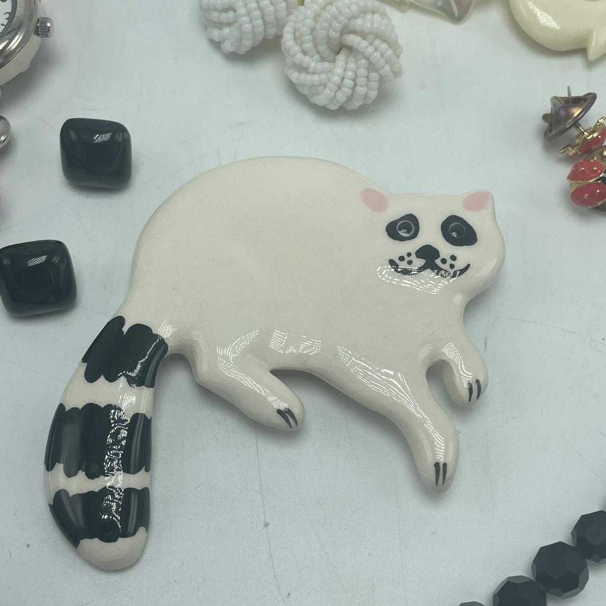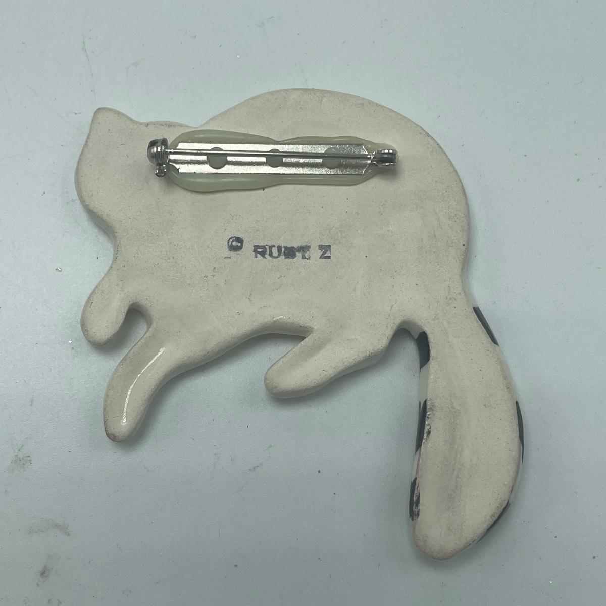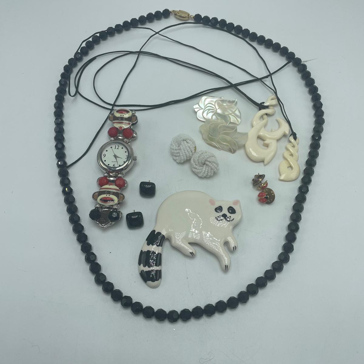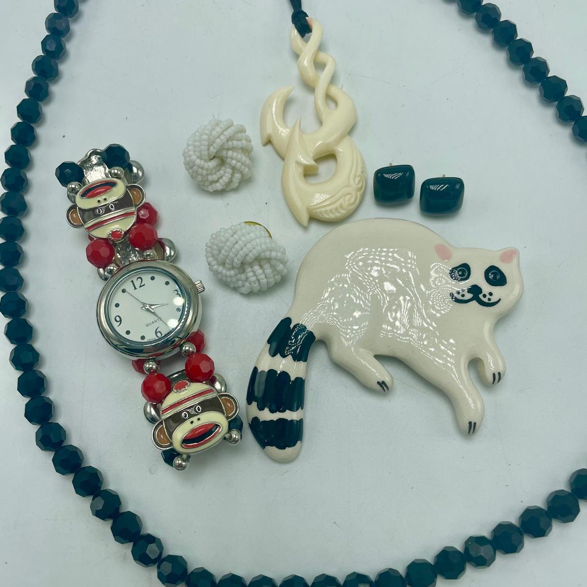 There are some great fun statement pieces here that includes a black beaded necklace, two cord with faux ivory pendant necklaces, a quartz watch (battery needs replacing), a ceramic cat brooch and four pairs of earrings for pierced ears. There is some minor crazing in the glaze on the cat.