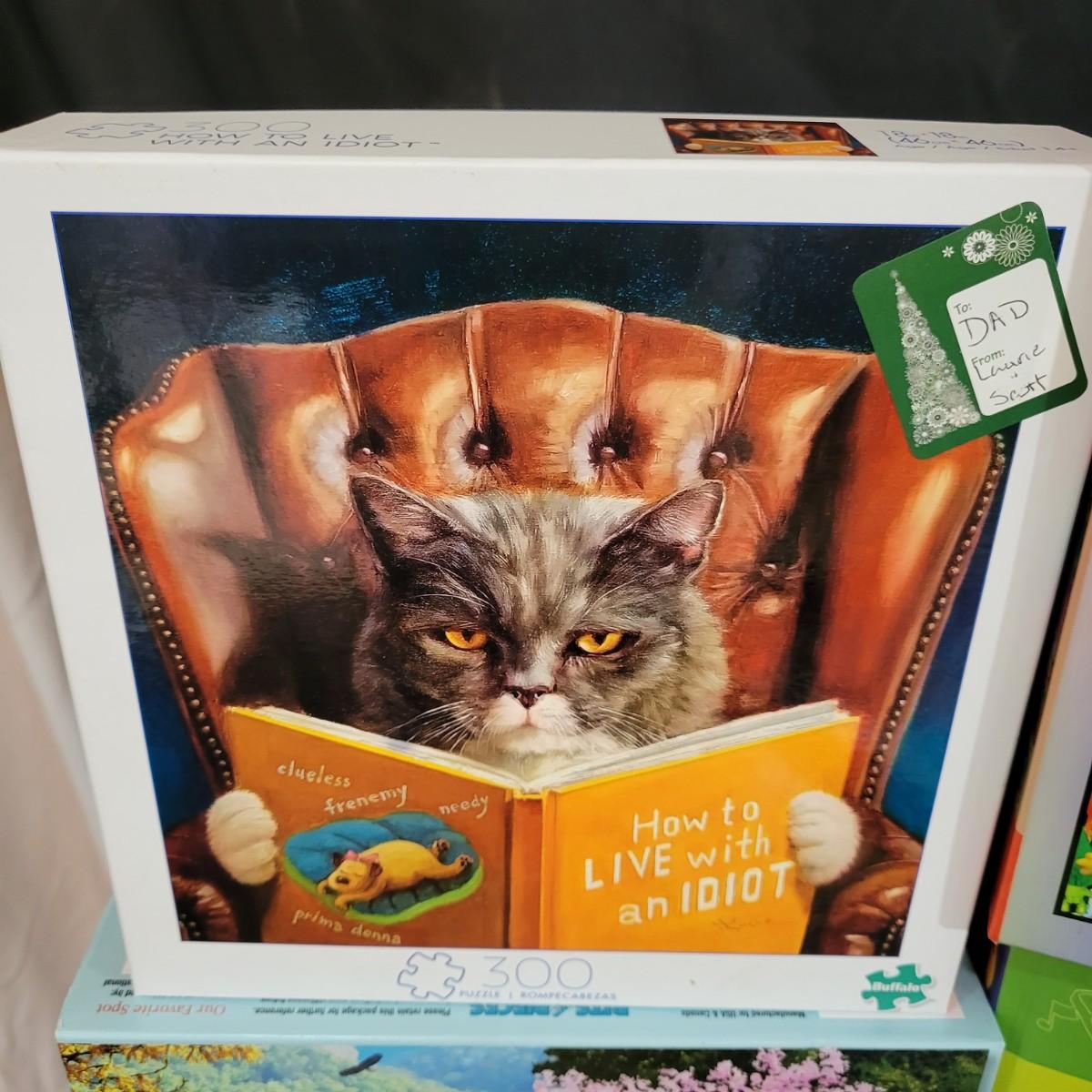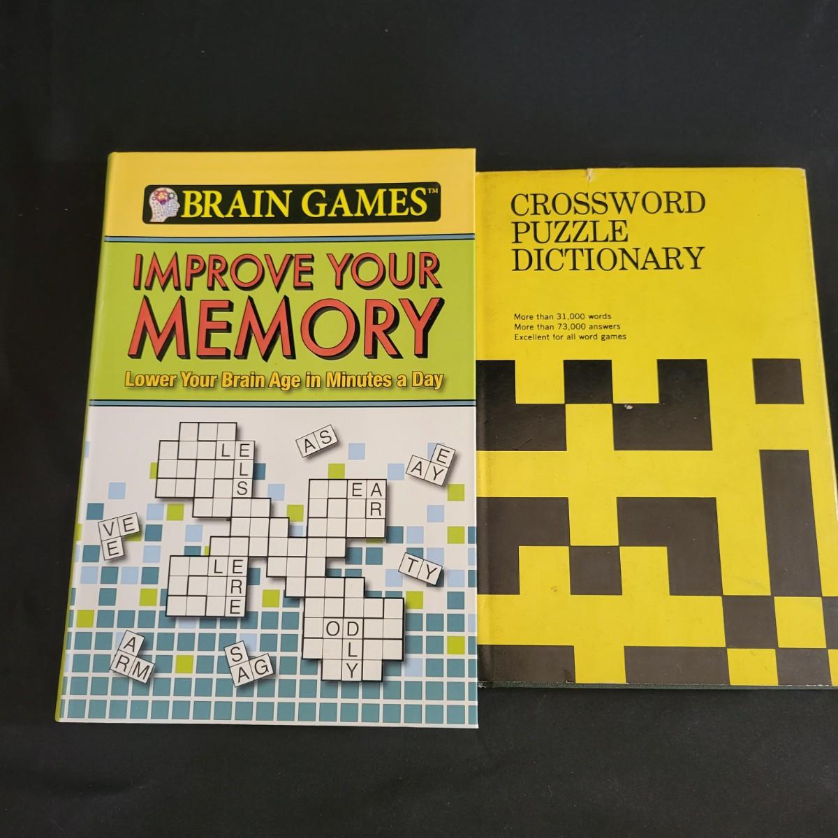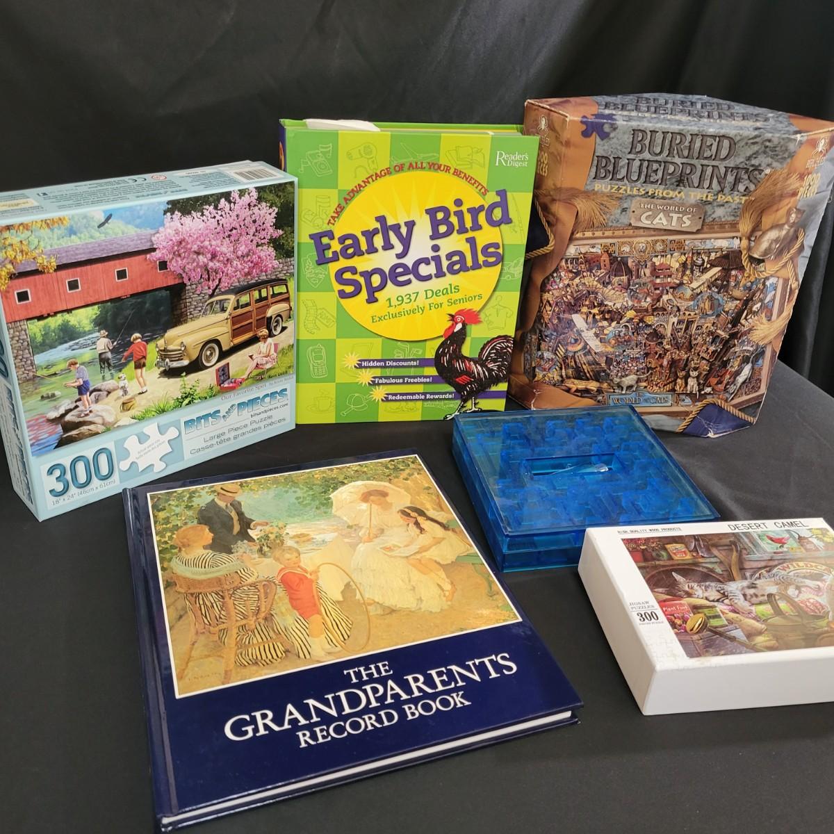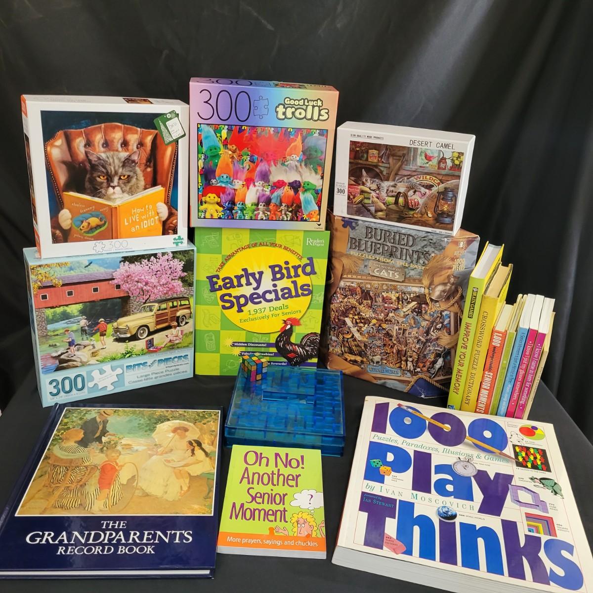 An assortment of books, puzzles and games for seniors in good condition. Lot includes five puzzles, a maze game and rubix cube, and multiple books. Approximately a dozen books are included about senior moments, crosswords, brain games and more. Local pickup only