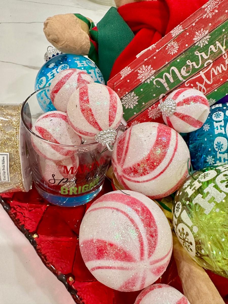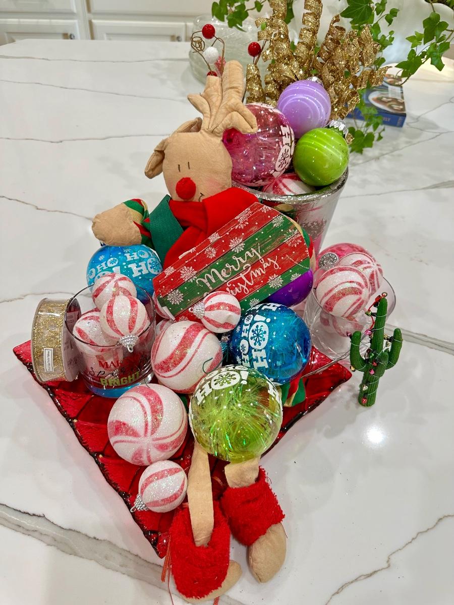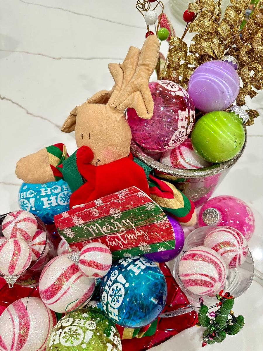 FUN cute Christmas decor. Christmas ornaments, stuffed reindeer