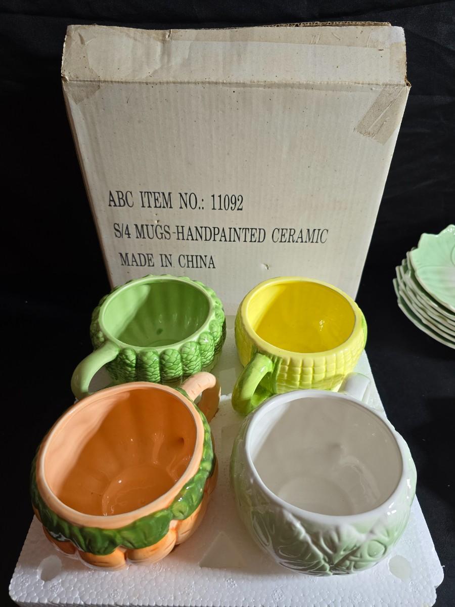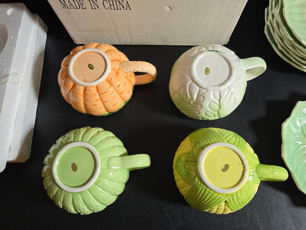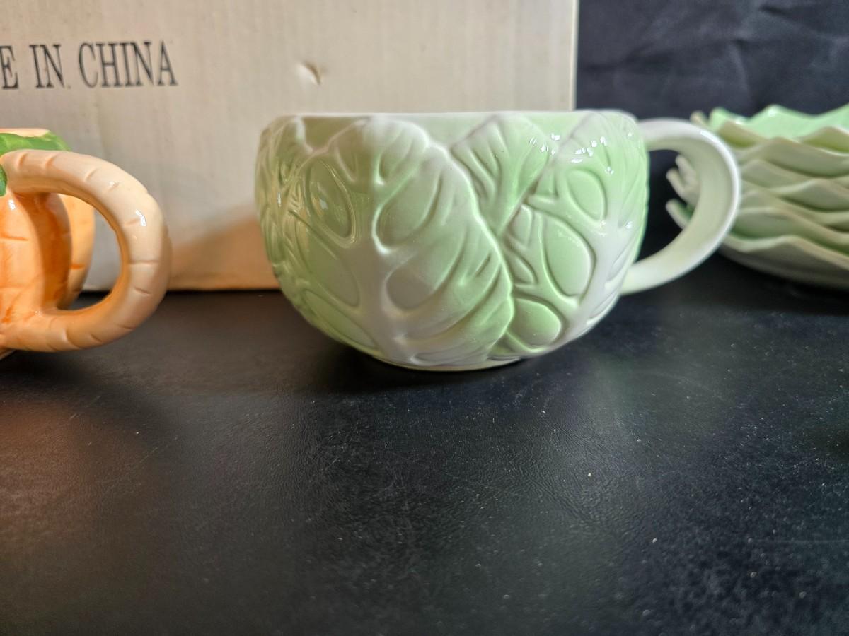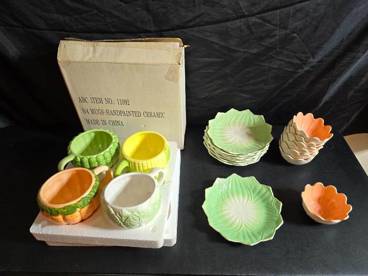 Fun dinnerware - Vegetable mugs and flower bowls with leaf plates