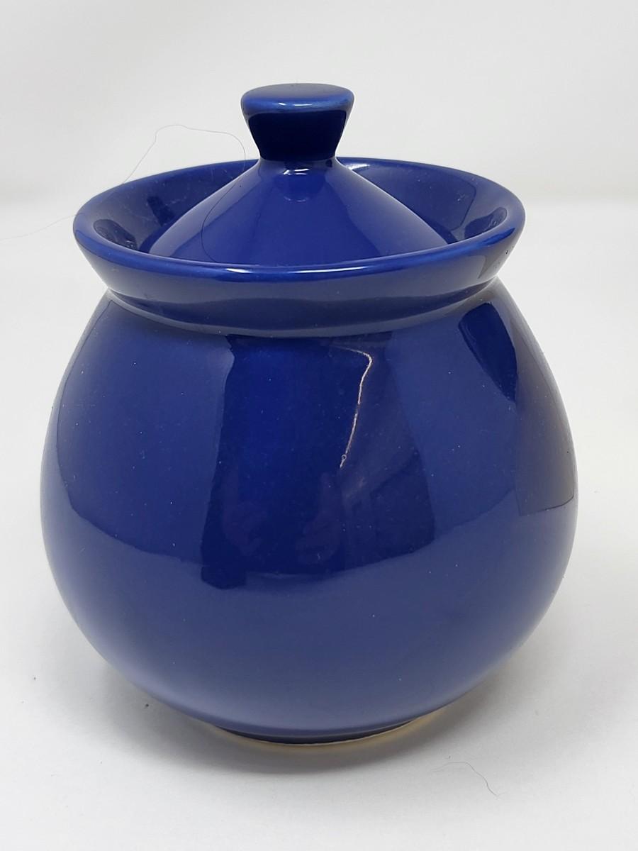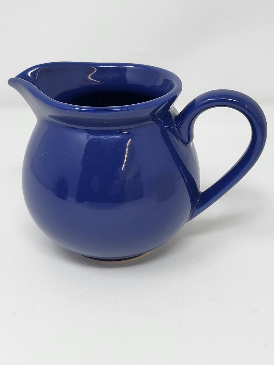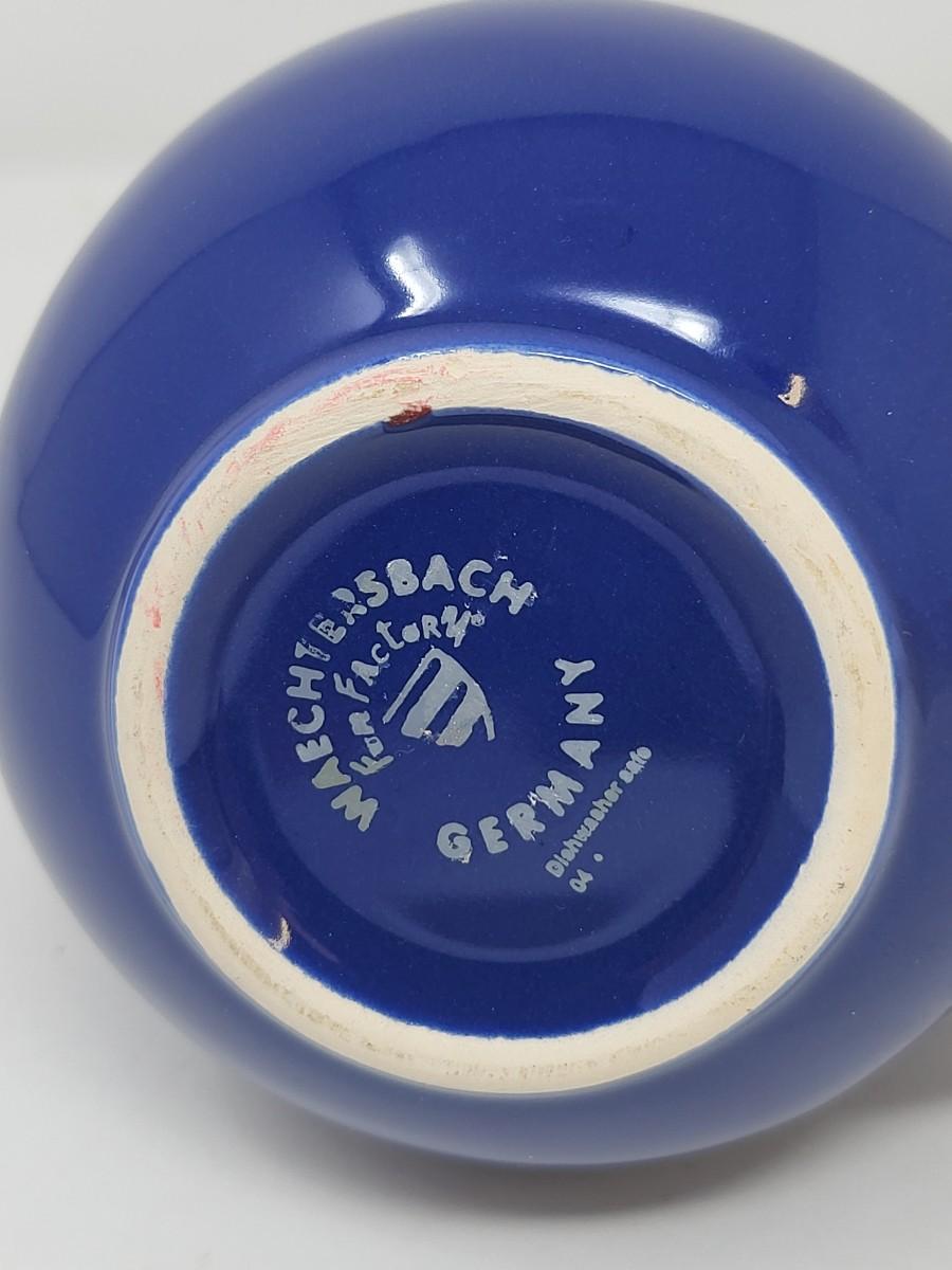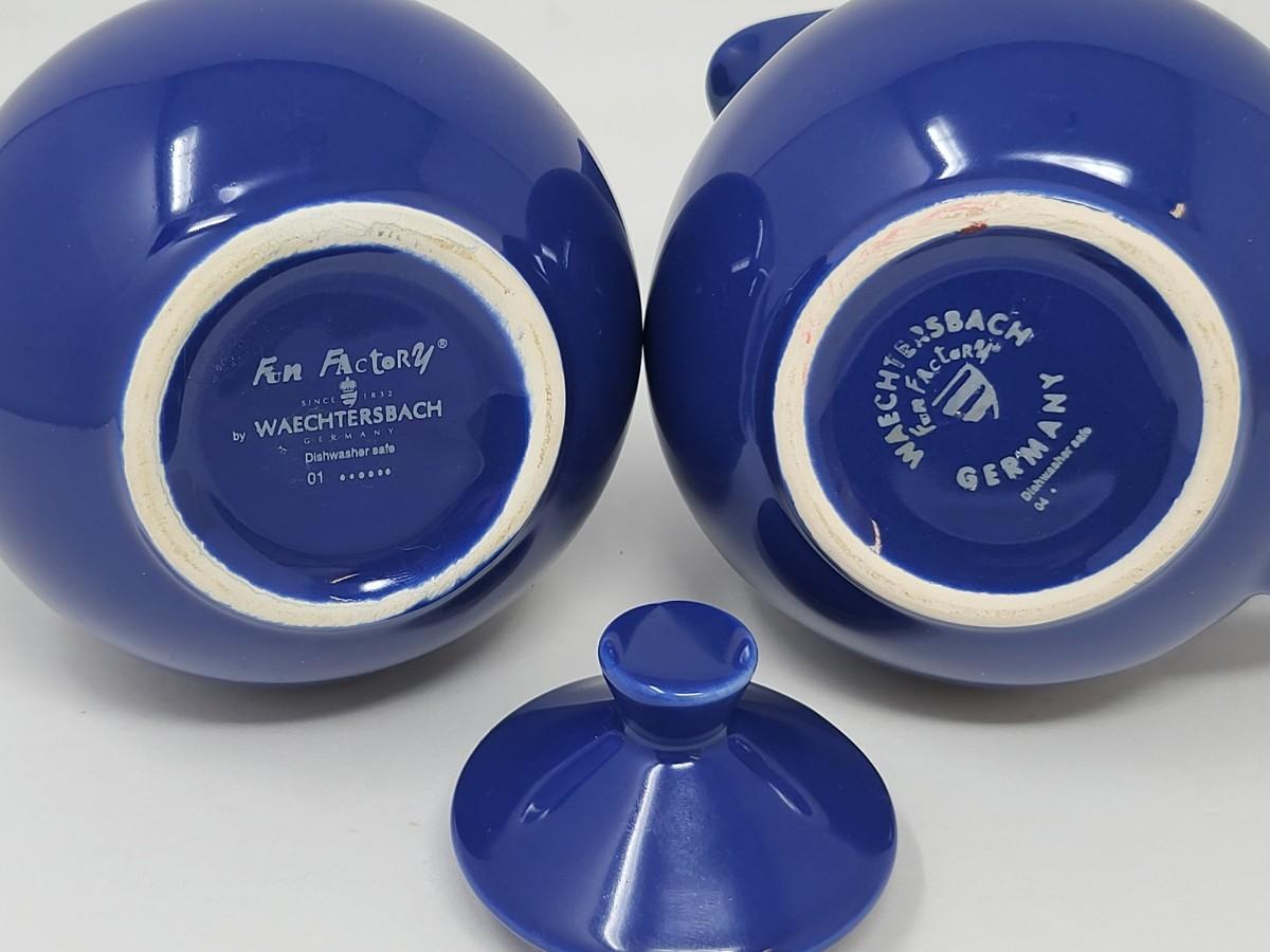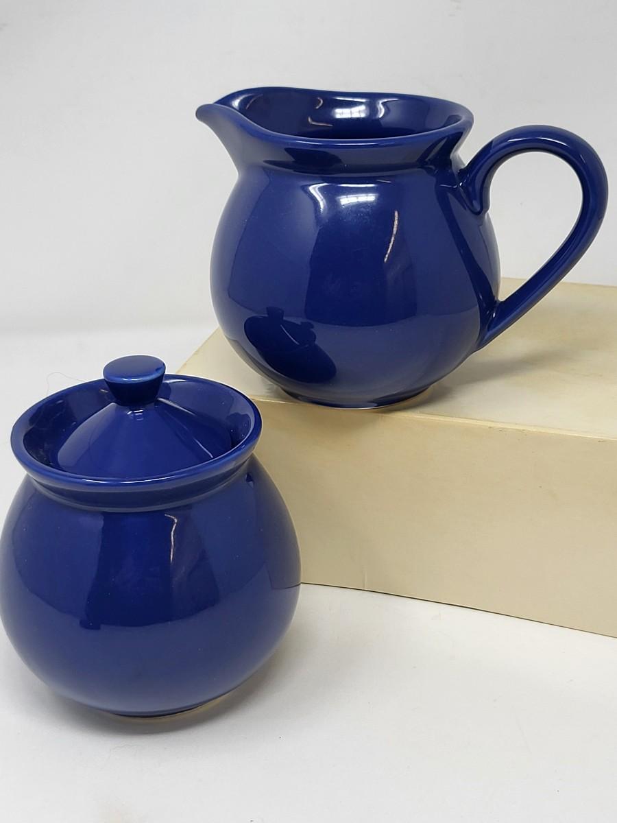 Glazed blue ceramic, 4" creamer & lidded sugar bowl. Fun Factory, Waechtersbach Germany. Excellent condition.