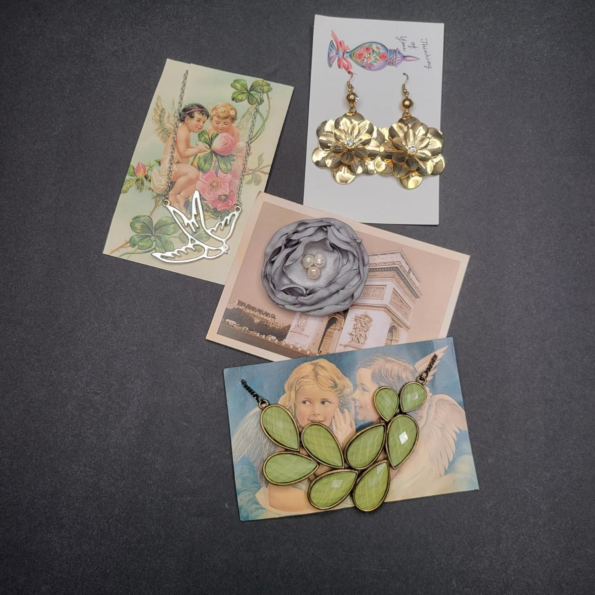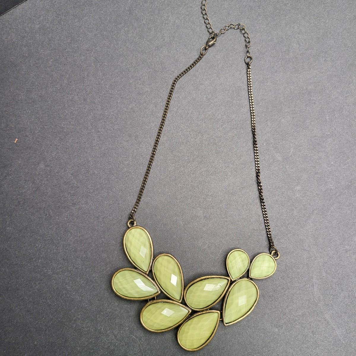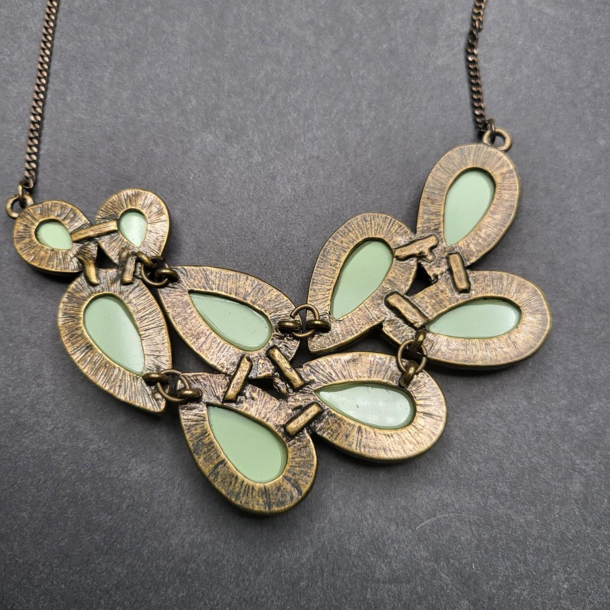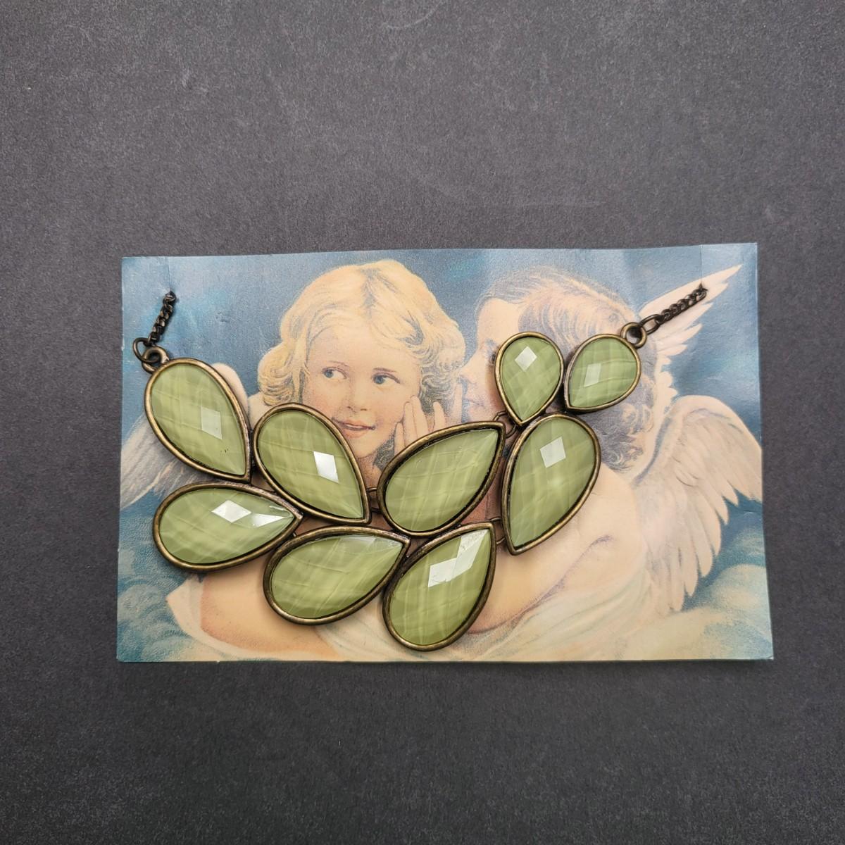 17" silvertone flying dove necklace, 17" green acrylic tear drop setting bronze tone necklace, 2.5" silk and genuine pearl pin/hair clip that looks like a birds nest, and 1.25" gold tone flower dangle earrings with clear rhinestones.