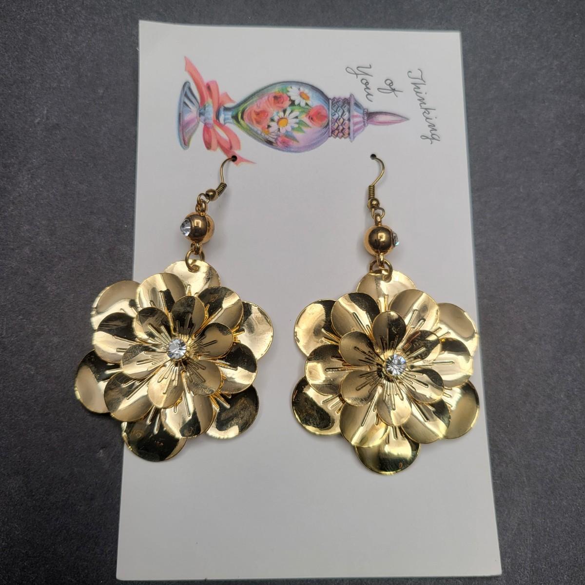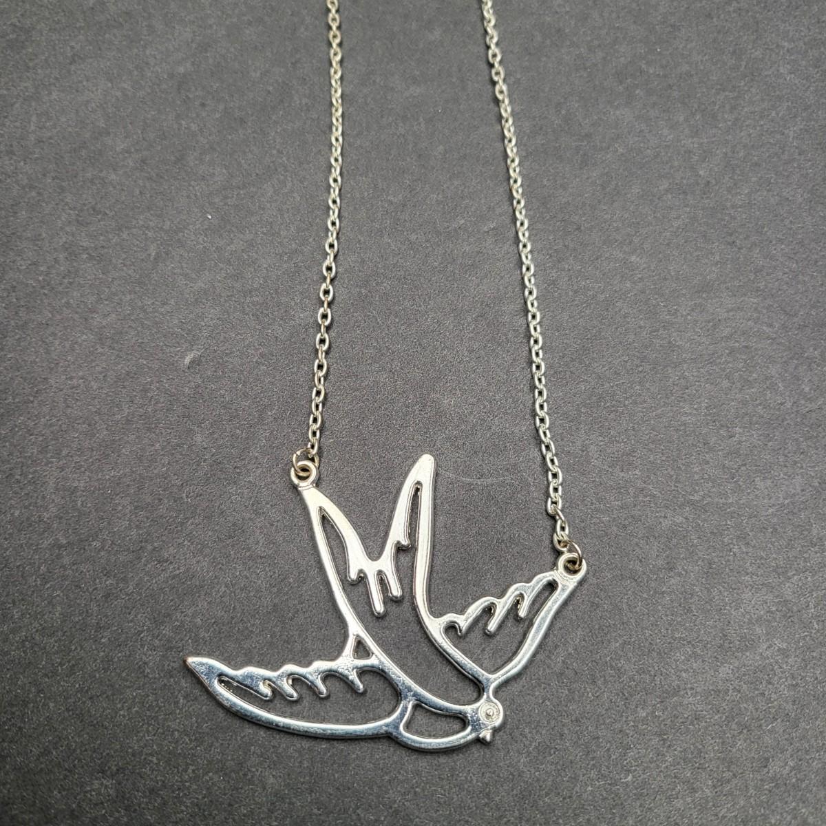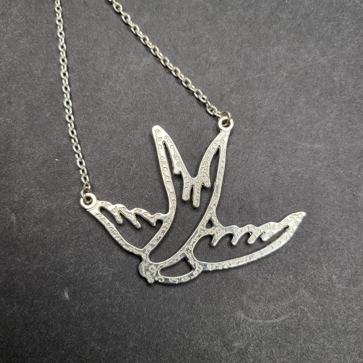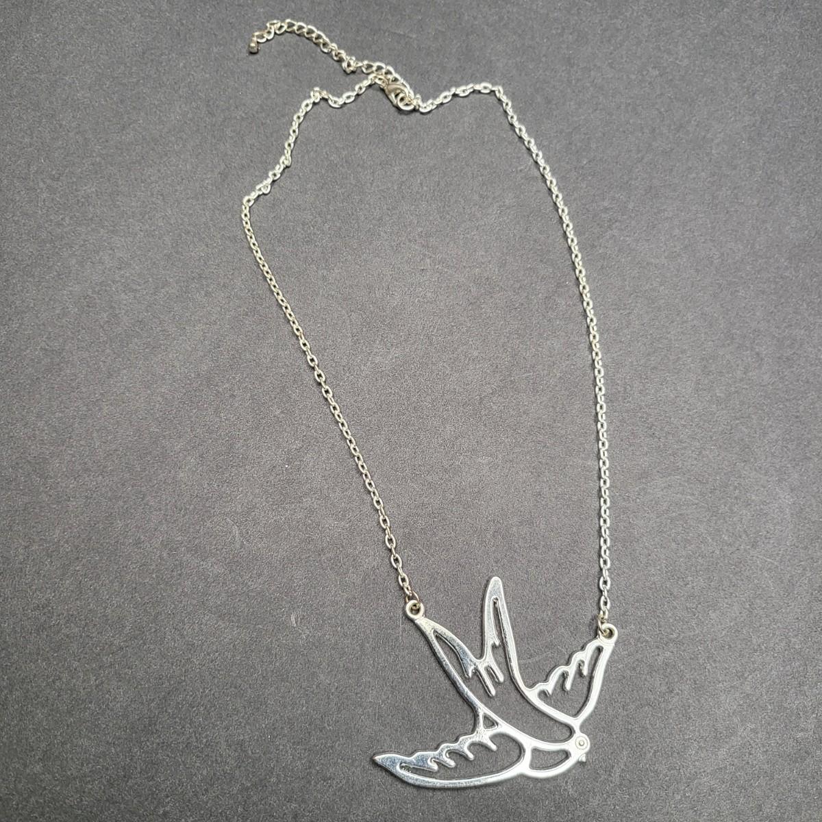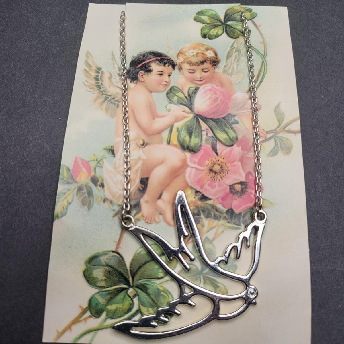 17" silvertone flying dove necklace, 17" green acrylic tear drop setting bronze tone necklace, 2.5" silk and genuine pearl pin/hair clip that looks like a birds nest, and 1.25" gold tone flower dangle earrings with clear rhinestones.
