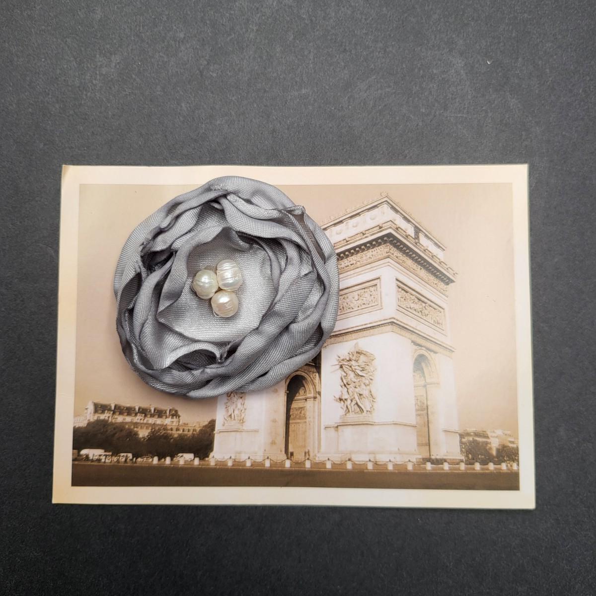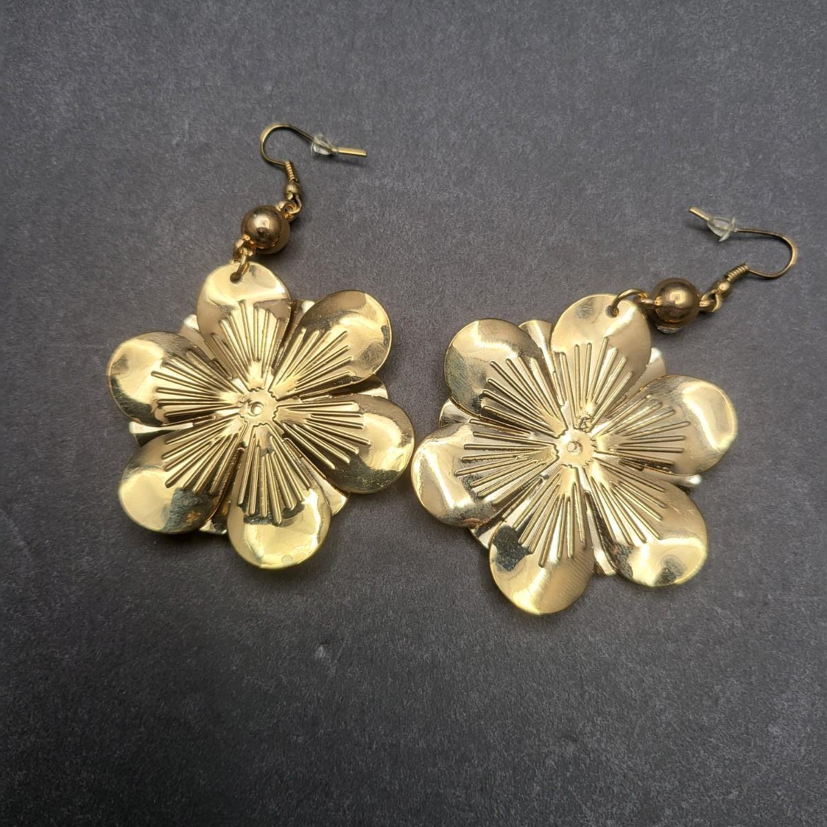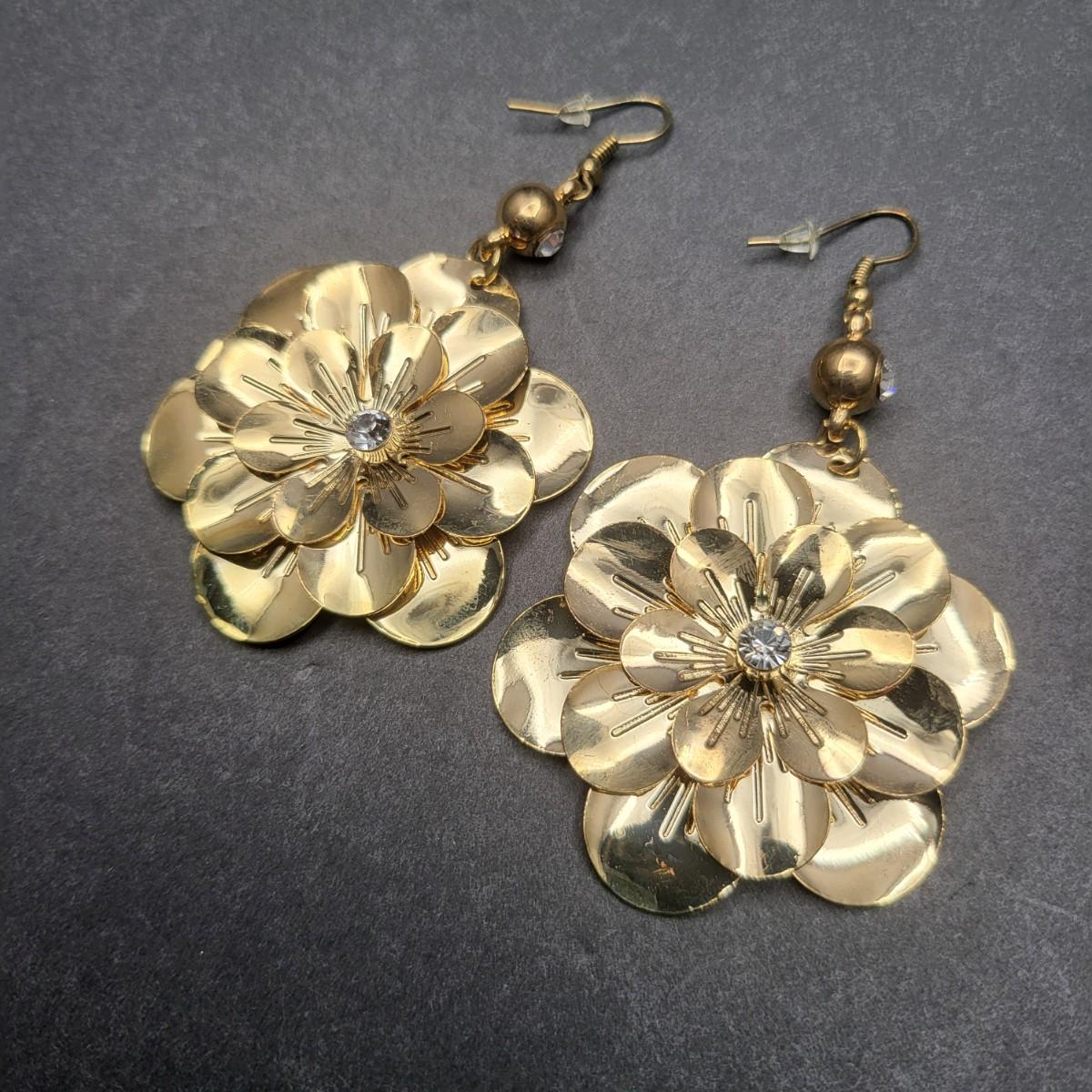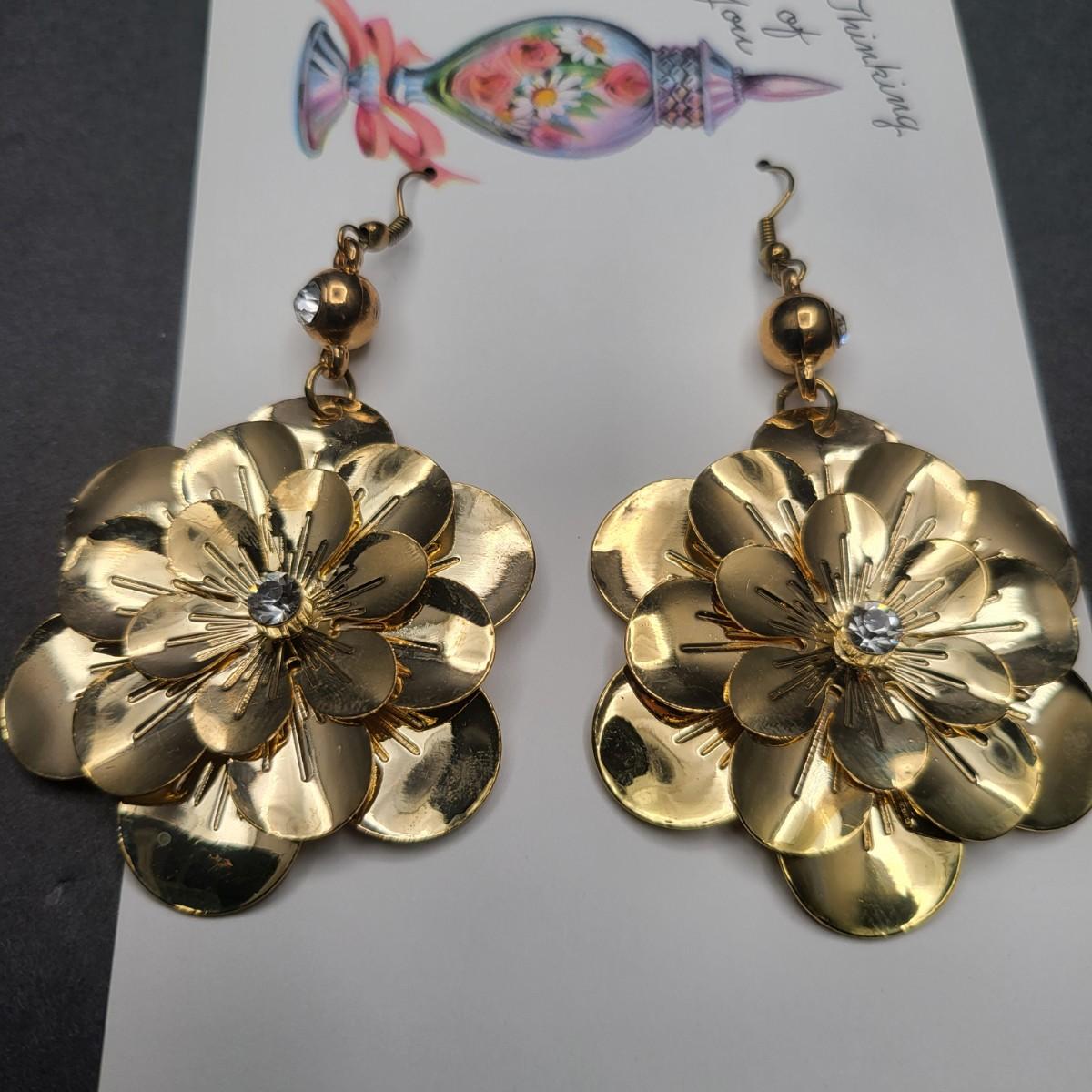 17" silvertone flying dove necklace, 17" green acrylic tear drop setting bronze tone necklace, 2.5" silk and genuine pearl pin/hair clip that looks like a birds nest, and 1.25" gold tone flower dangle earrings with clear rhinestones.
