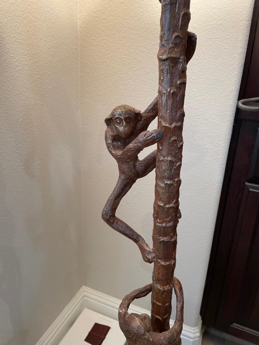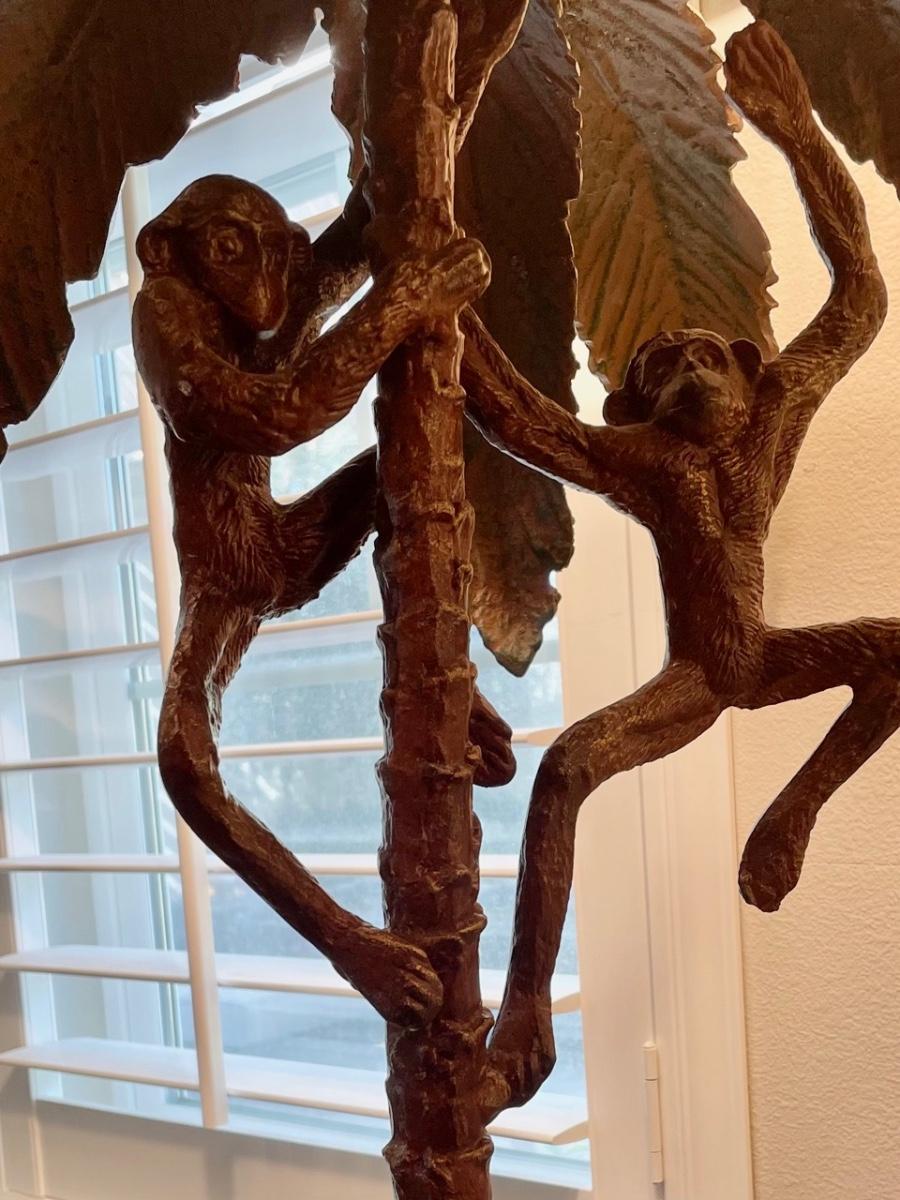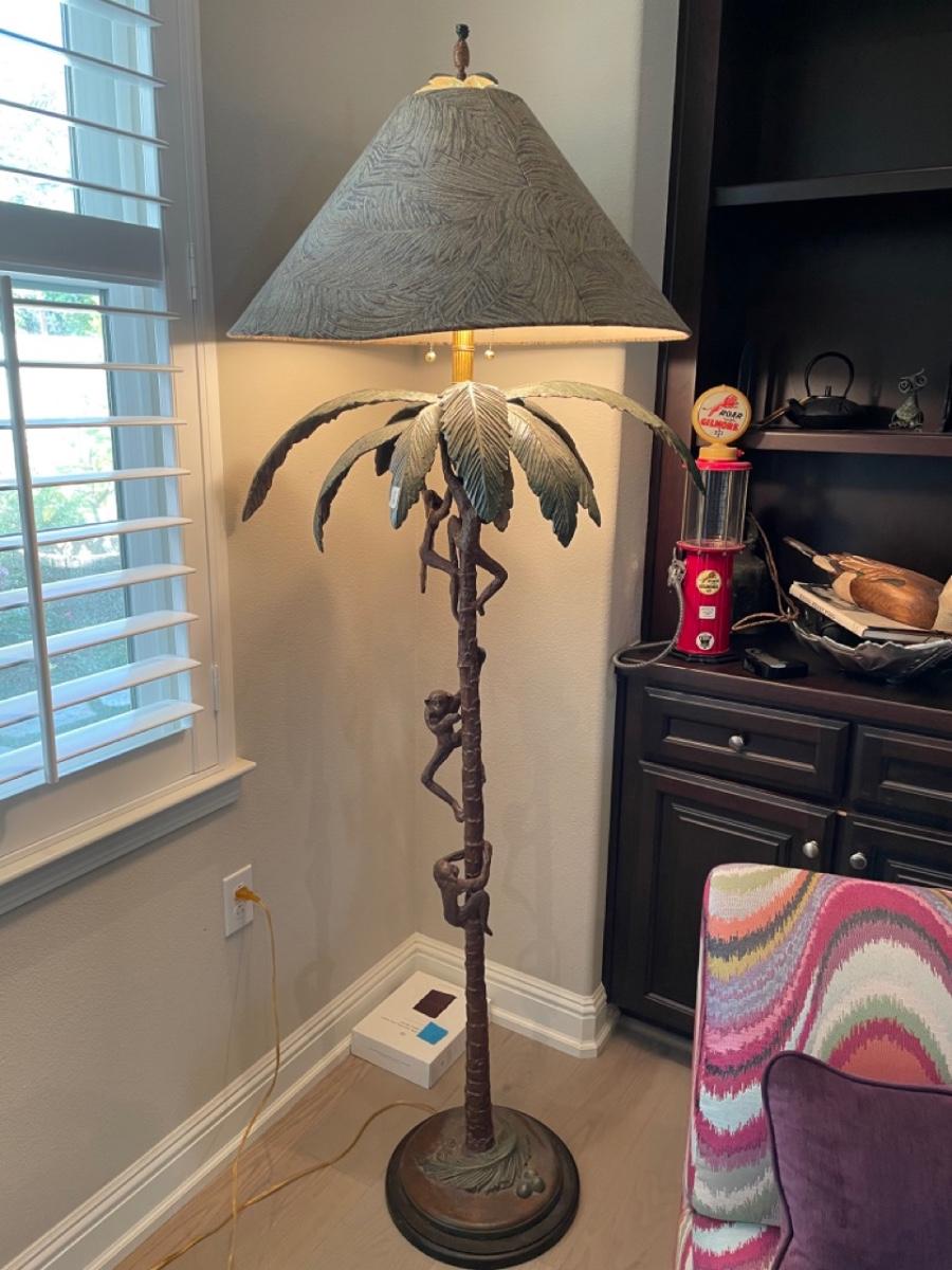Fun monkey motif with palm leaves and decorative shade. Metal floorlamp in good working condition.