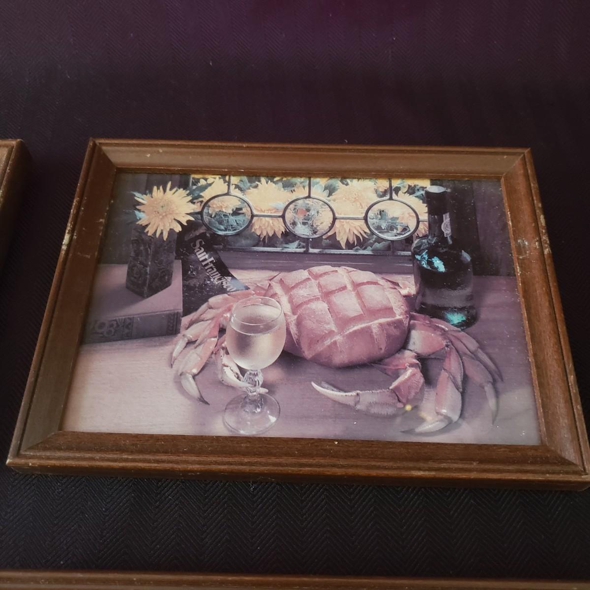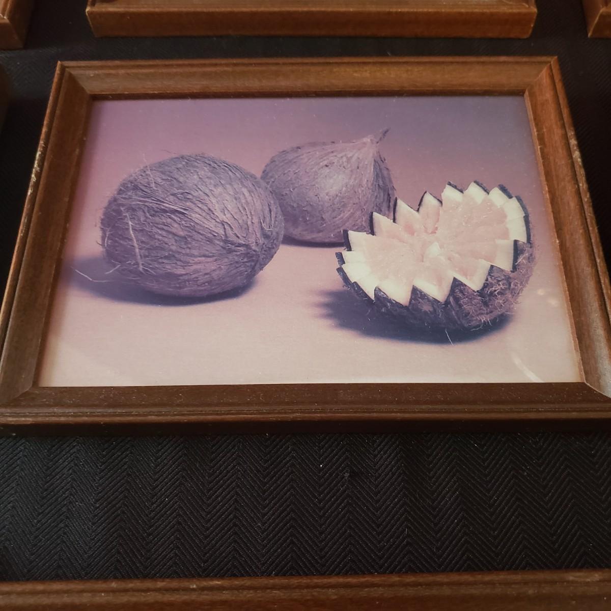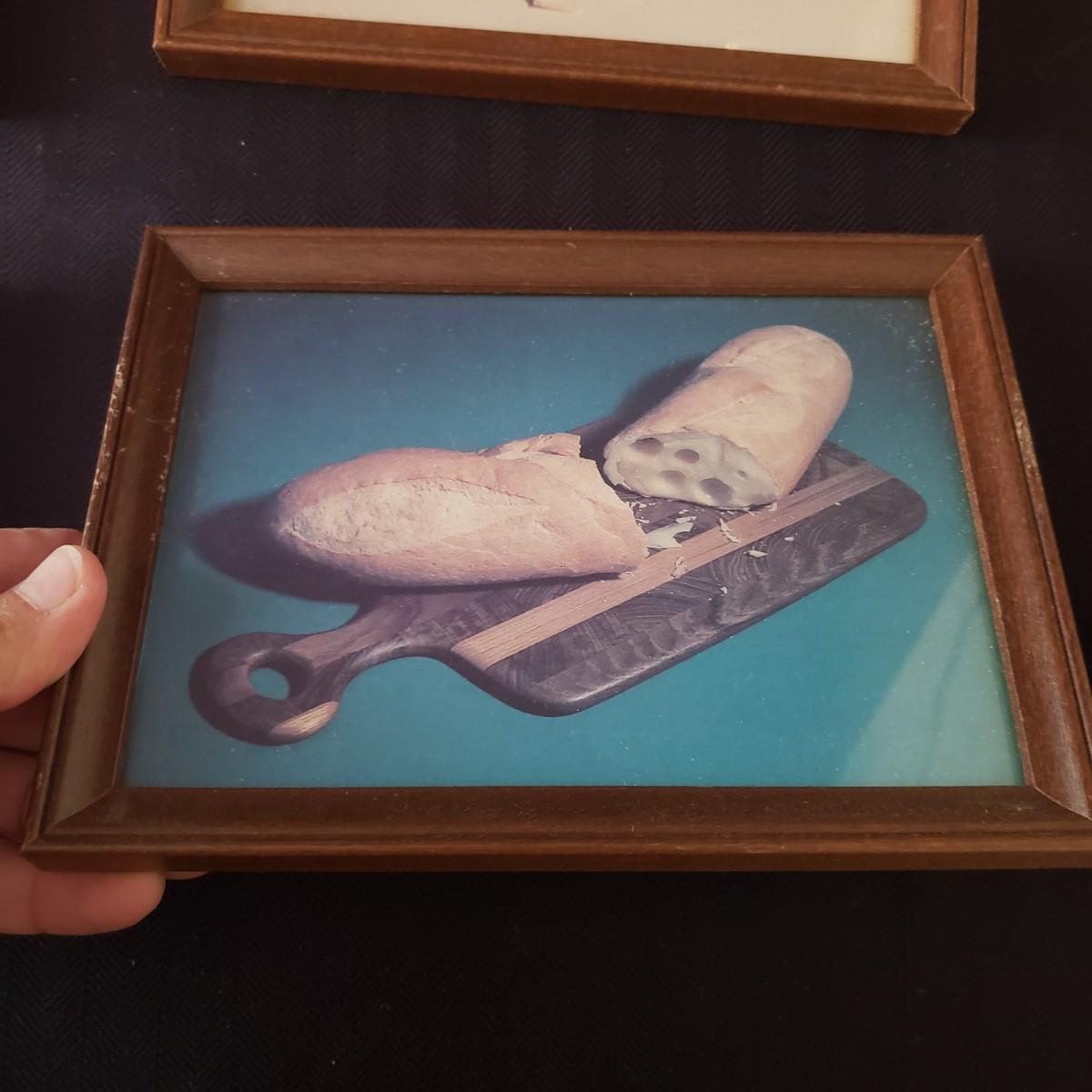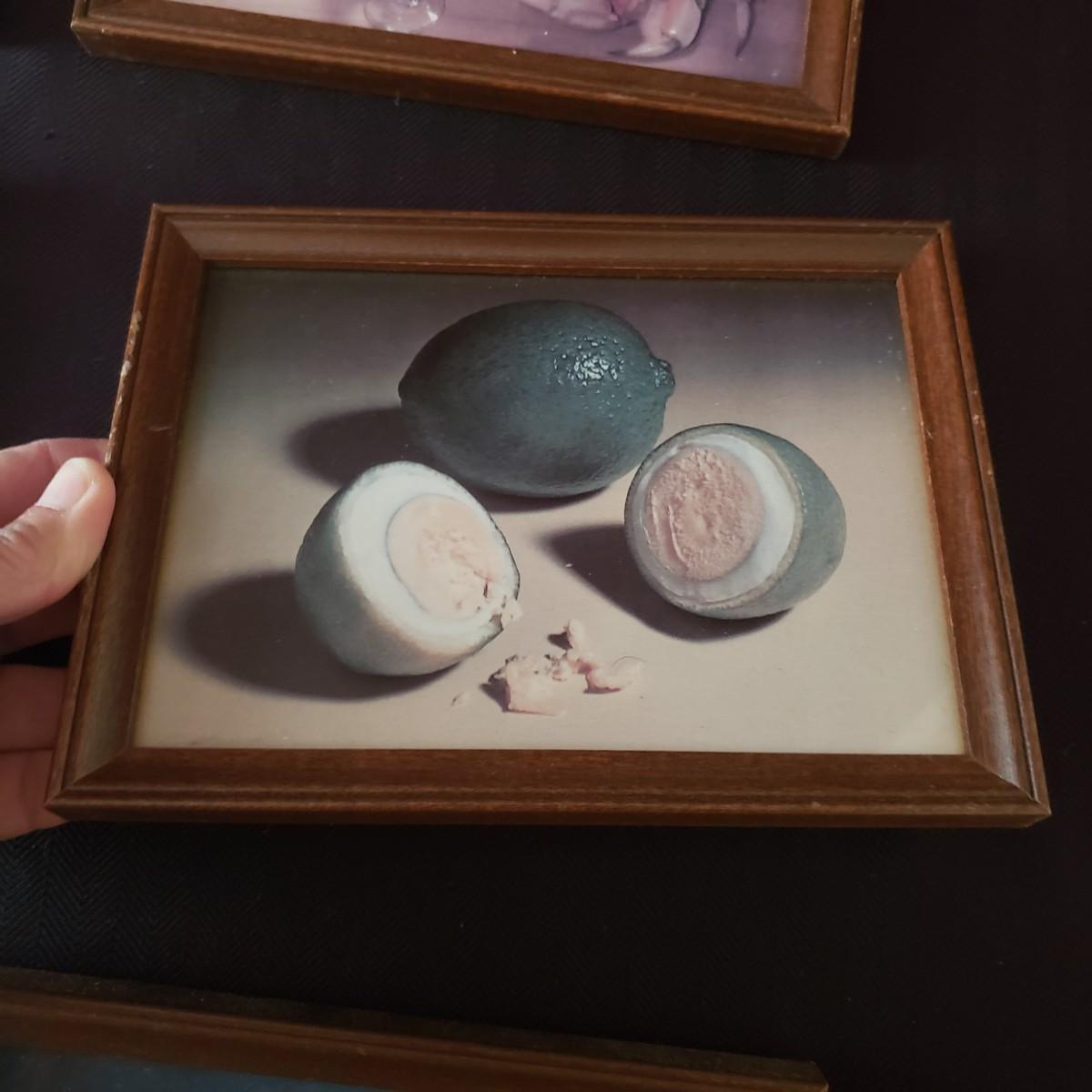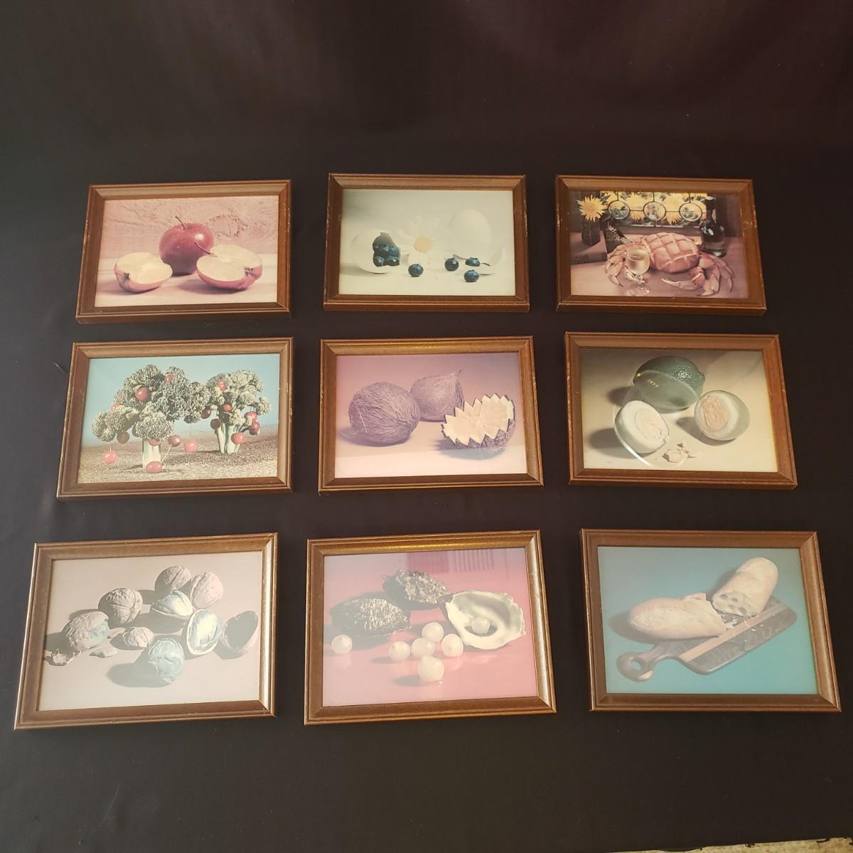 This nine piece lot features a fun twist on our favorite foods! Each vintage photograph blends two foods together in a wooden frame. The frames with glass each measure 8" x 6". Each frame shows some wear due to their age, see last pictures of some examples.