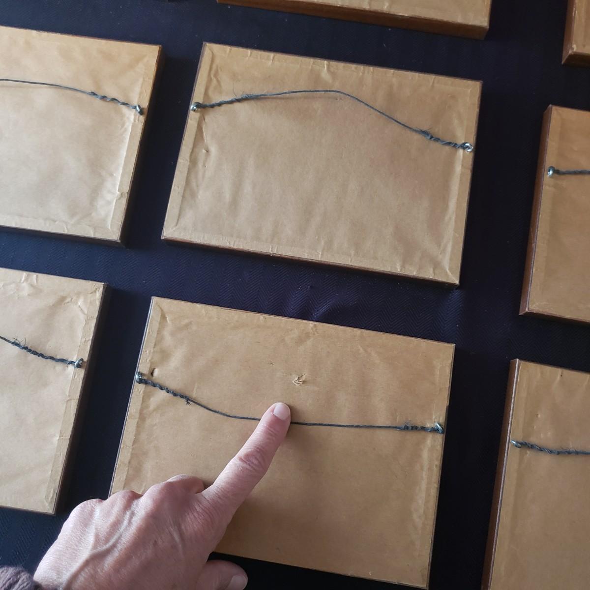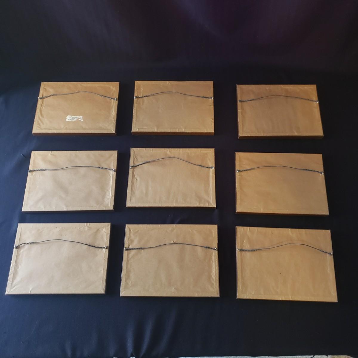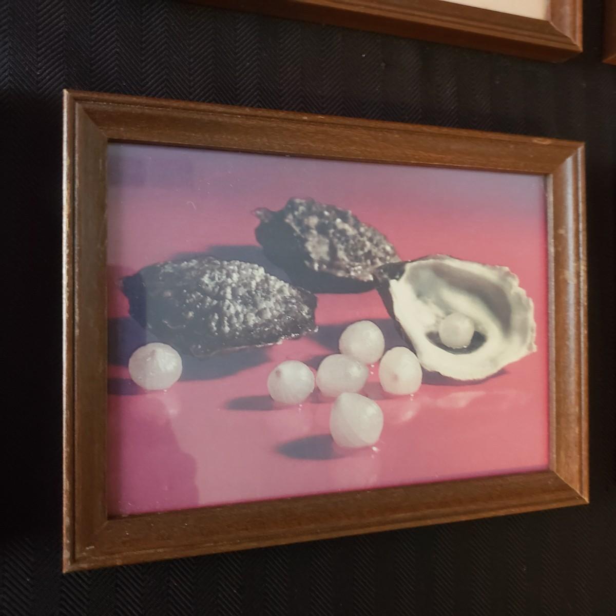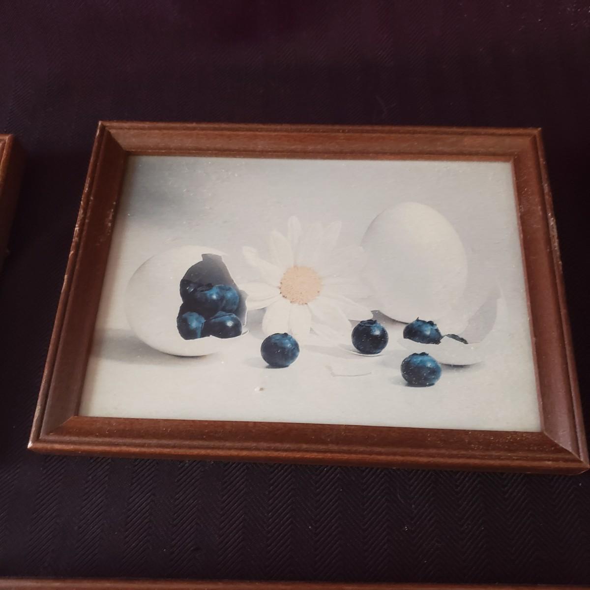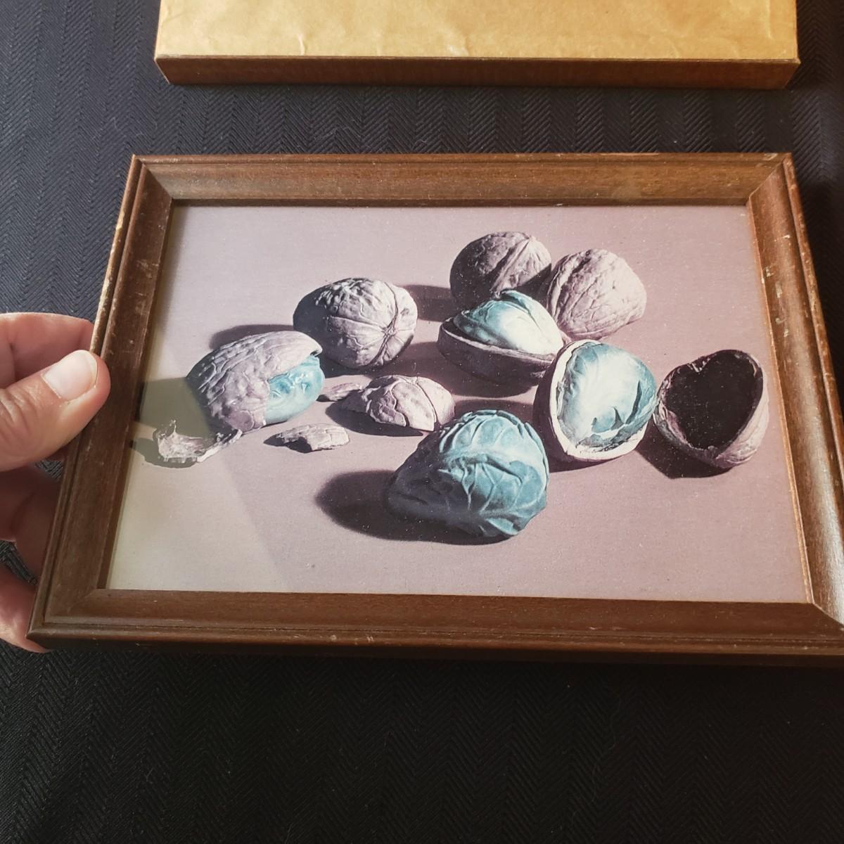 This nine piece lot features a fun twist on our favorite foods! Each vintage photograph blends two foods together in a wooden frame. The frames with glass each measure 8" x 6". Each frame shows some wear due to their age, see last pictures of some examples.