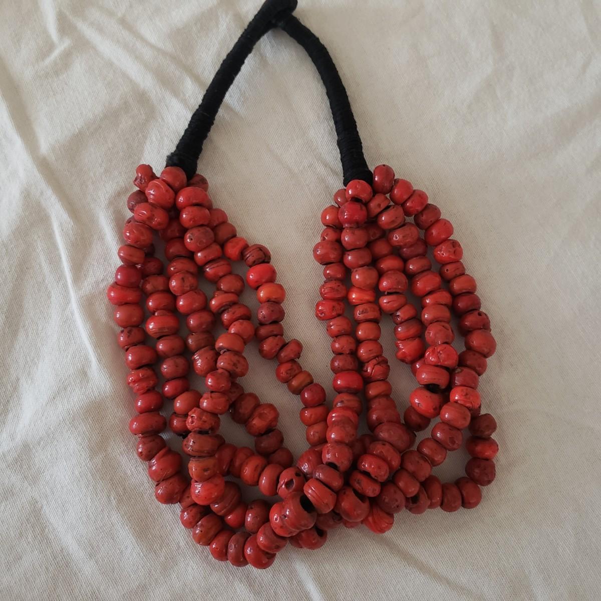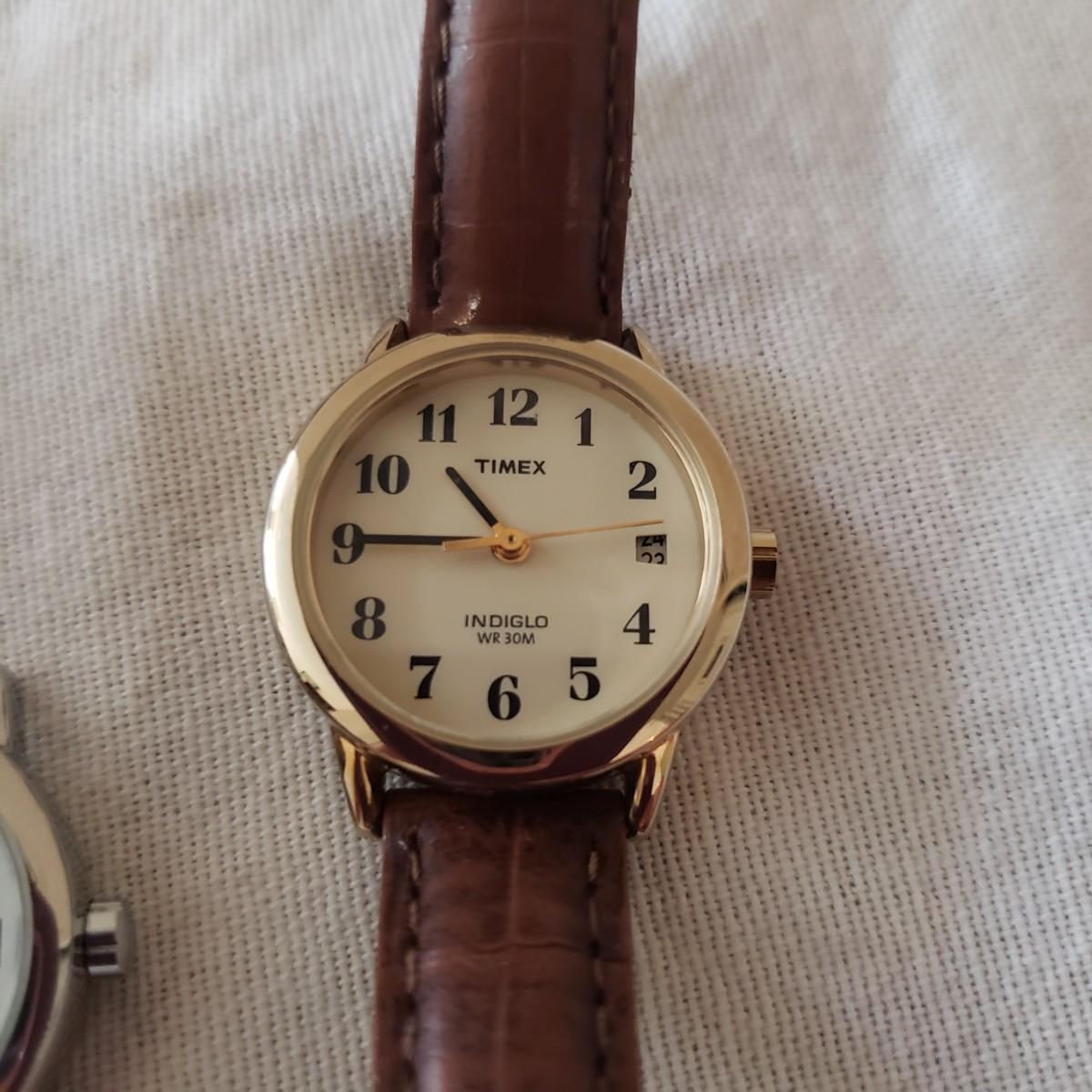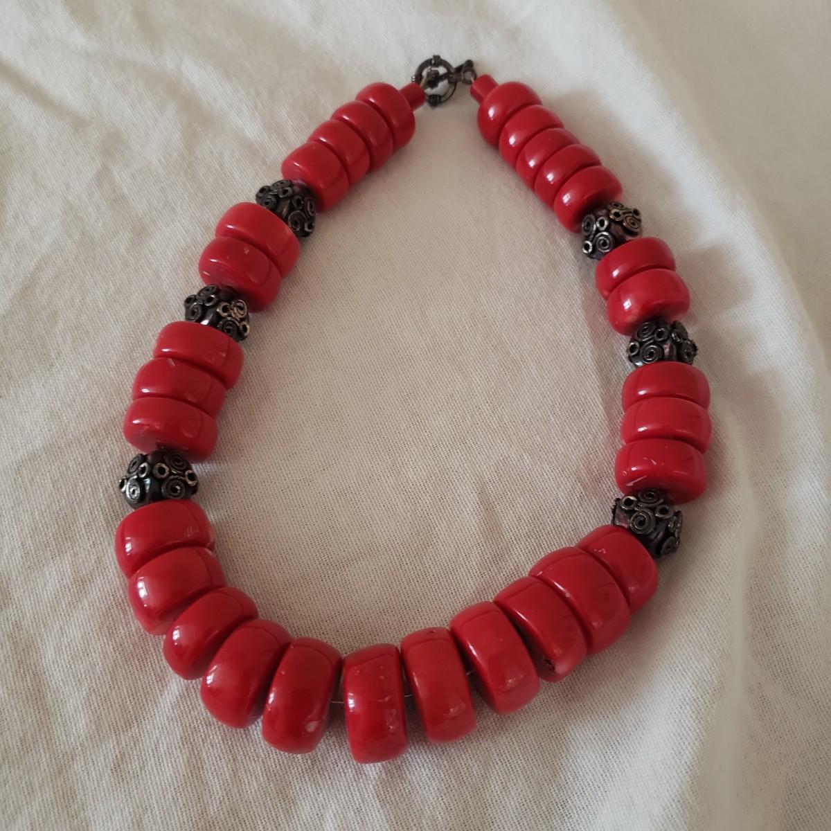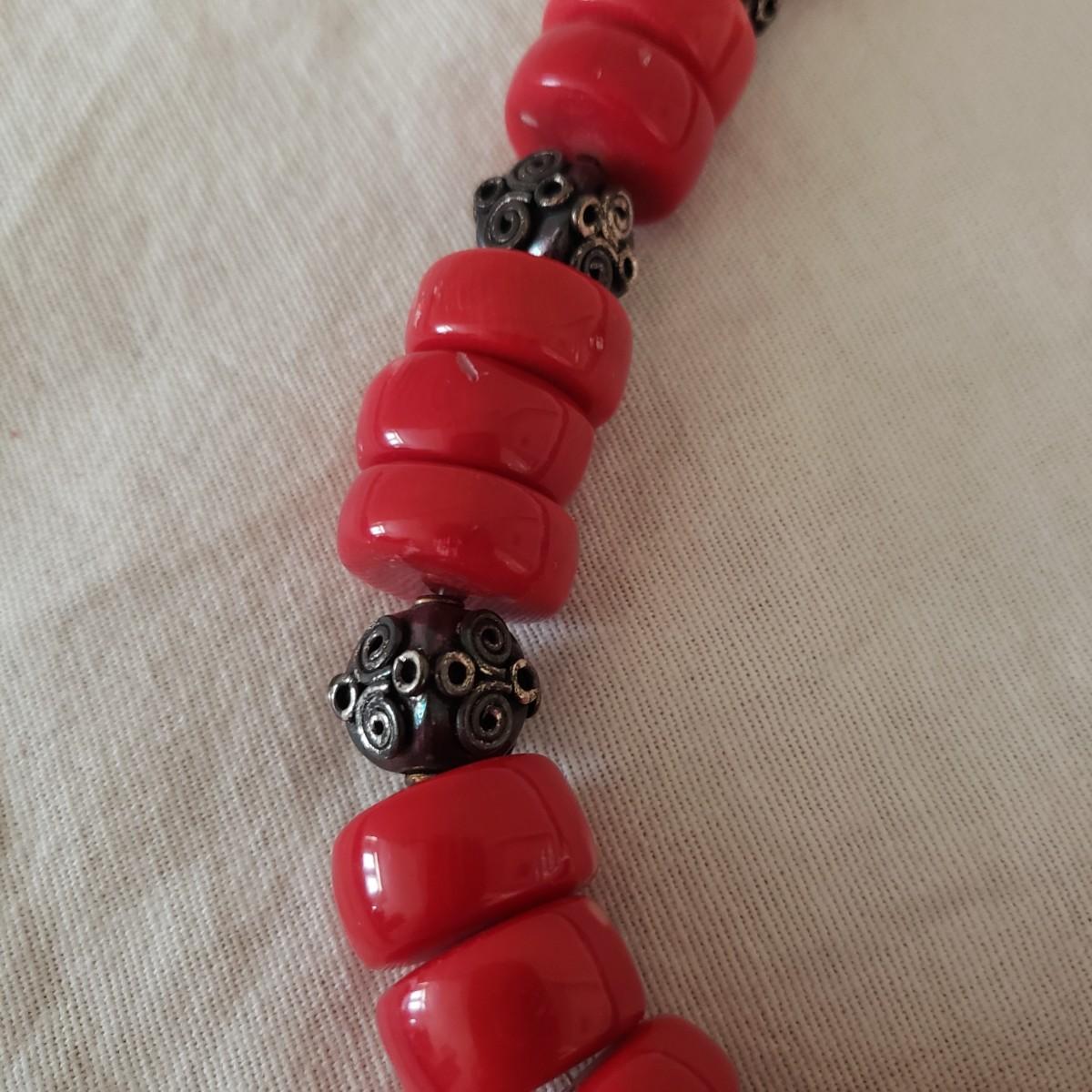 This jewelry lot has some fun, funky pieces, as well as practical Timex watches. The red necklaces are on the heavy side and measure approximately 9" for the multistrand necklace. The blue beaded necklace with the silver like cross measures 18". The sterling silver necklace is marked on the clasp. It was difficult to photograph. The pink felted flower has a metal center. The scarf feels like silk, but no tags were found.