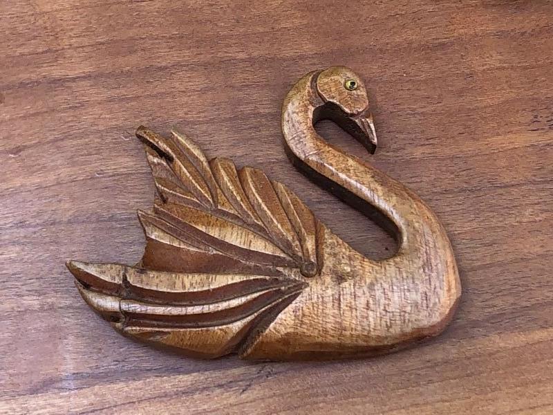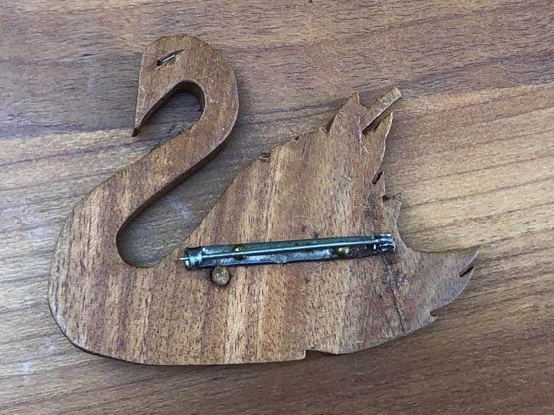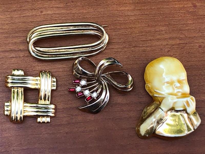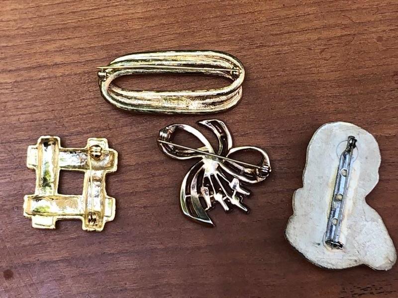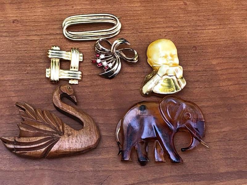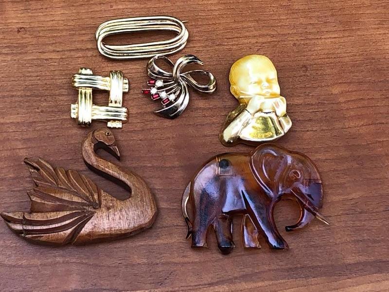 6 Unique Vintage Pins. Gold Tone, Wood, Acrylic, Porcelain and Rhinestone Pieces.