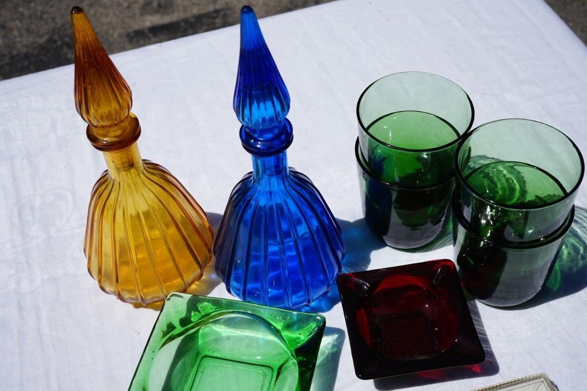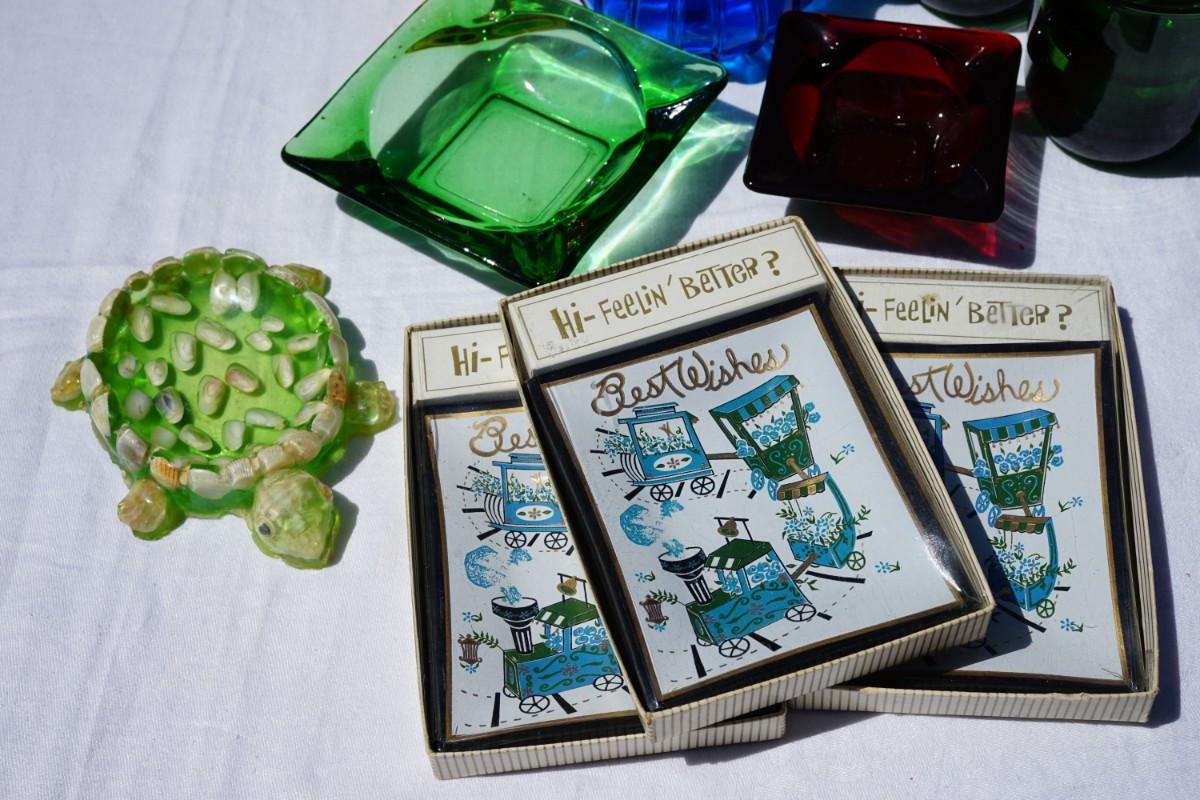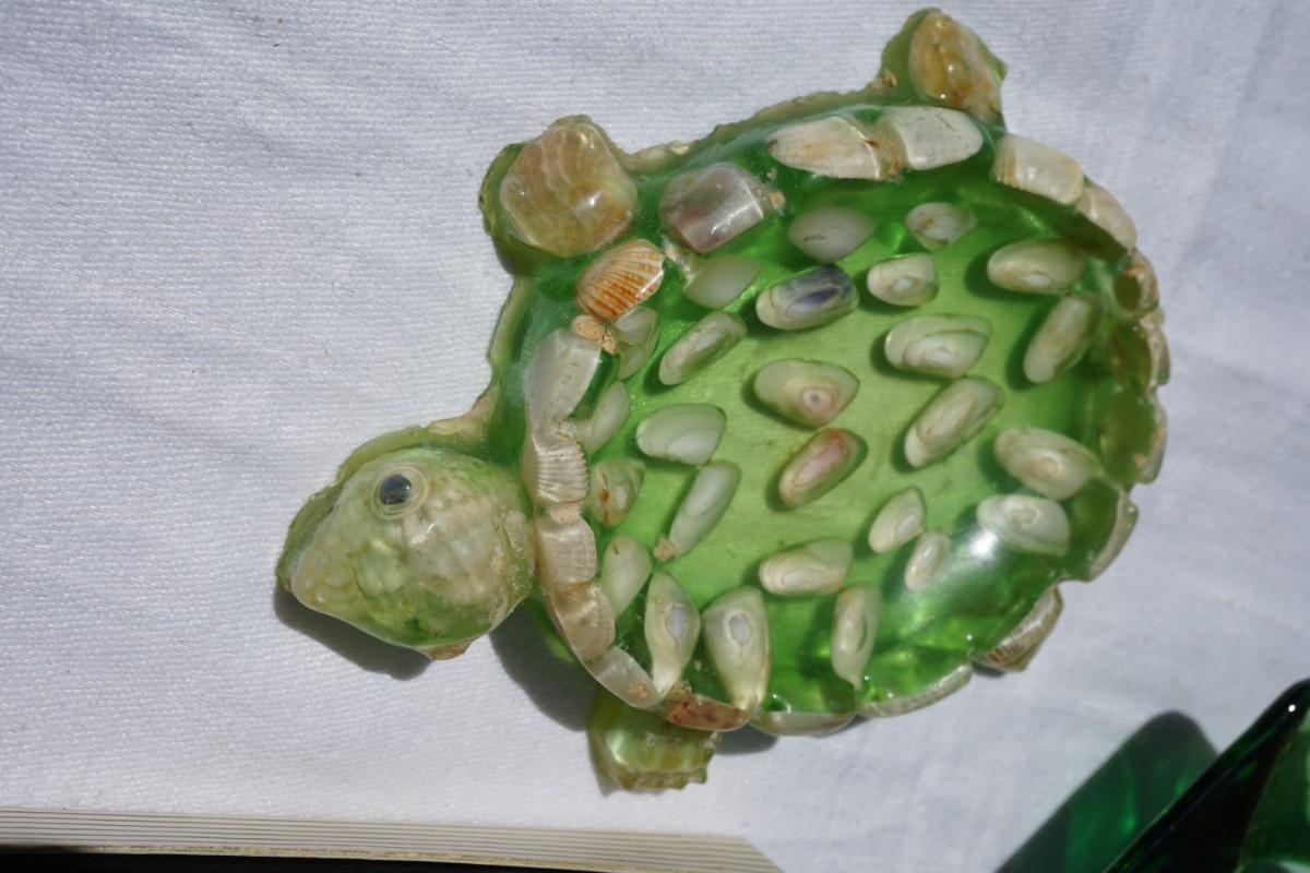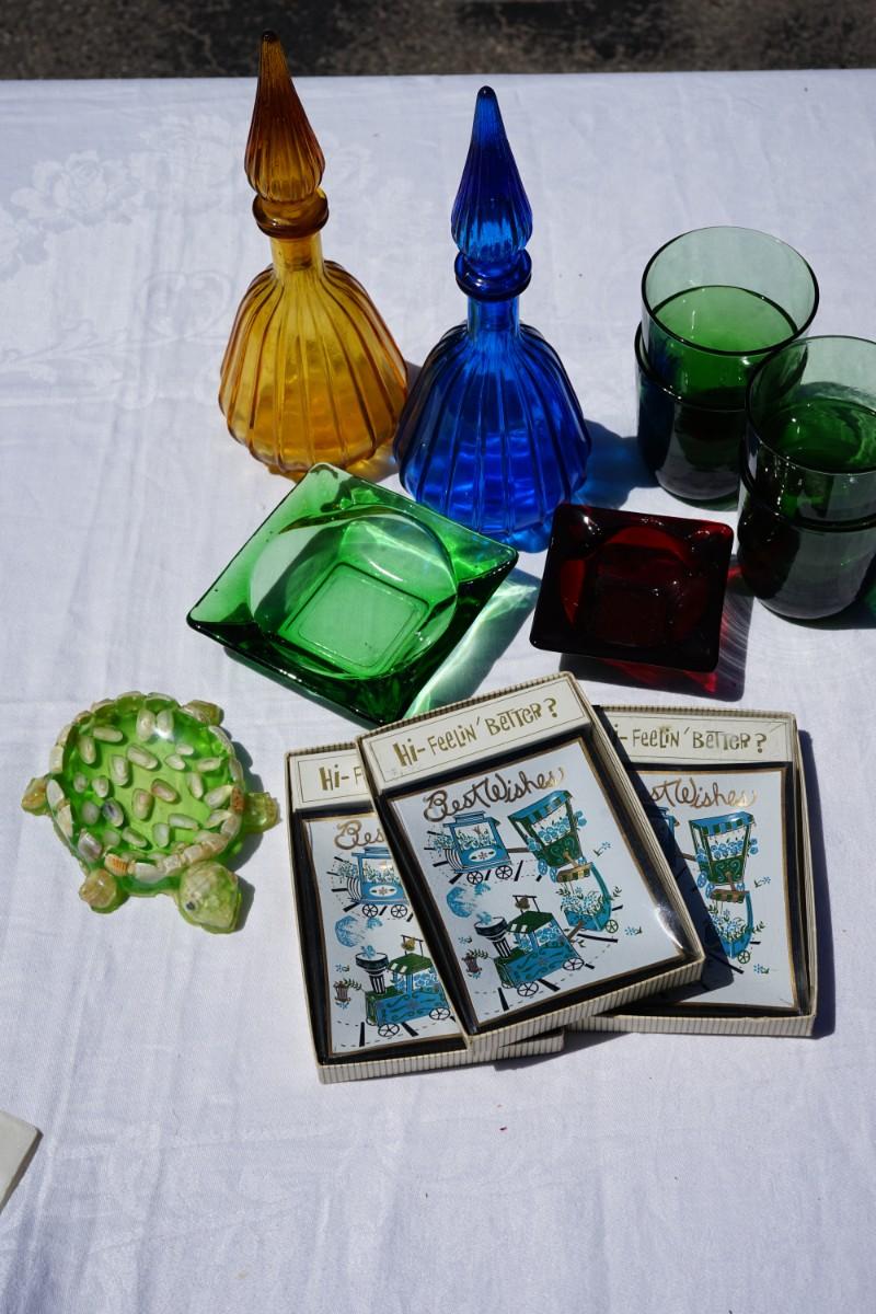 FUN GROUPING OF VINTAGE GLASS ITEMS TO INCLUDE/ HOSTESS TRAYS BEST WISHES/LUCITE TURTLE