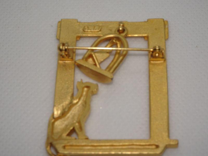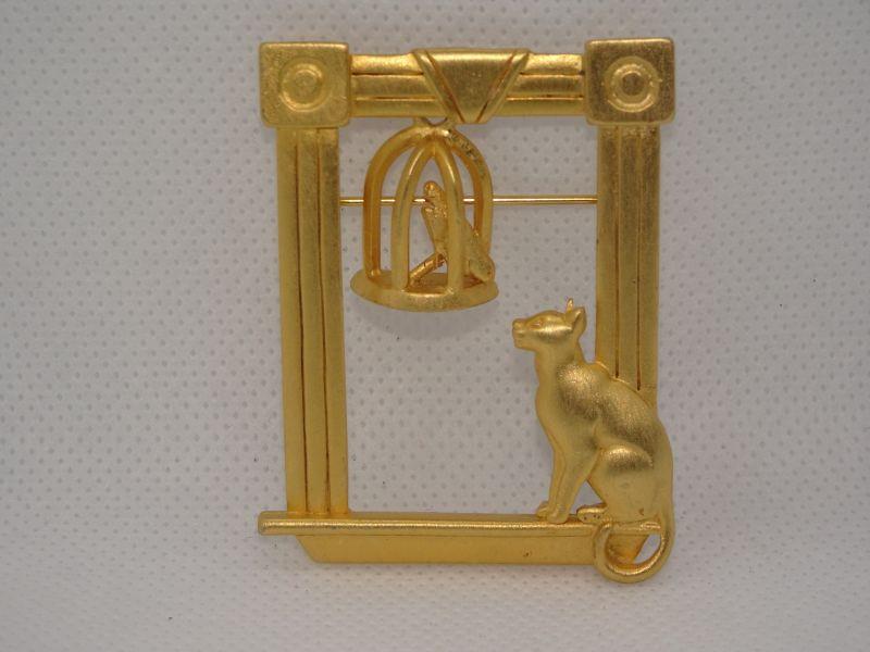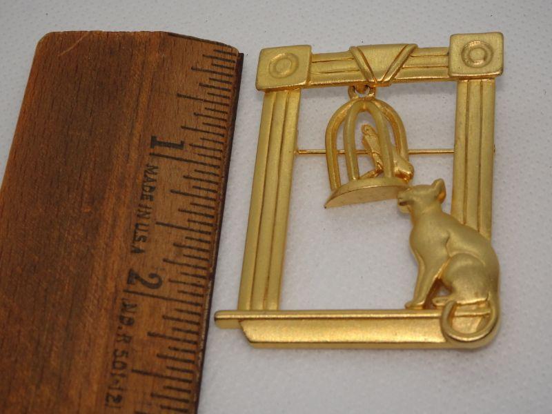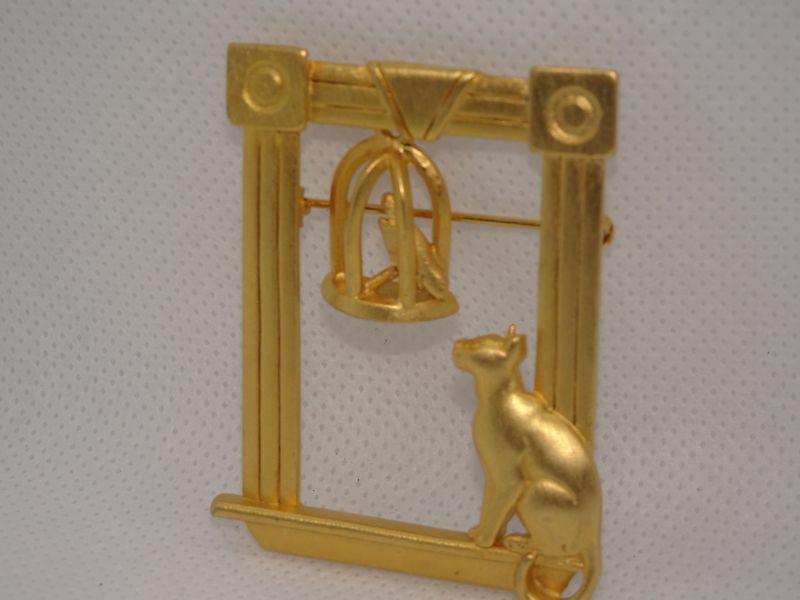 Fun Kitten checking out the birdy in the cage Brooch, Gold Tone