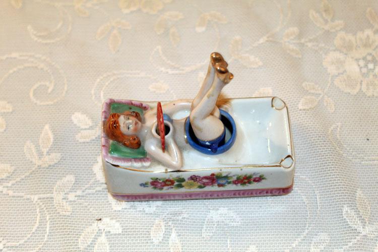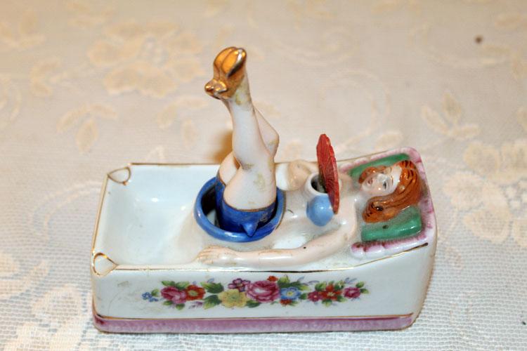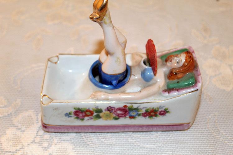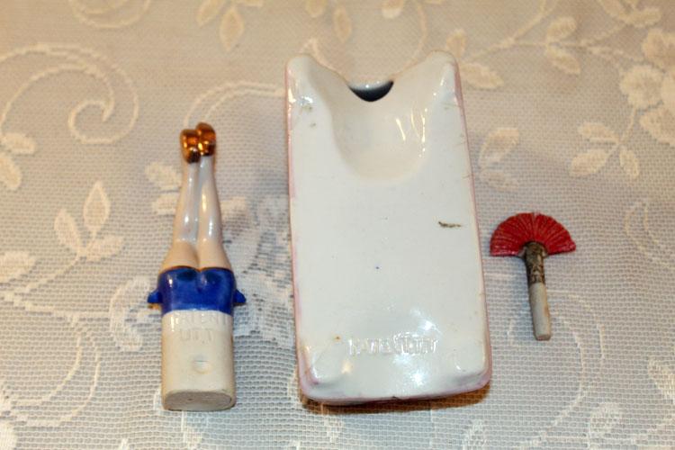 Fun Naughty Lady Japanese import ceramic, fan and legs move. Don't know if this is a ink well or a cigarette tray or just a dust collector, but it is fun. 5 1/4". Marking indicates post WWII Japanese import