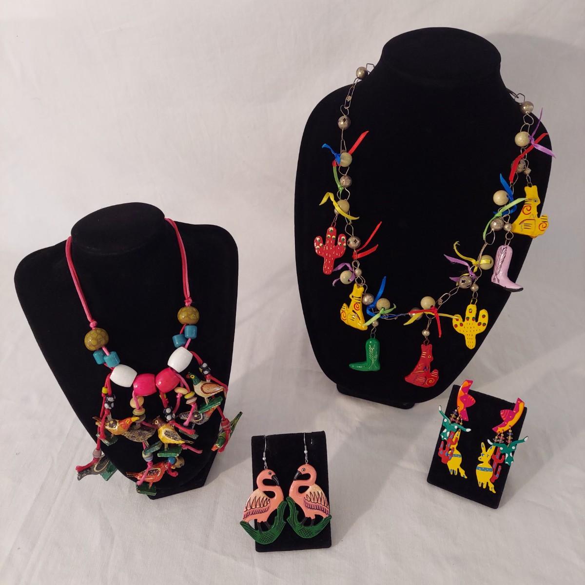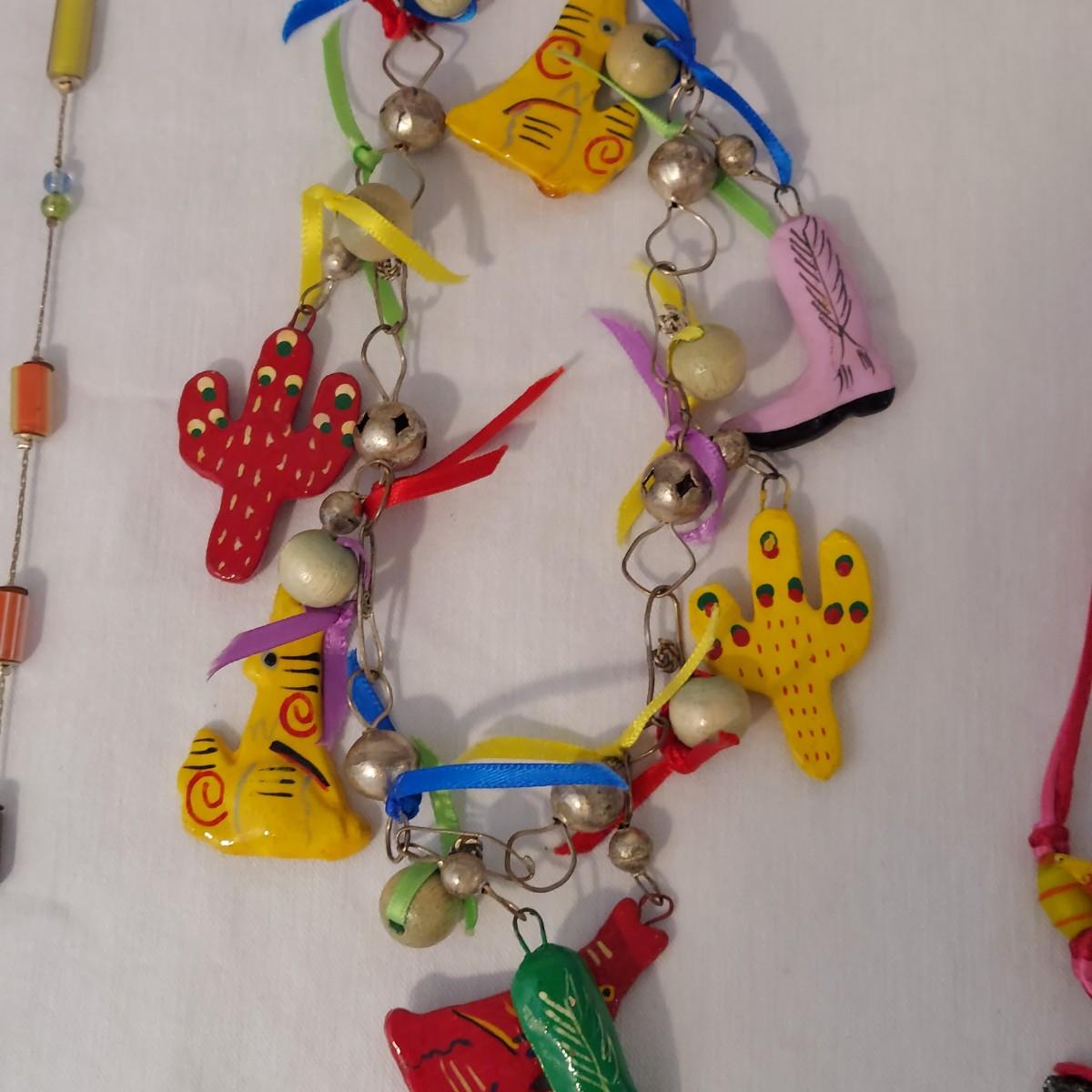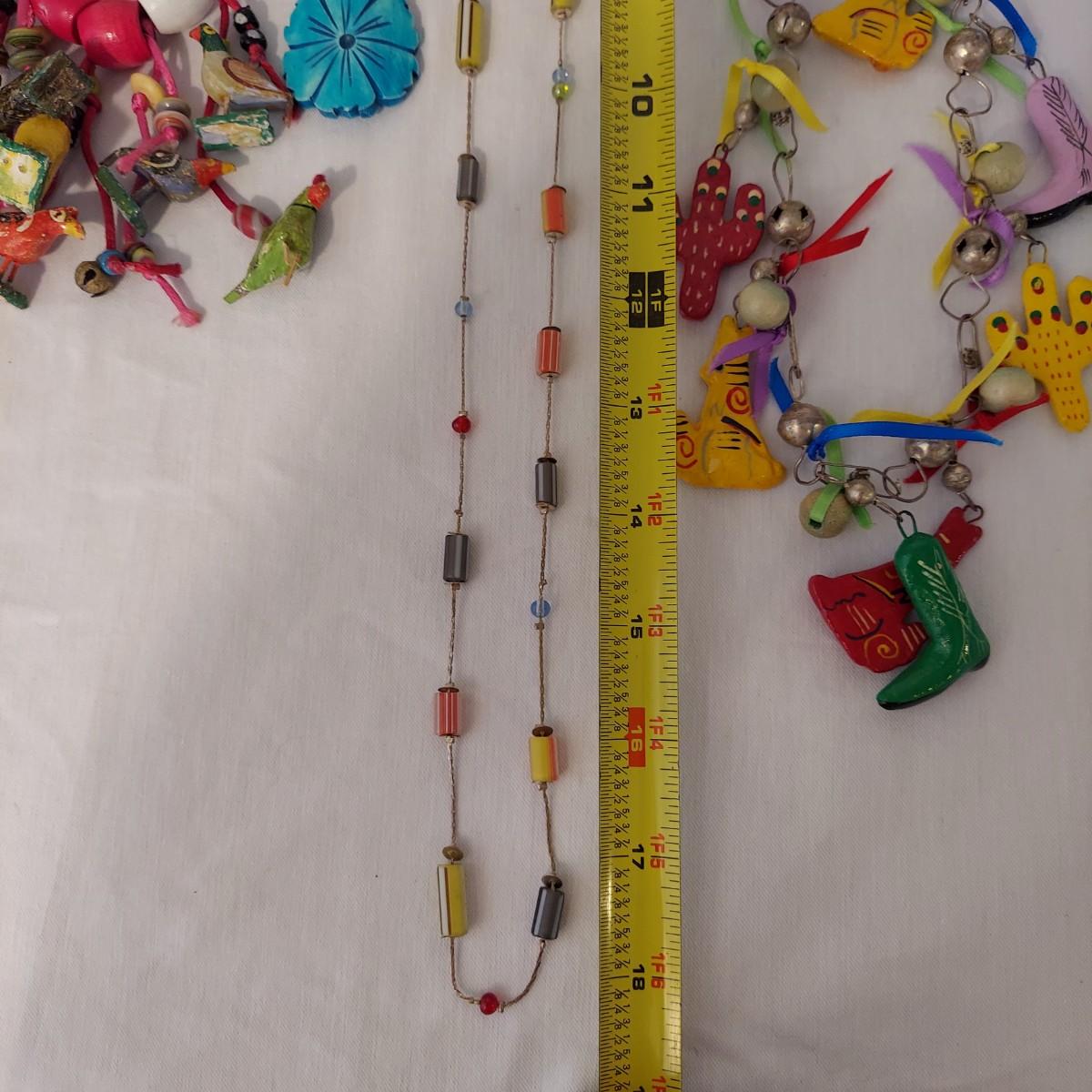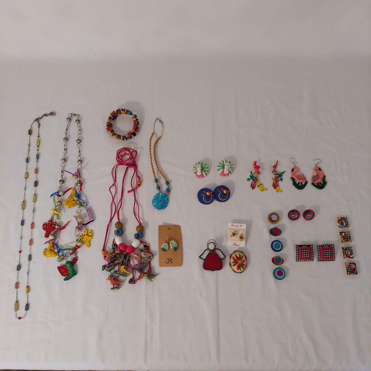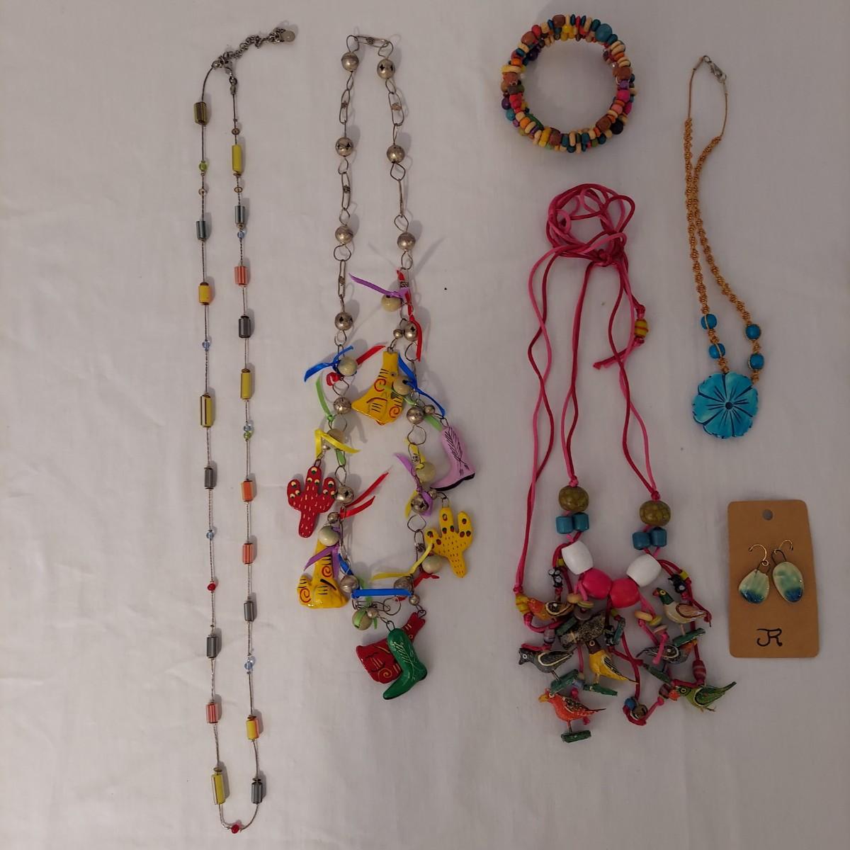 Four necklaces, a beaded bracelet, both clip and pierced earrings, some Christmas pieces and two sets of button covers with matching earrings. The necklaces range from 18-46” long. Please see photos for details. Shipping available. All sales are final. No returns or refunds. Please bid accordingly.