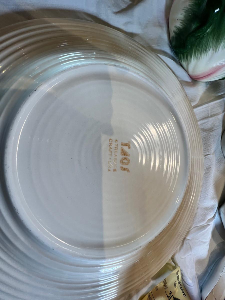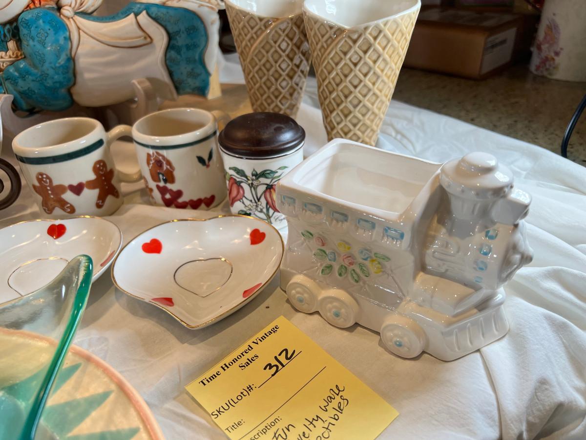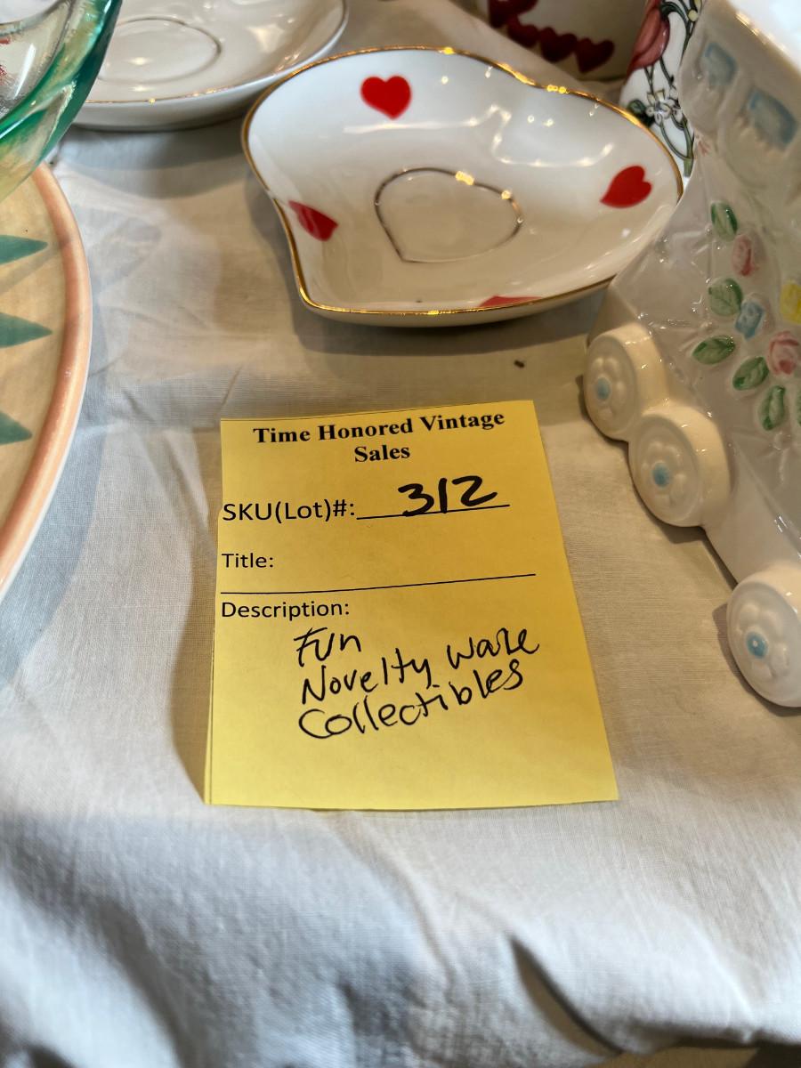 Fun Novelty table ware.. When I packed this lot, the bottom of the box broke. So one ice cream cone is gone, the Harry and David cabbage bowl is also gone,, as well as the flower dish being chipped.All the rest seemed fine...
