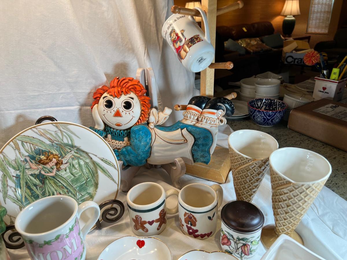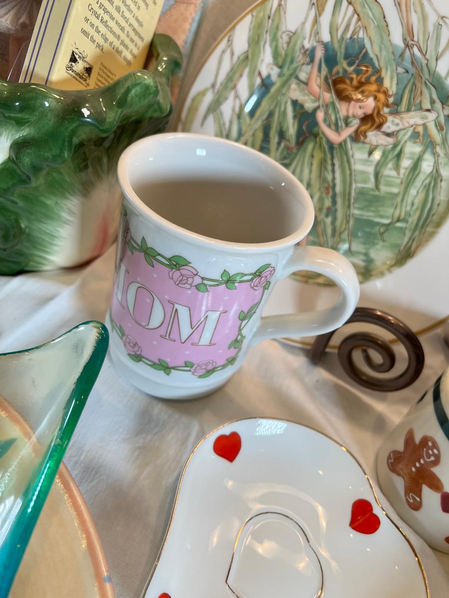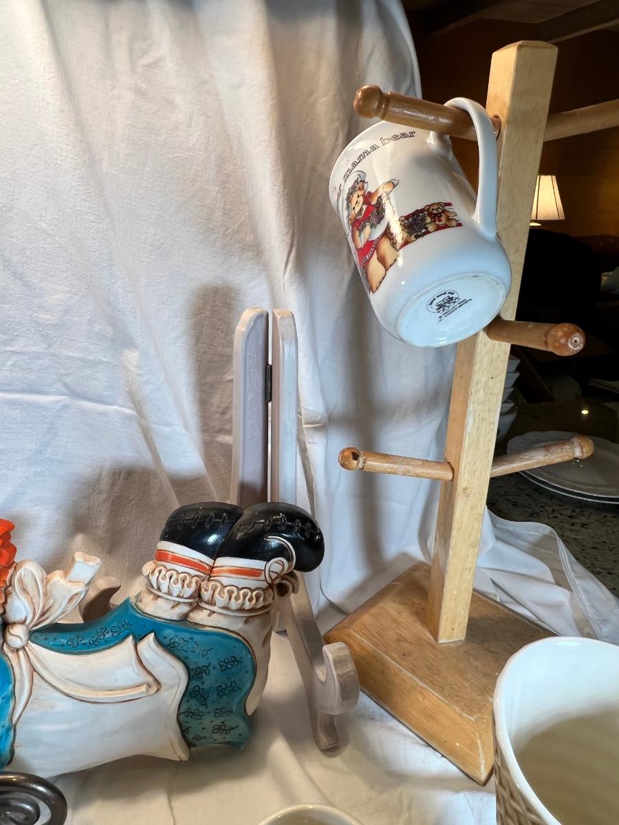 Fun Novelty table ware. Mugs and holder, Mom music box As is