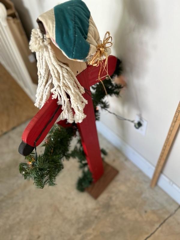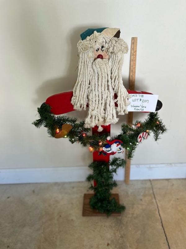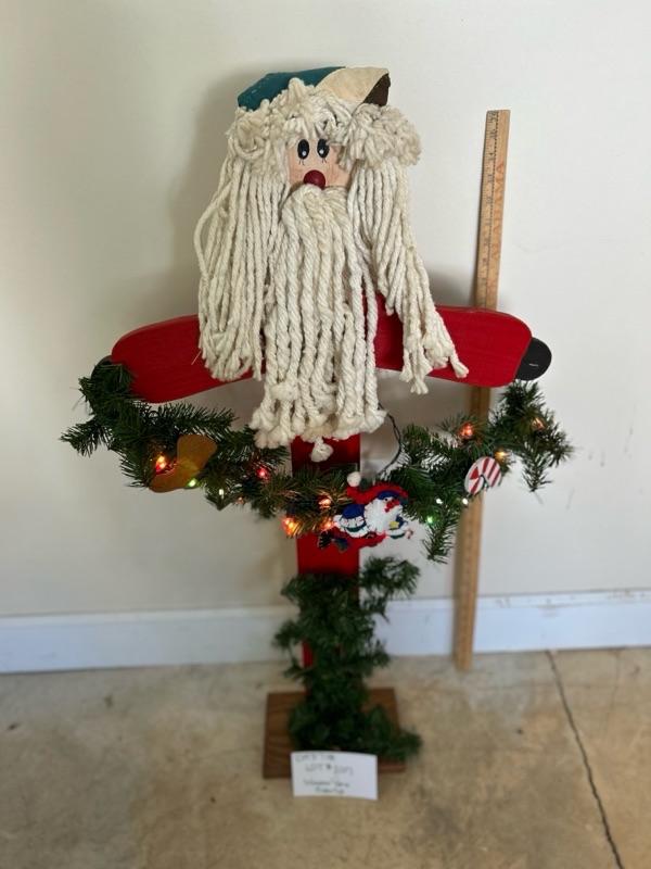 Approx 40" Santa made from Wood & Yarn decorated with Green Garlad