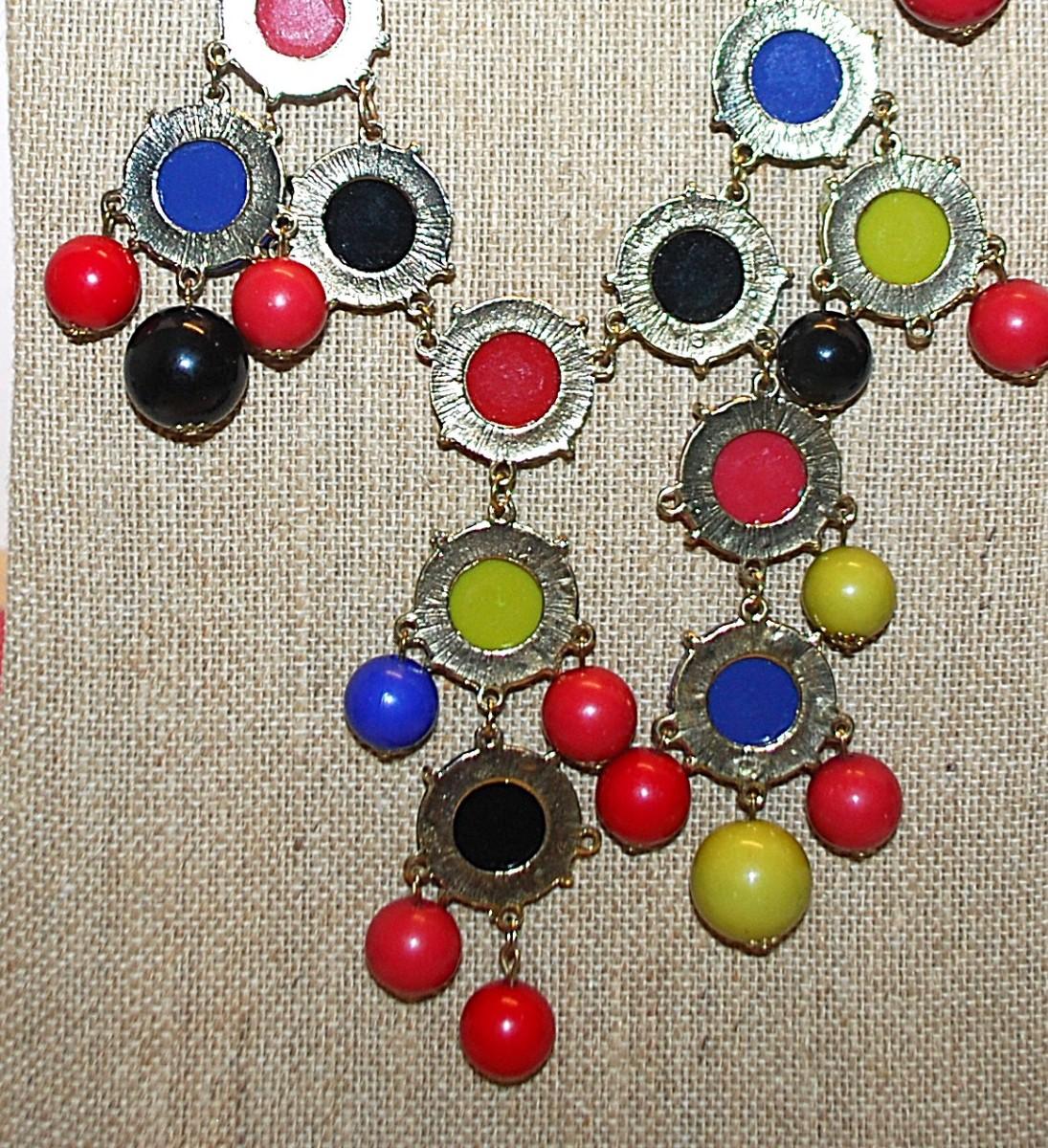 Fun Vintage Colorful NECKLACE with Red, Blue, Yellow & Black Globes and Disks & Lobster Clasp 26" L