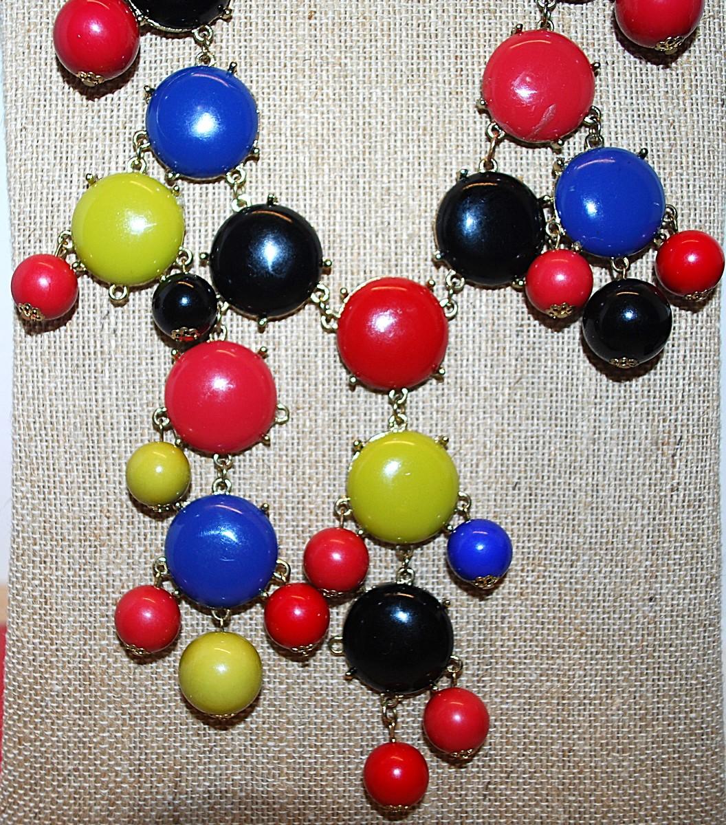 Fun Vintage Colorful NECKLACE with Red, Blue, Yellow & Black Globes and Disks & Lobster Clasp 26" L