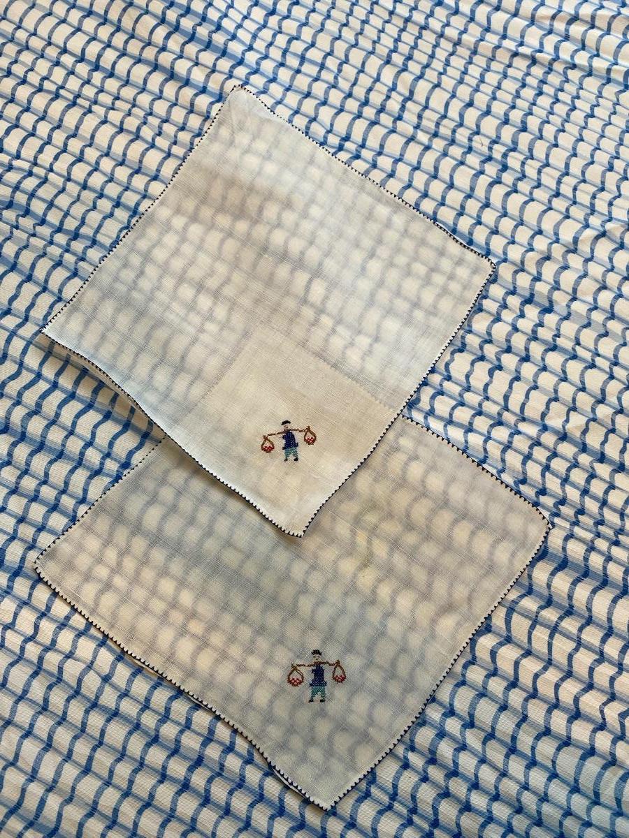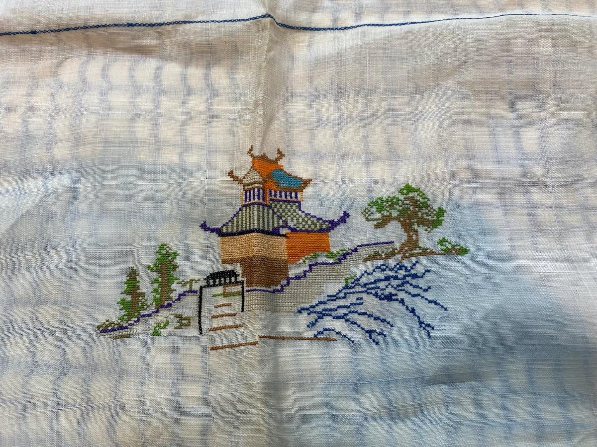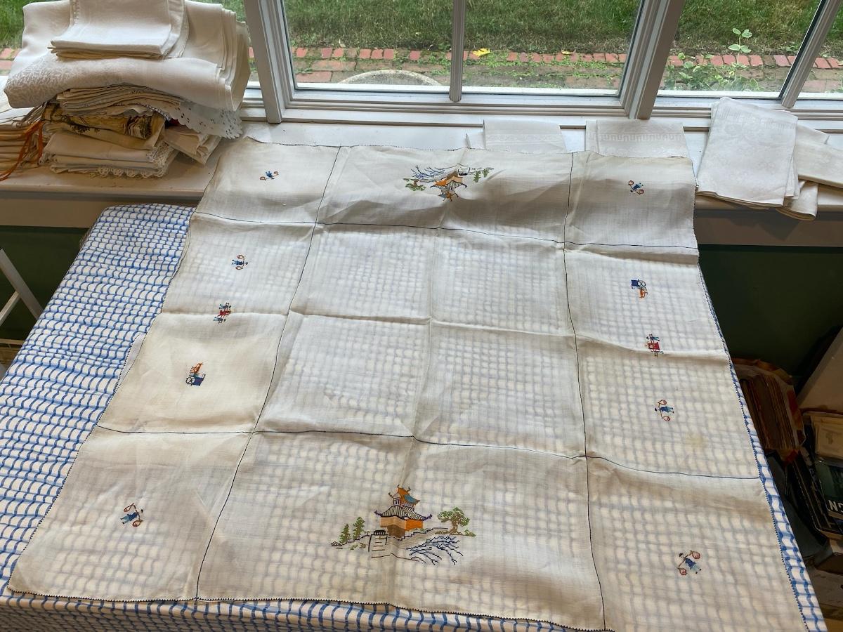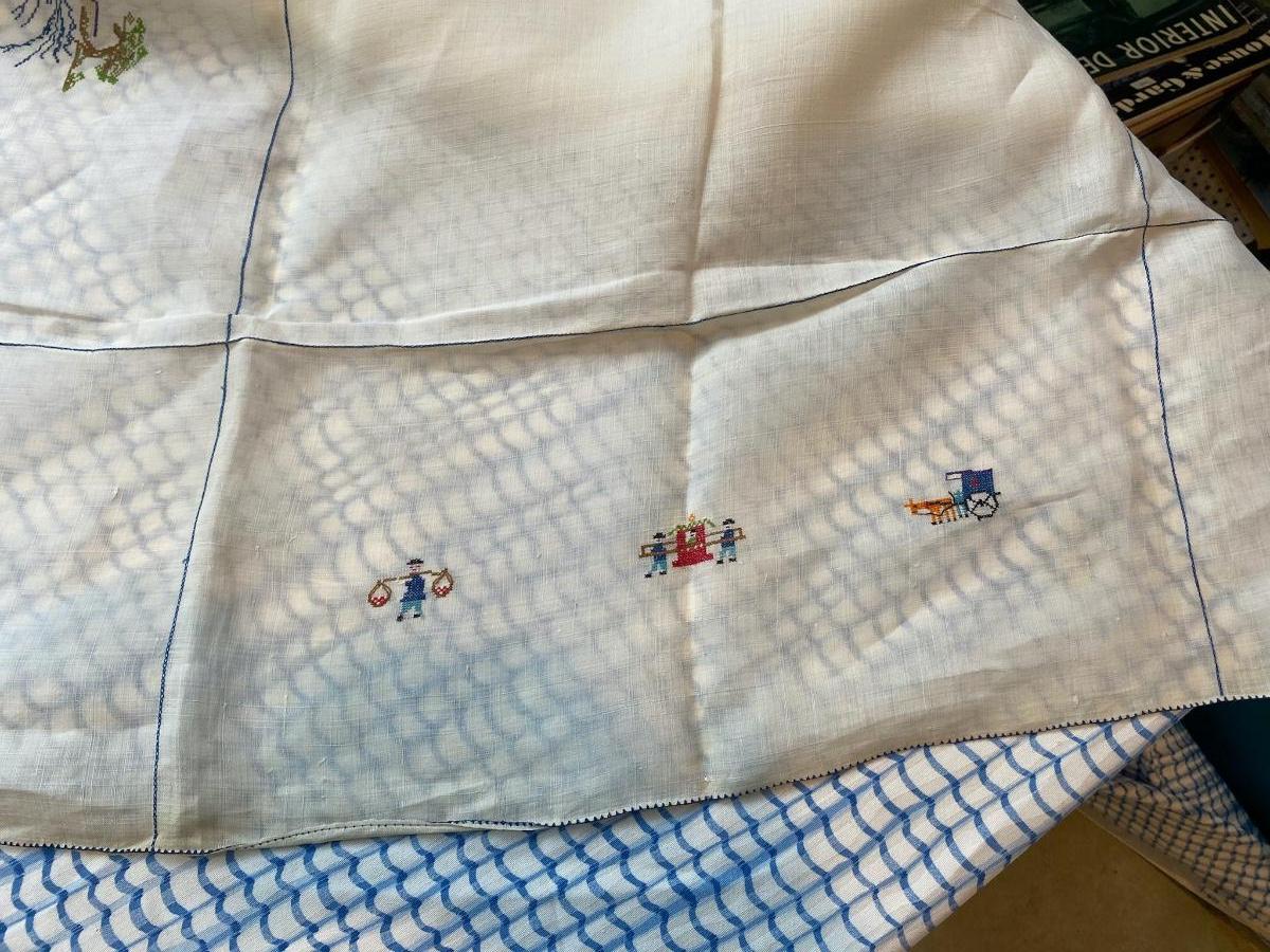 Exquisite fine linen table cloth and 2 napkins hand stitched depicting pleasing scenes of Chinese men and pagodas. The cross stitch work very tiny and perfect. A couple of small stains, could a dip in oxy clean. Napkins 8 1/2 X 8 1/2, table cloth 35" X 35"