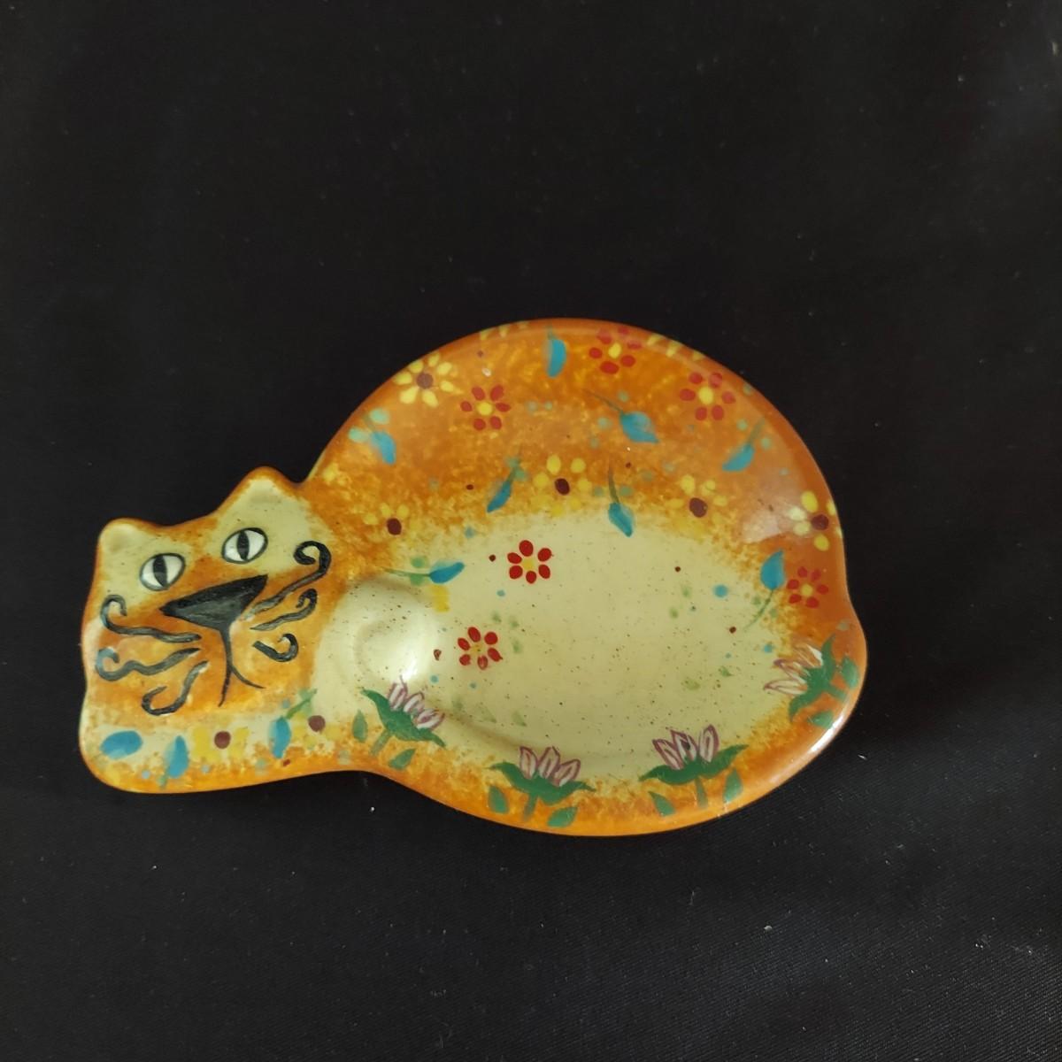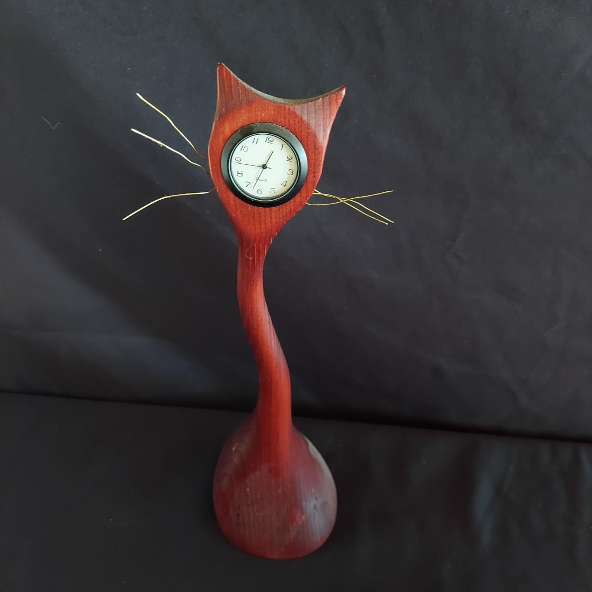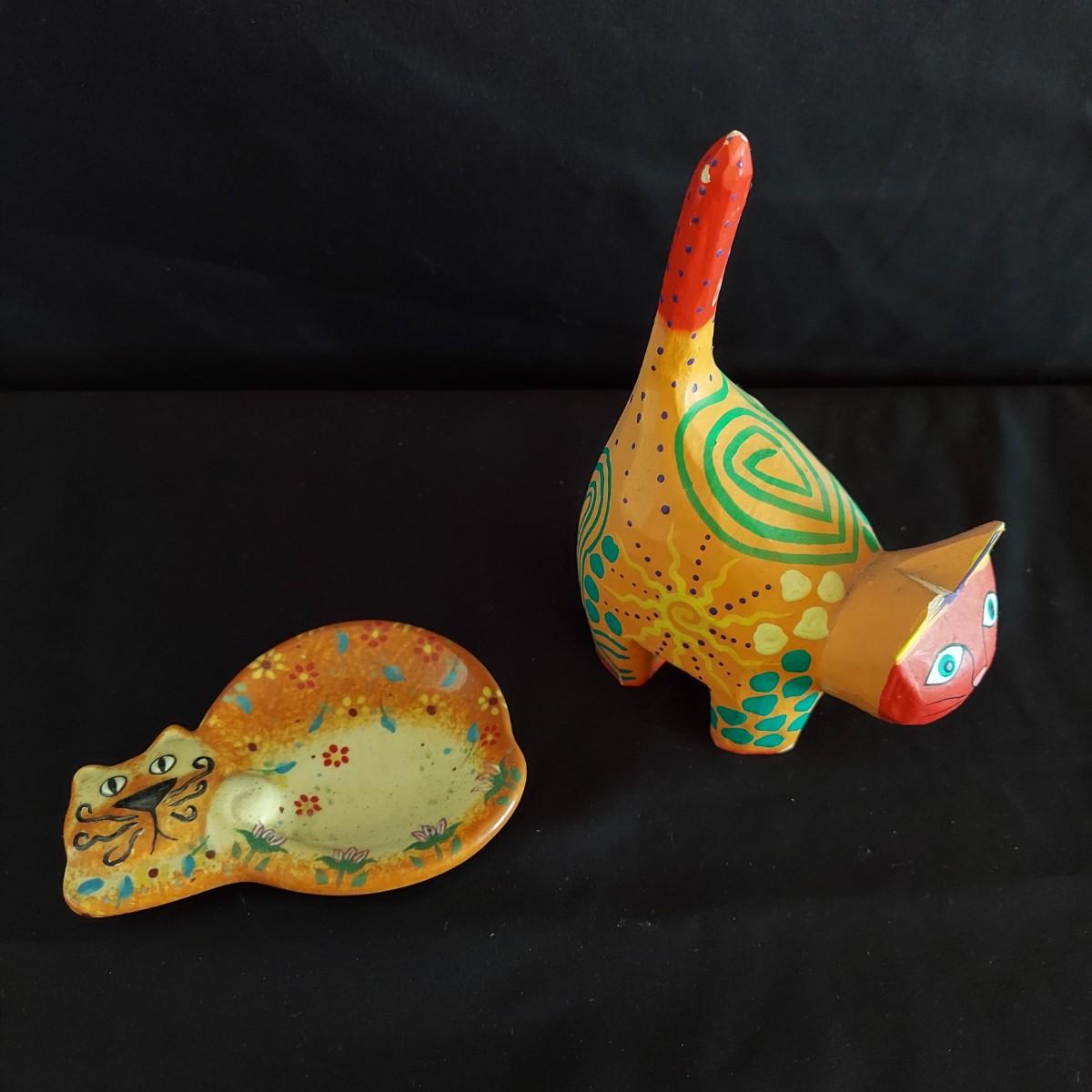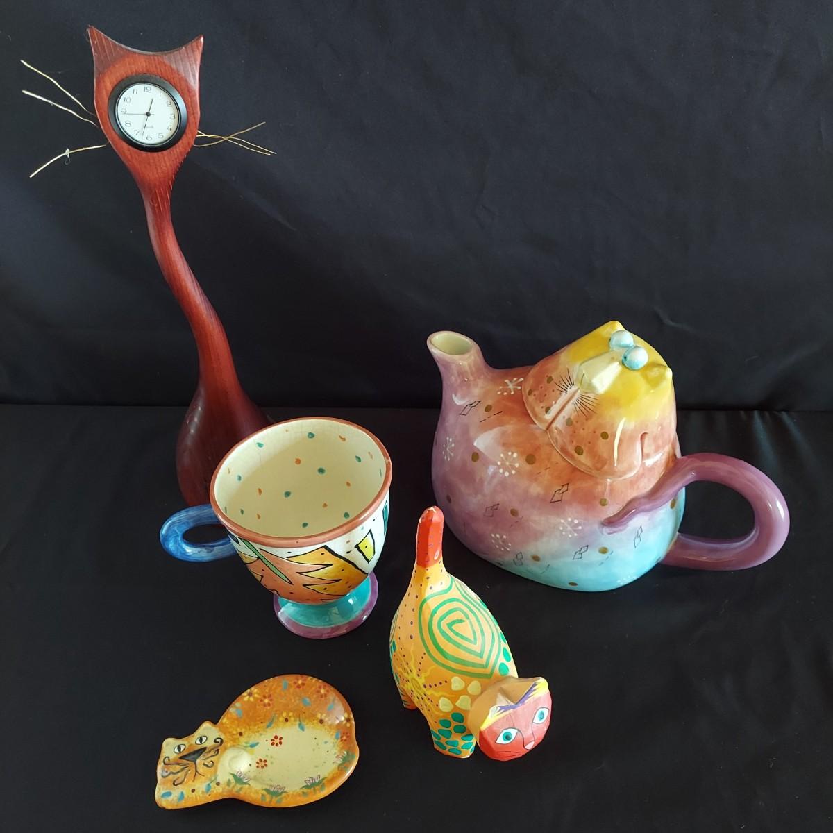 Funky ceramic cat teapot and abstract signed mug. Signed hand-carved wooden cat table clock that's approximately 12.5" tall. Also a wooden Mexican folk art style wooden cat and ceramic cat ring dish. Shipping available