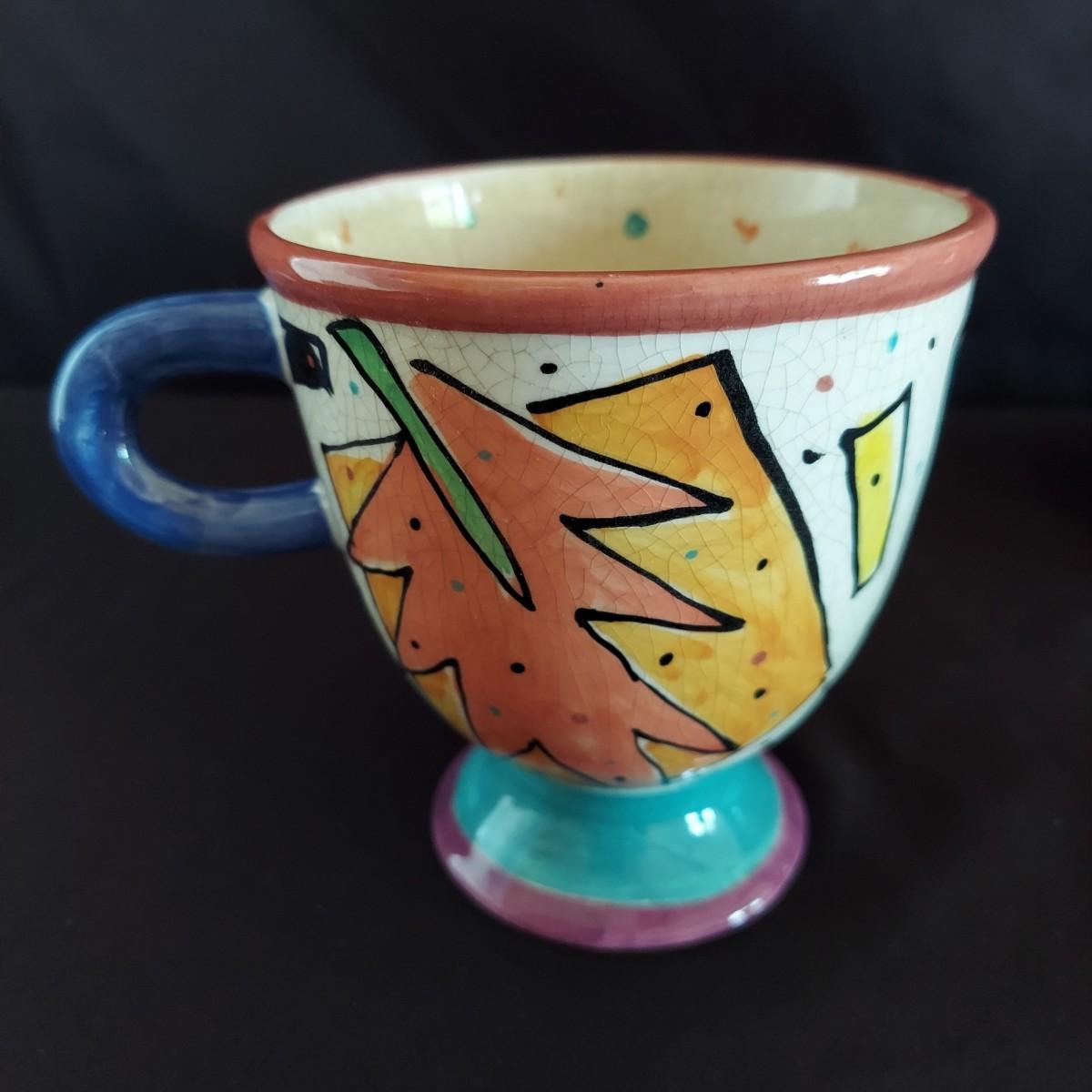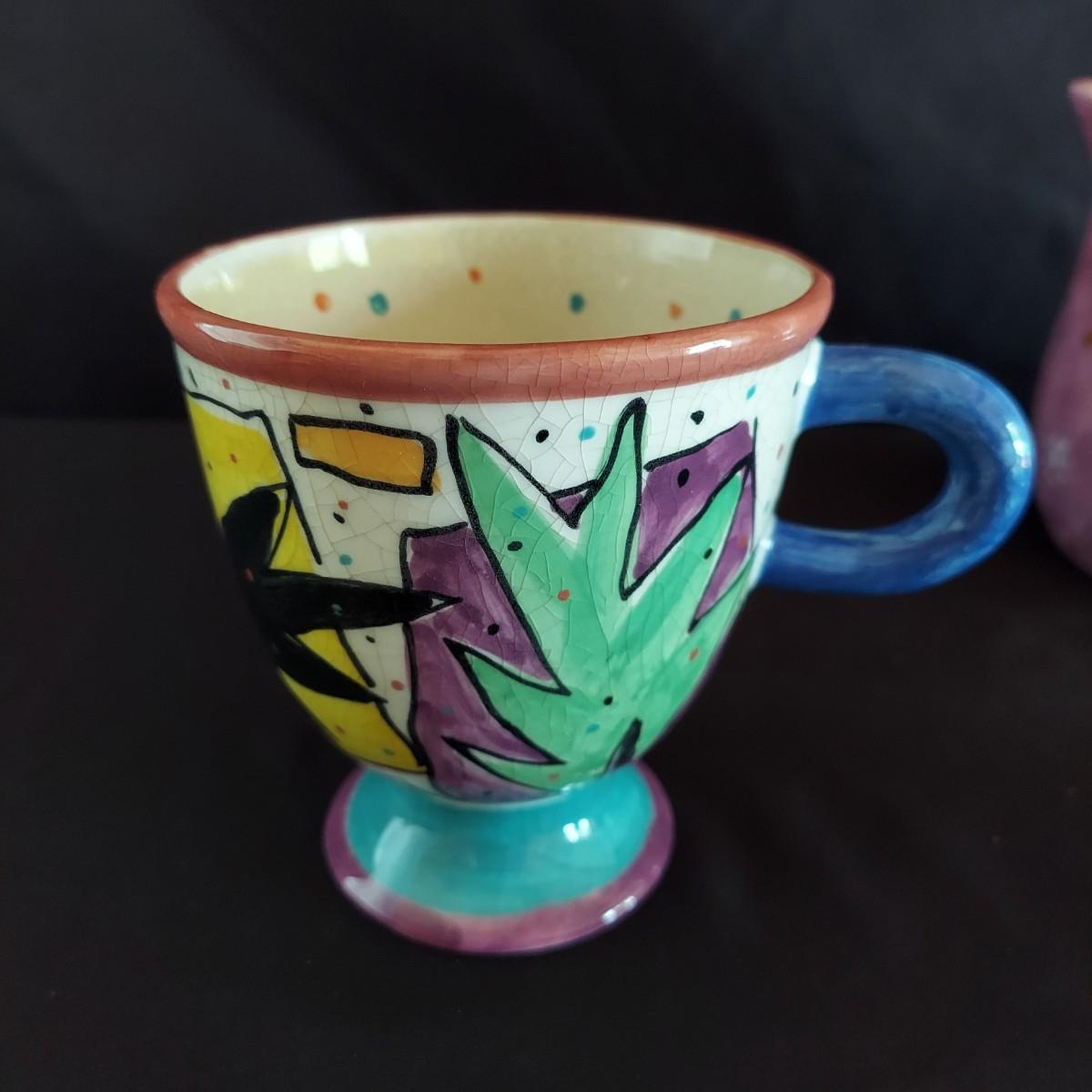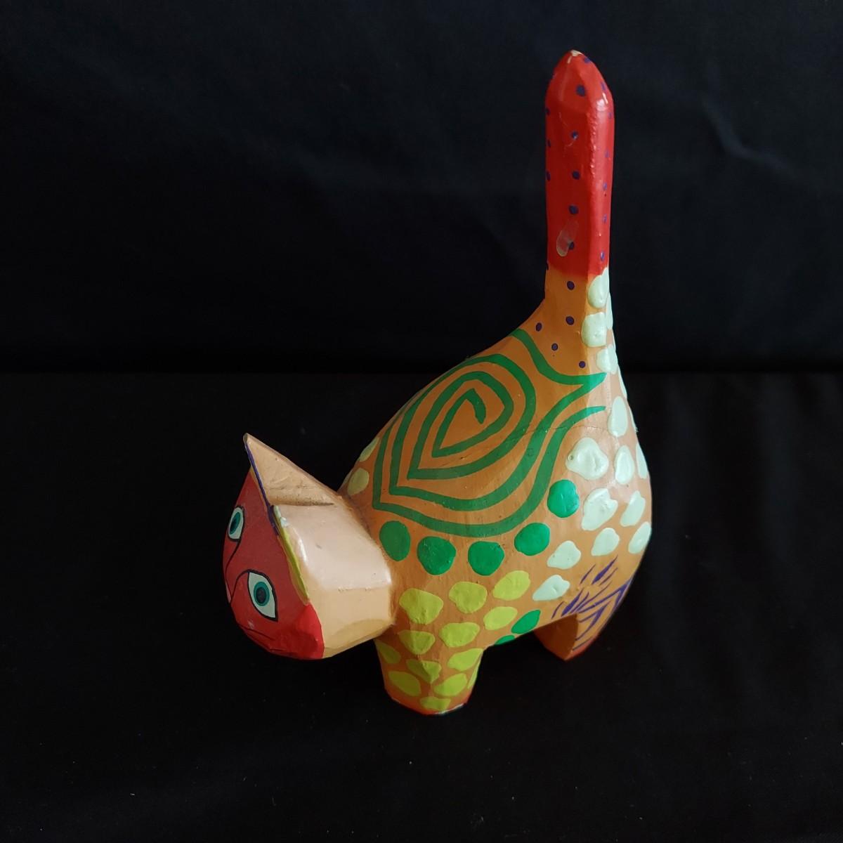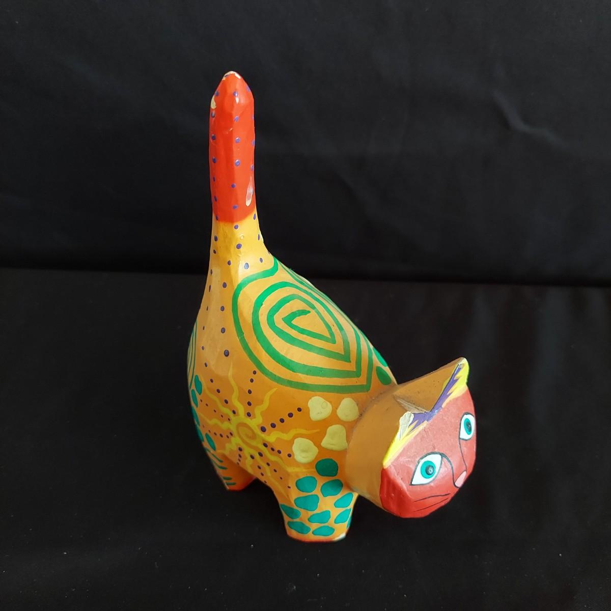 Funky ceramic cat teapot and abstract signed mug. Signed hand-carved wooden cat table clock that's approximately 12.5" tall. Also a wooden Mexican folk art style wooden cat and ceramic cat ring dish. Shipping available