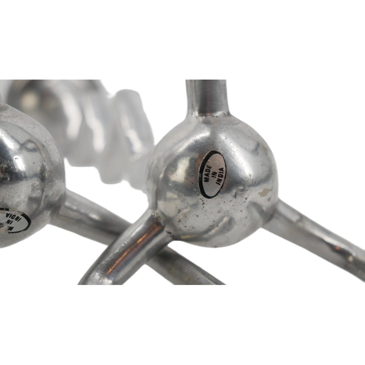 Pair of funky, zig zag, biomorphic modernist candlesticks. Aluminum metal pieces made in India. Each measures 5" x 13.5" and 12 oz. No issues found.