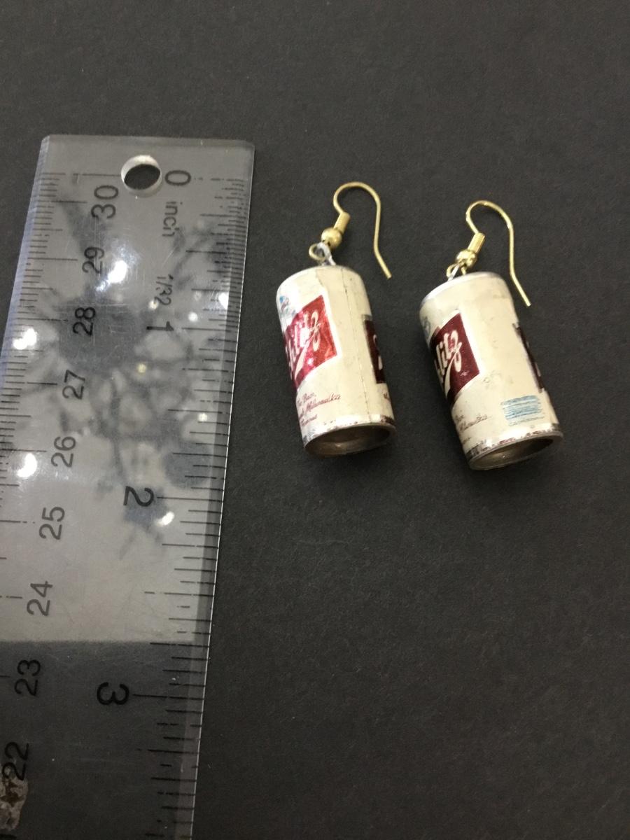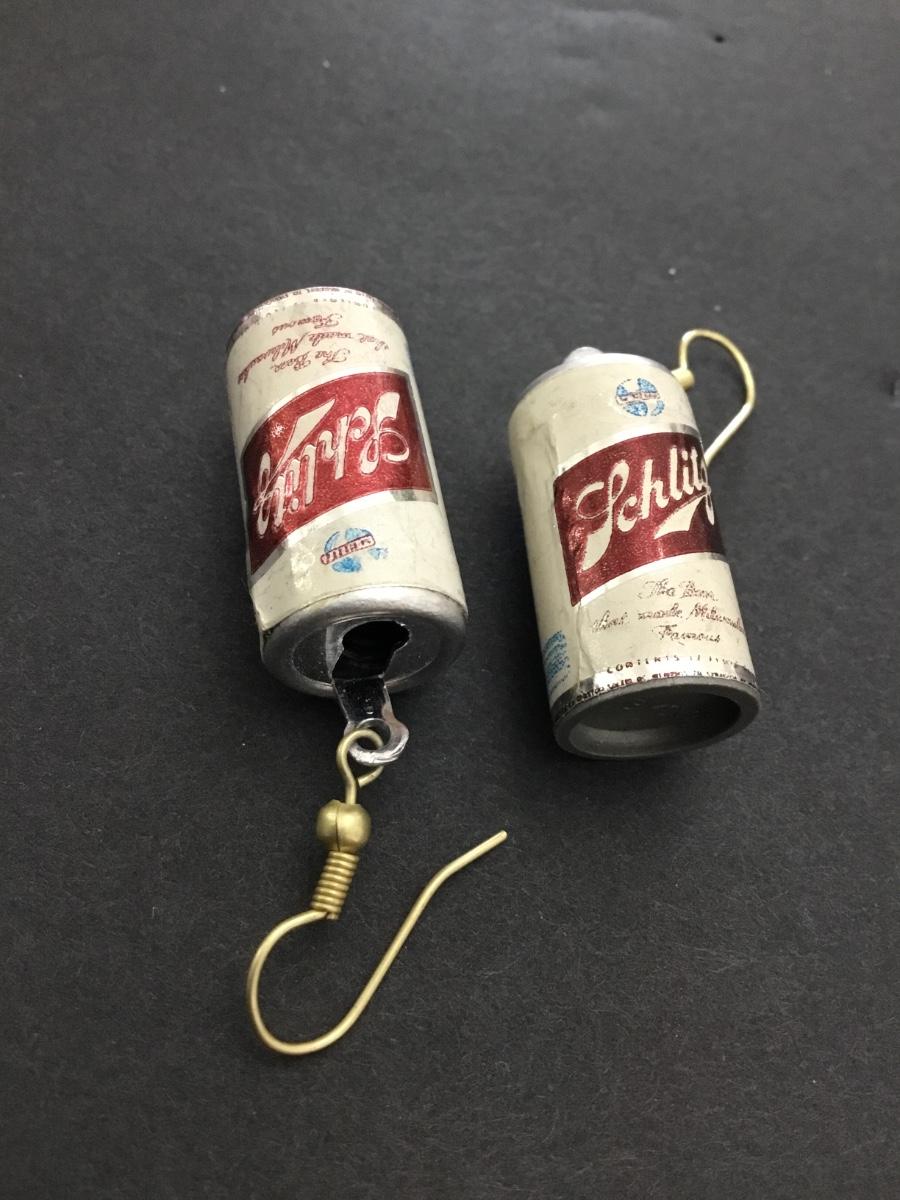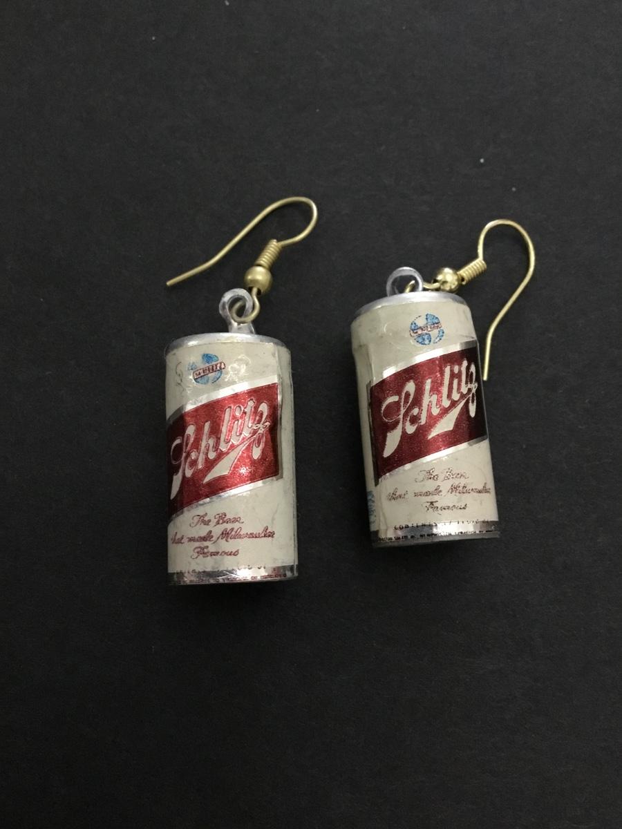 Funky, retro, vintage, Schlitz, beer can earrings, fun, punk bar, drink, novelty, charm, jewelry