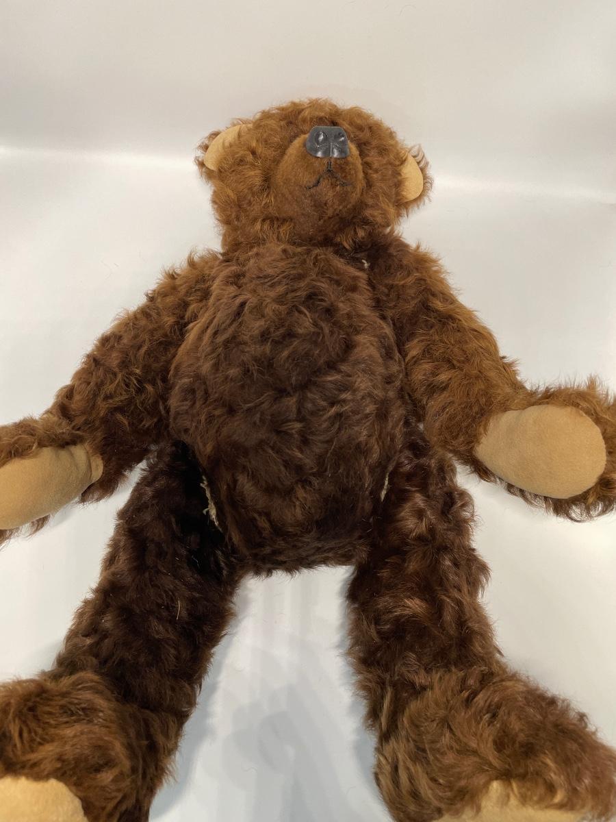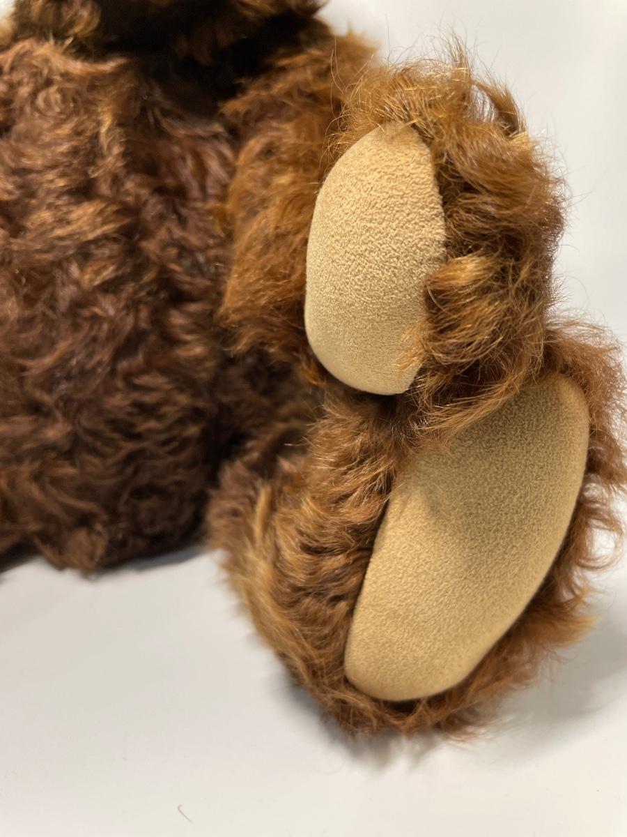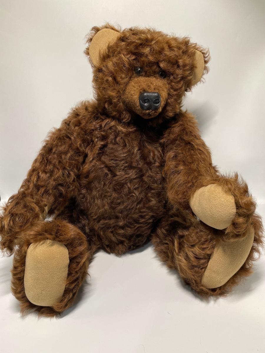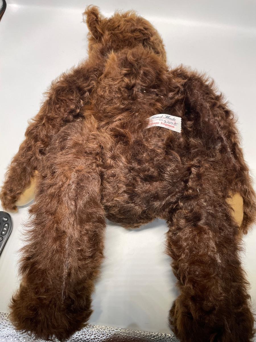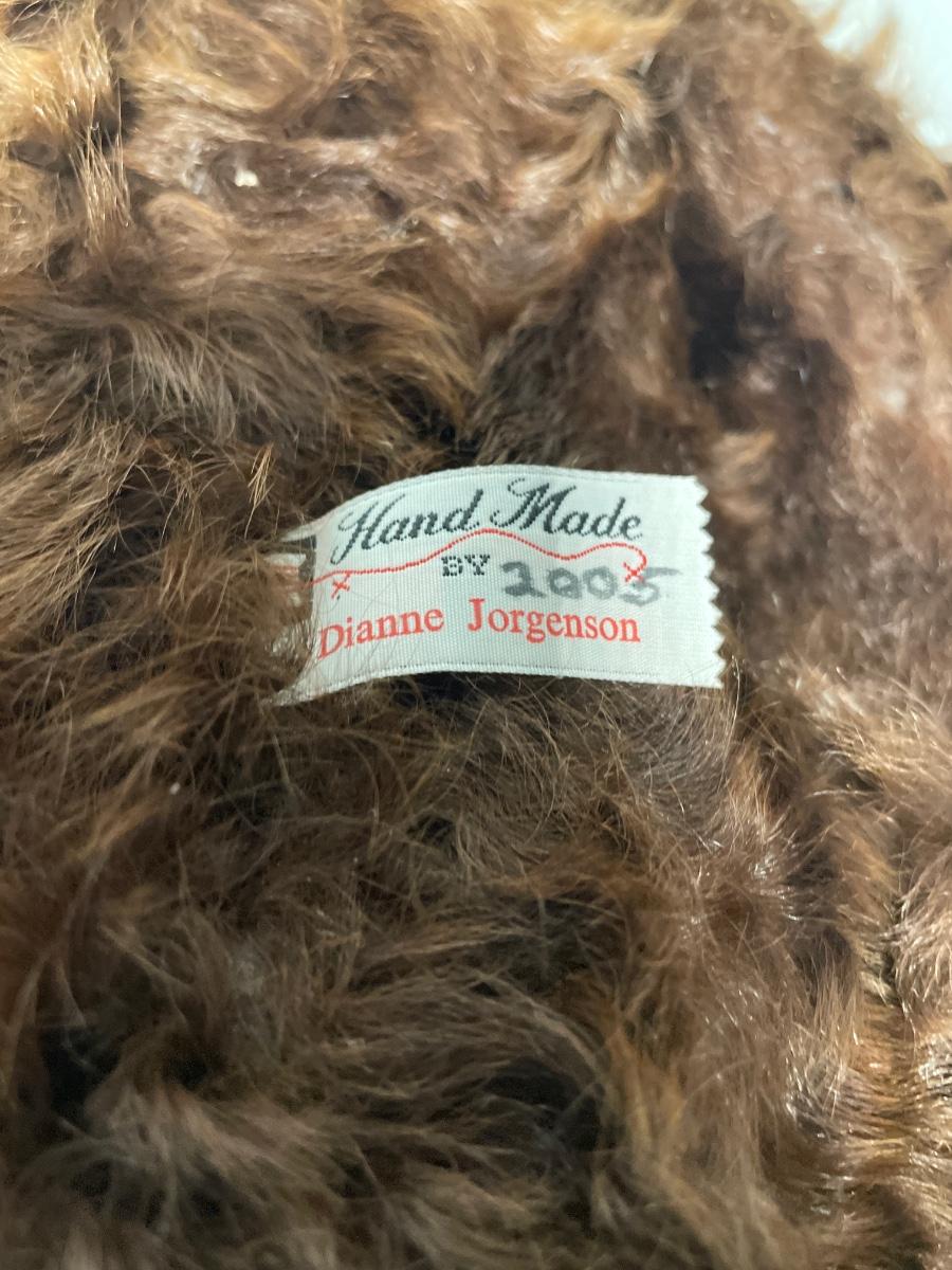 Approx 19” tall. Glass eyes, suede paw footpads, Angora? Made by Dianne Jorgenson.