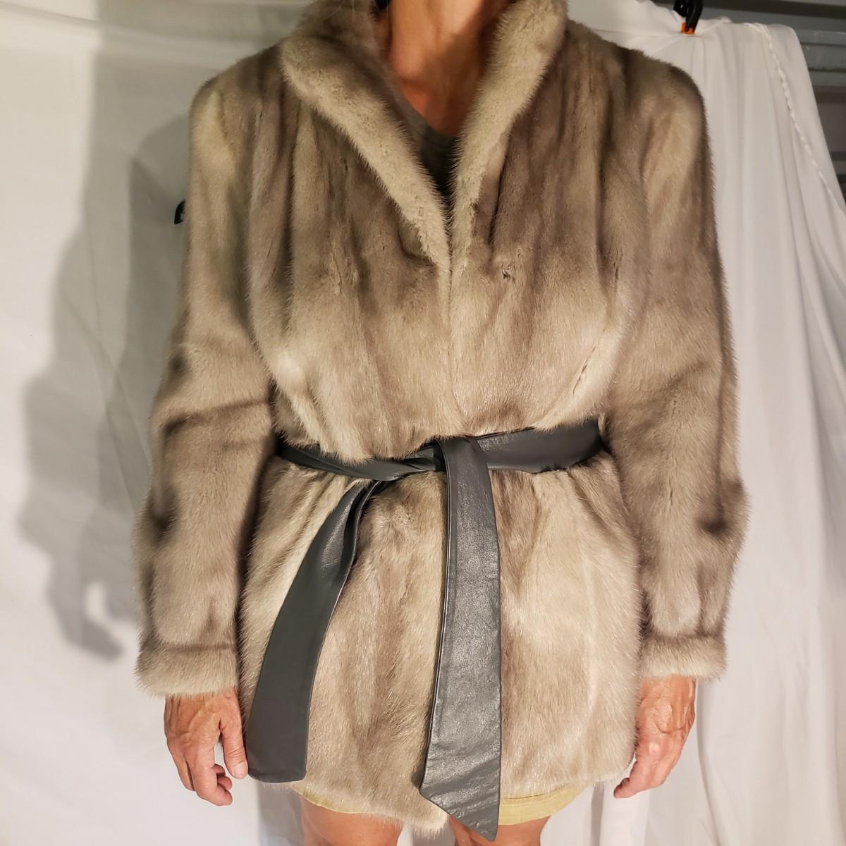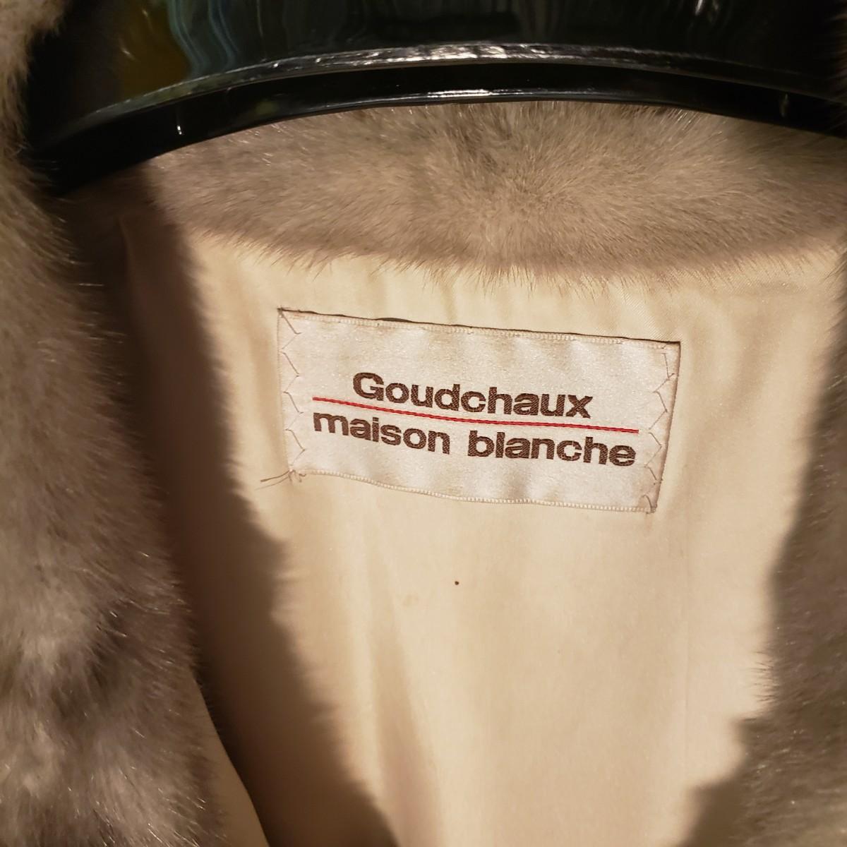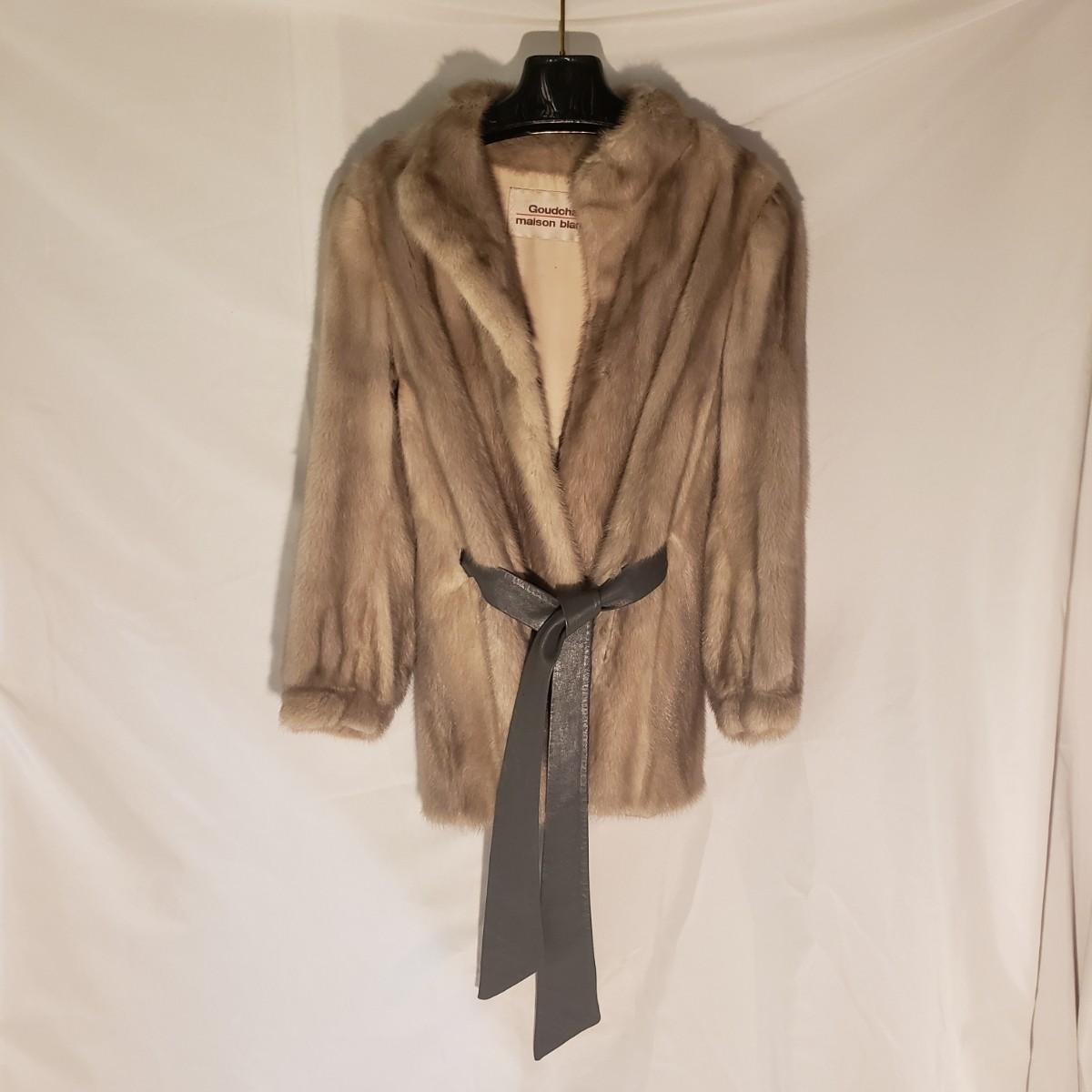 Fur Coat by Goudchaux. Although there is no tag for the size, it is about a medium. There is a hook and eye in the middle and a grey leather belt to tie it together. It does have two pockets. Measures approximately 19" across the shoulders, 16" at the waist and 31" in length Shipping available.