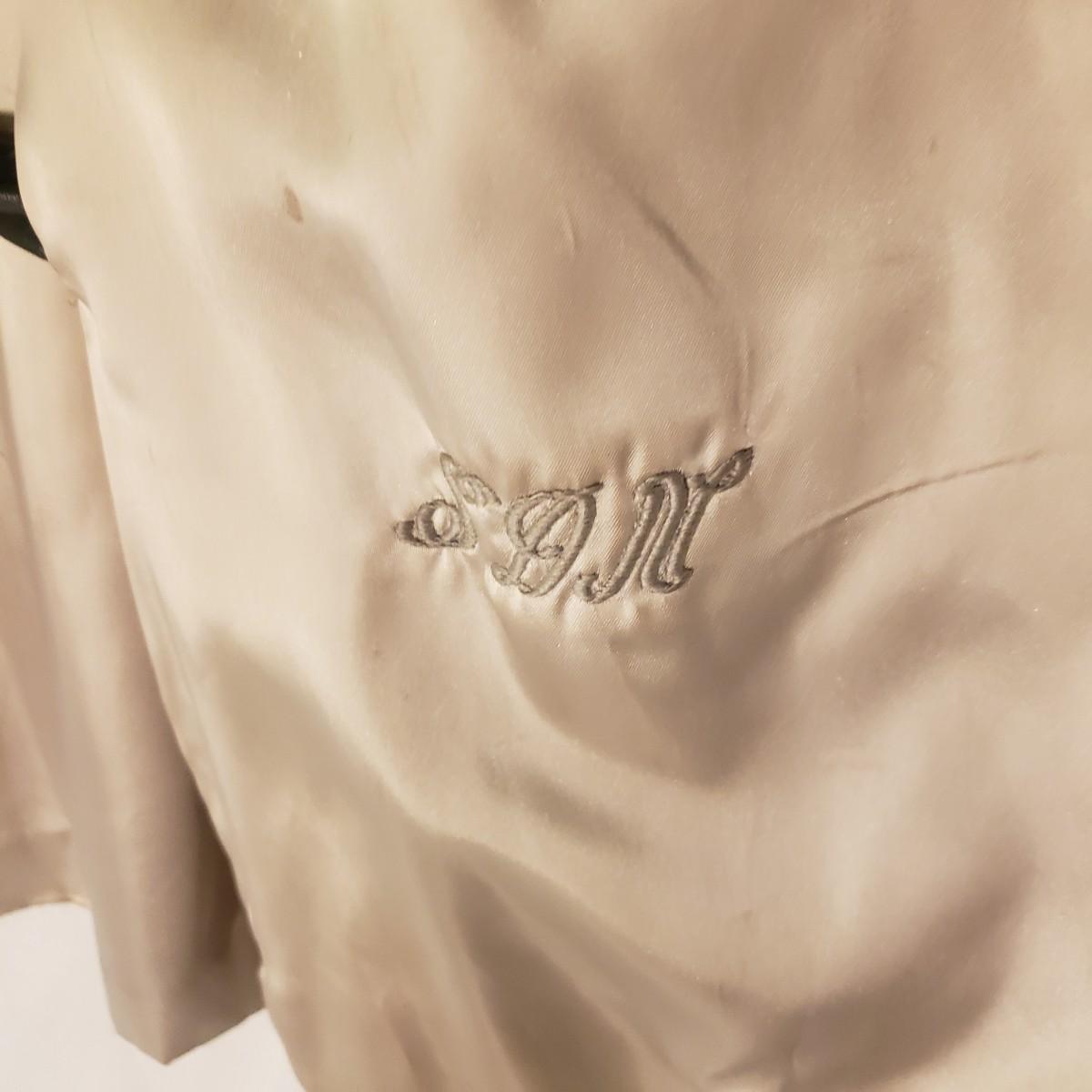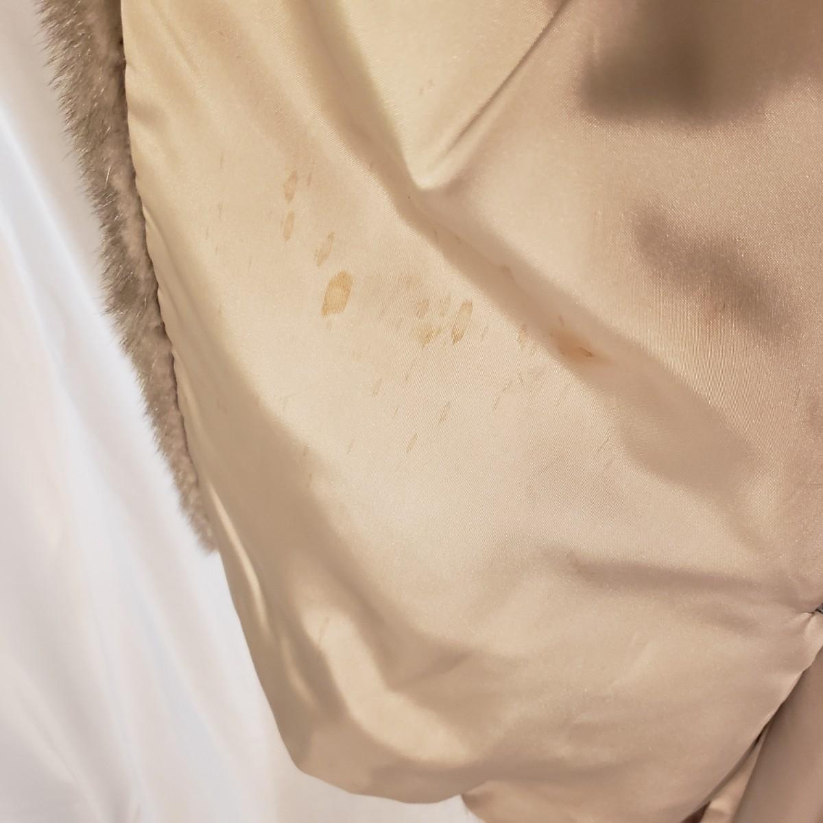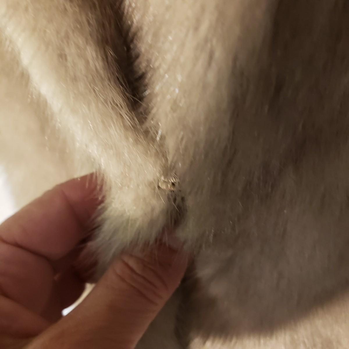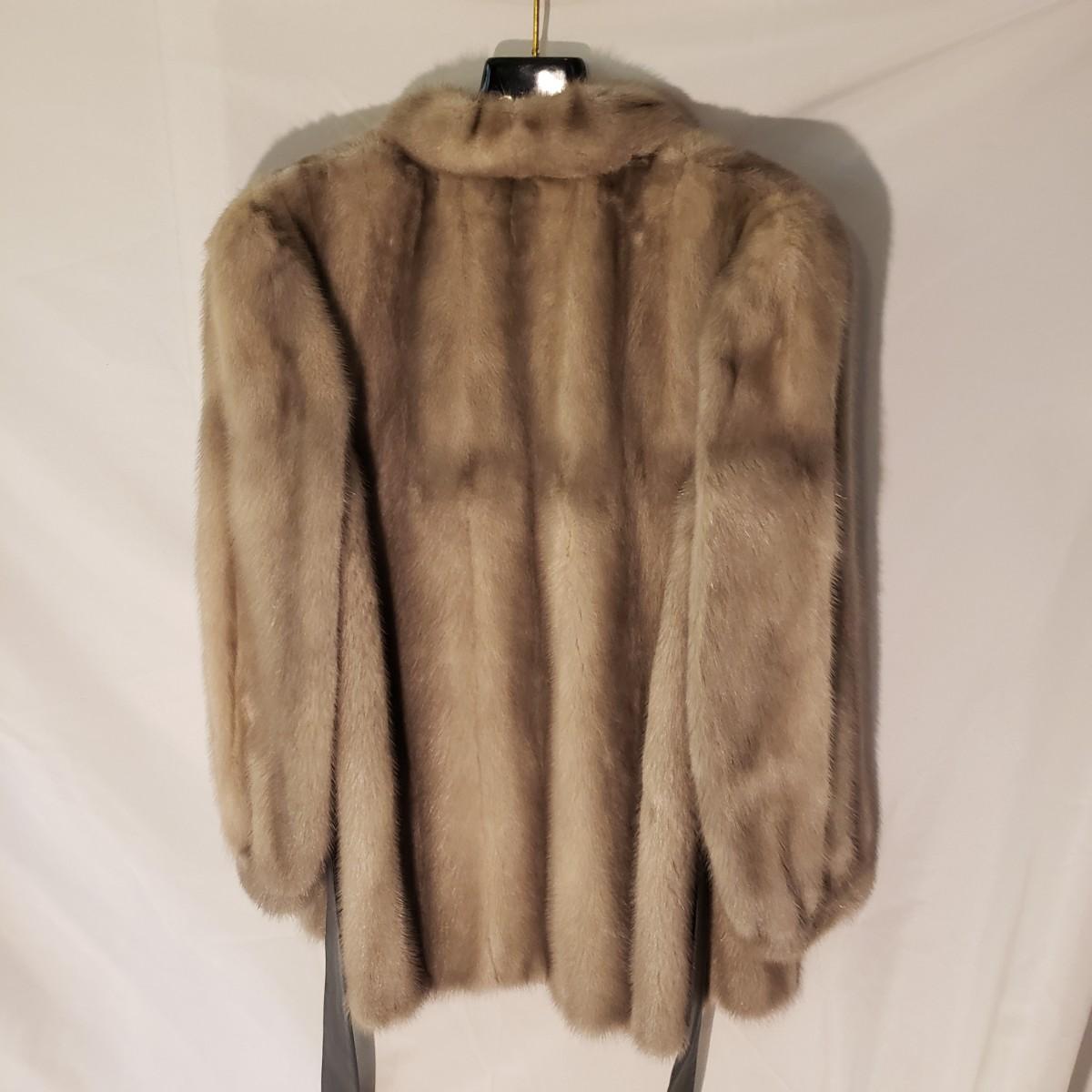 Fur Coat by Goudchaux. Although there is no tag for the size, it is about a medium. There is a hook and eye in the middle and a grey leather belt to tie it together. It does have two pockets. Measures approximately 19" across the shoulders, 16" at the waist and 31" in length Shipping available.