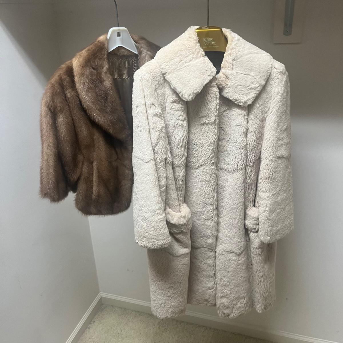 Lot includes a cream colored fur coat by D. Davis of St Louis and a brown colored fur coat by J.P. Allen of Atlanta. Size is between M-L.